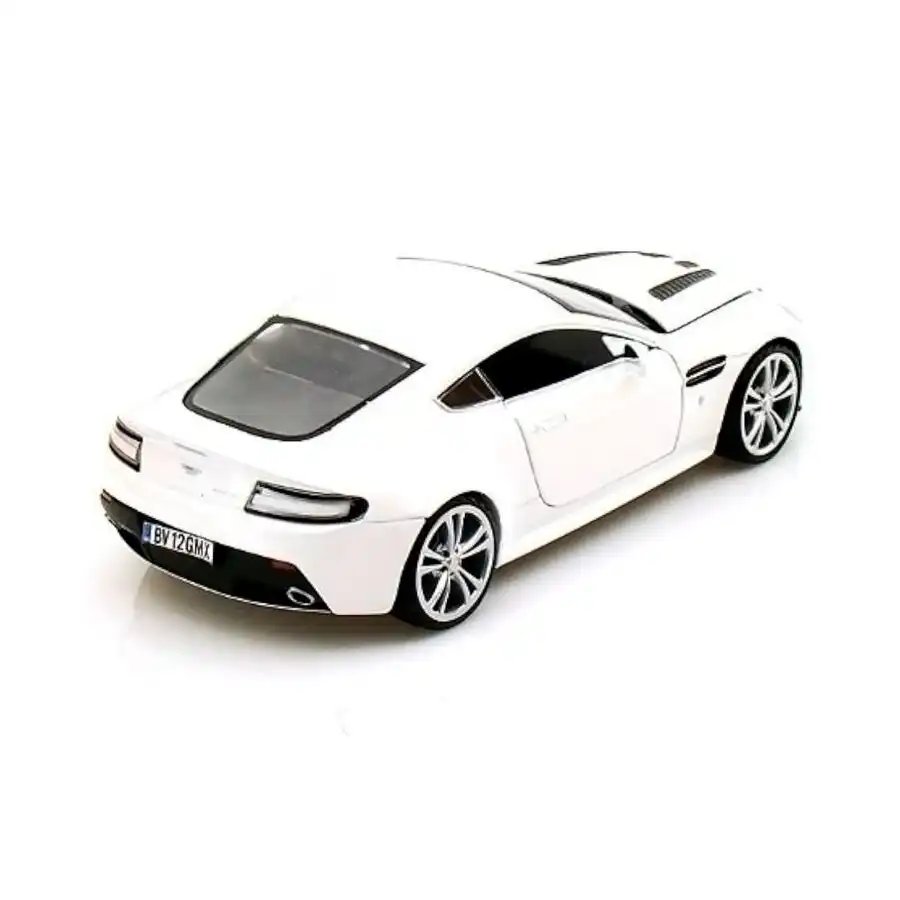 Aston Martin V12 Vantage color blanco hecho por la marca Motor Max. Este modelo de auto a escala fabricado en alta calidad tiene puertas que se abren, llantas de goma y es perfecto para coleccionistas y fanáticos de la marca Aston Martin.