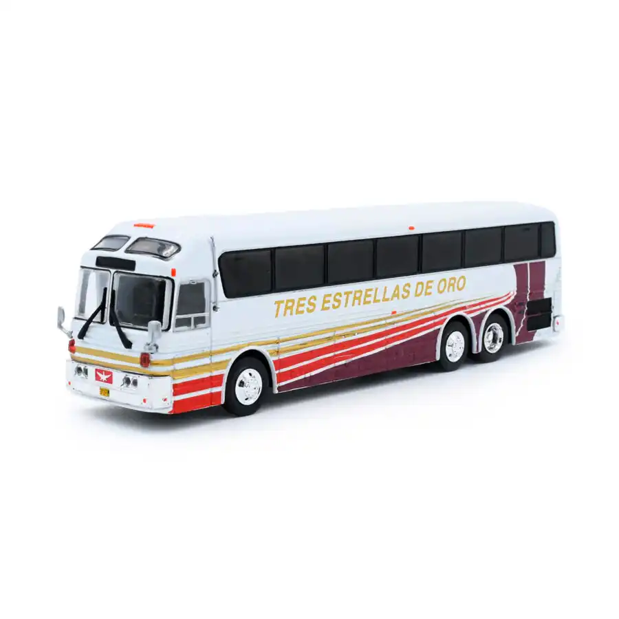 Autobús 3 Estrellas de Oro Eagle a Escala 1/87 de Edición Limitada a 504 piezas mundiales, hecho por la marca Iconic Replicas. Este modelo de bus a escala fabricado en alta calidad tiene llantas de goma, cuerpo de metal y es perfecto para coleccionistas y fanáticos de la marca Eagle.