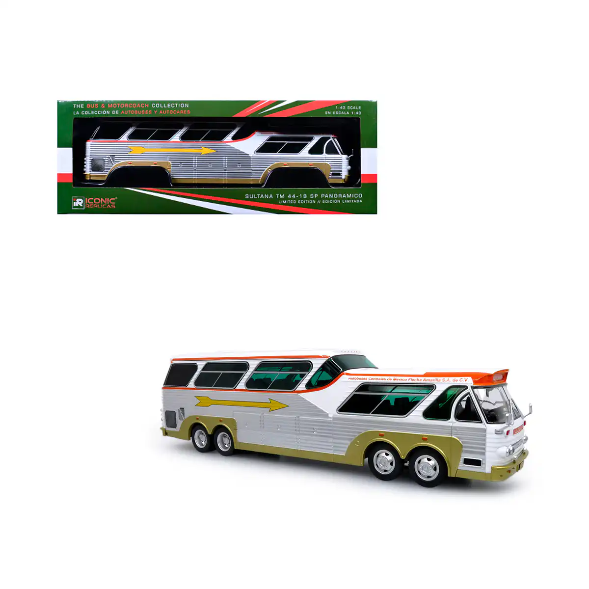 Autobús Sultana Panoramico SP TM de Edición Especial «Flecha Amarilla» hecho por la marca Iconic Replicas. Este modelo de bus a escala fabricado en alta calidad tiene llantas de goma, cuerpo de metal y es perfecto para coleccionistas y fanáticos de los autobuses Sultana.
