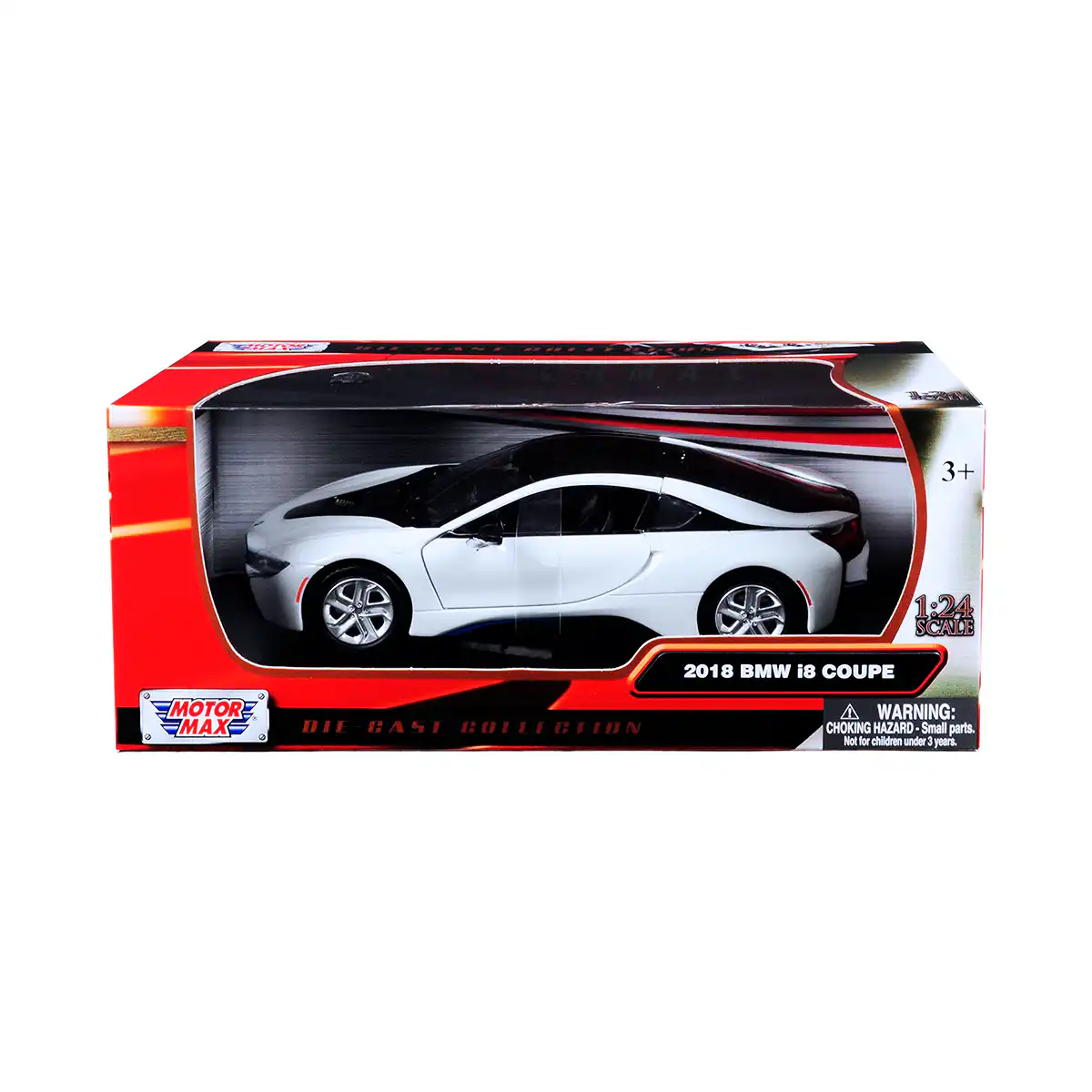 BMW i8 Coupe 2018 color blanco hecho por la marca Motor Max. Este modelo de auto a escala fabricado en alta calidad tiene puertas que se abren, llantas de goma y es perfecto para coleccionistas y fanáticos de la marca BMW.