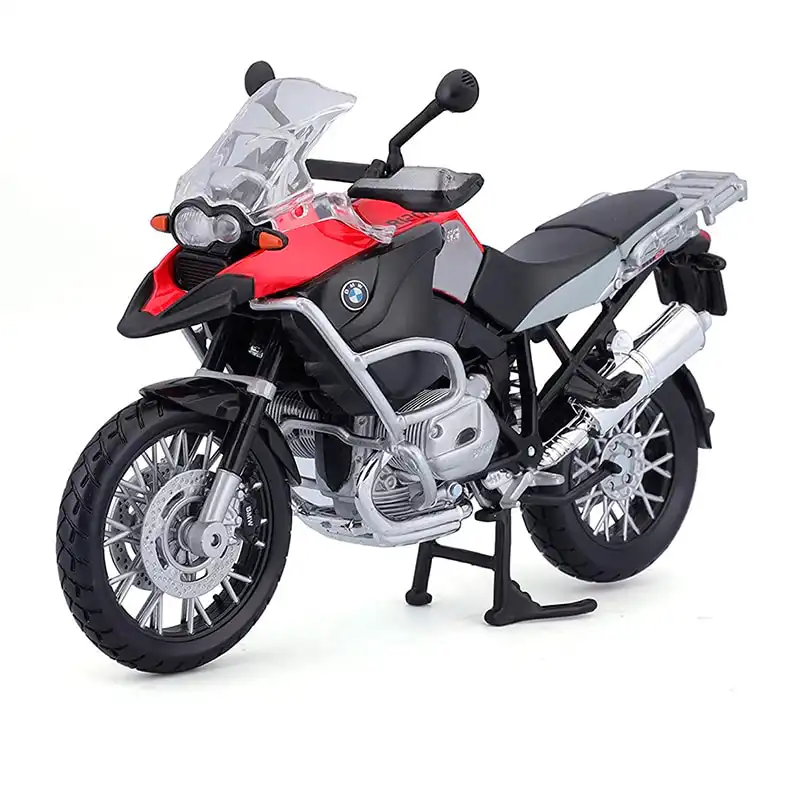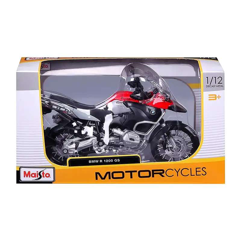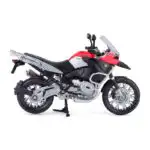 BMW R 1200 GS en color rojo hecho por la marca Maisto. Este modelo de motocicleta a escala fabricada en alta calidad tiene llantas de goma, perfecta para coleccionistas y fanáticos de BMW.