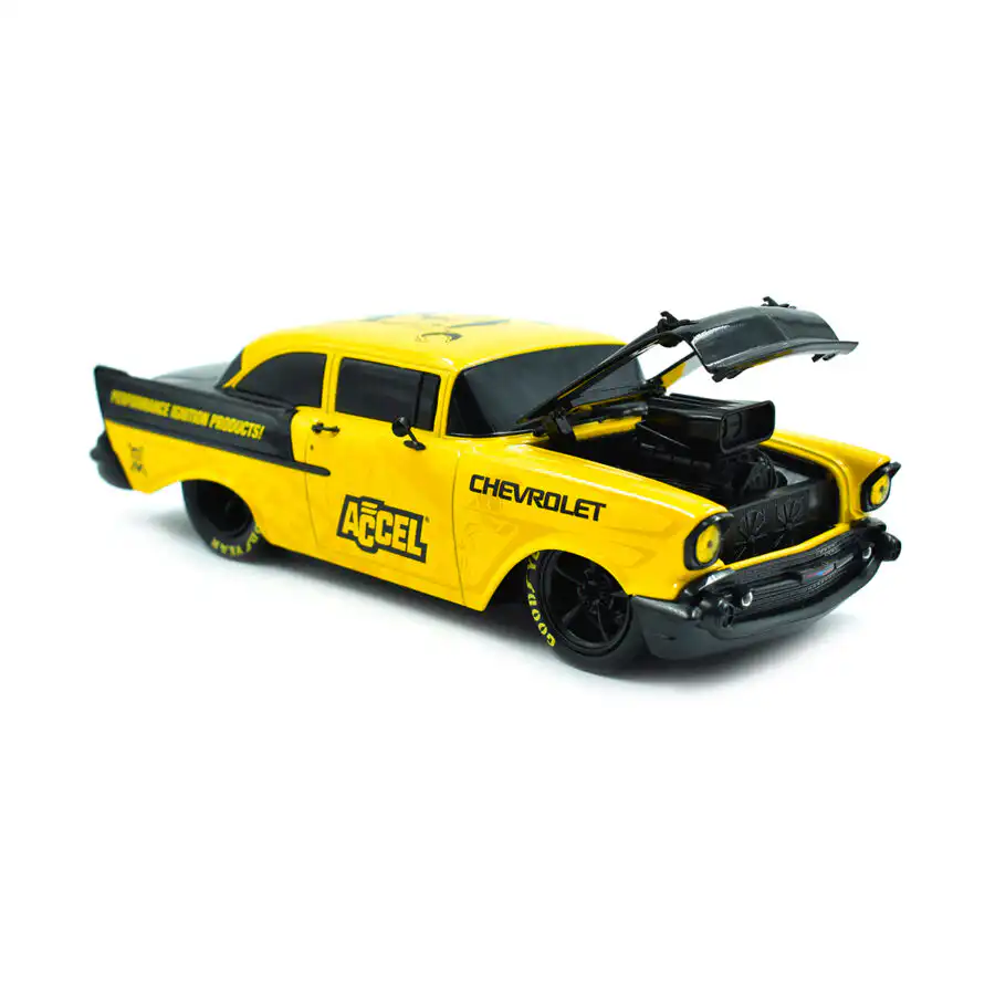 Chevy 210 Hardtop 1957 de Edición Especial “ACCEL Performance” hecho por la marca M2 Machines. Este modelo de auto a escala fabricado en alta calidad tiene cofre que se abre, llantas de goma y es perfecto para coleccionistas y fanáticos de la marca Chevrolet.