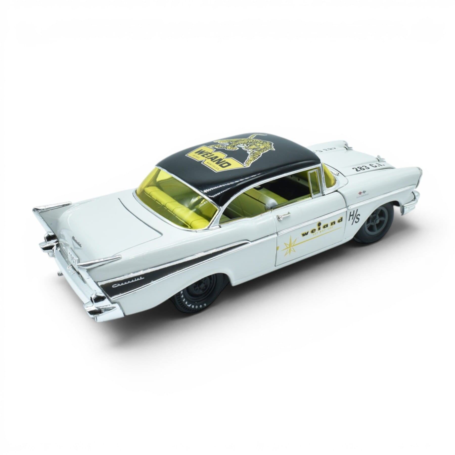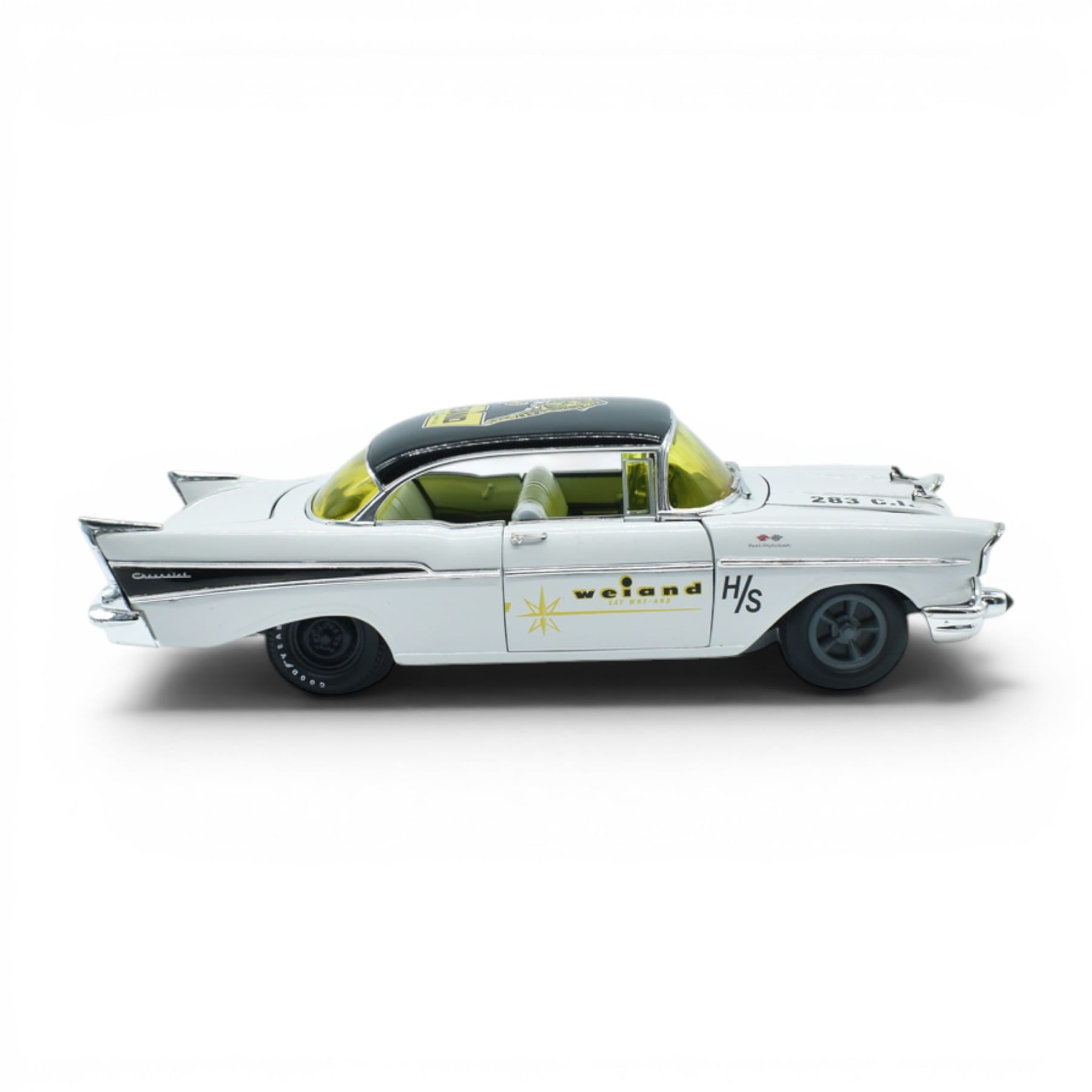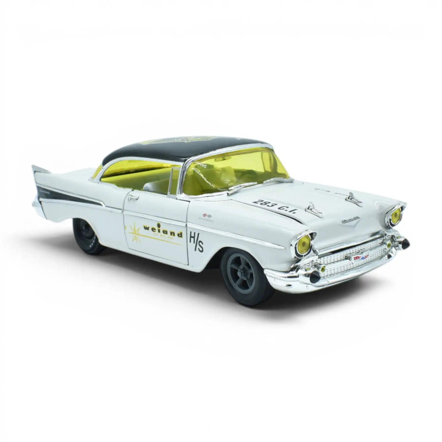 El Chevrolet 210 Hardtop 1957 Blanco M2 Machines 1/24 captura la identidad del original en una pieza de colección pensada para coleccionistas que aprecian los detalles. En escala 1/24, su presencia es inmediata: puertas, cofre y cajuela se abren, silueta limpia y un acabado que se percibe a primera vista. Parte de la serie Weiand.
