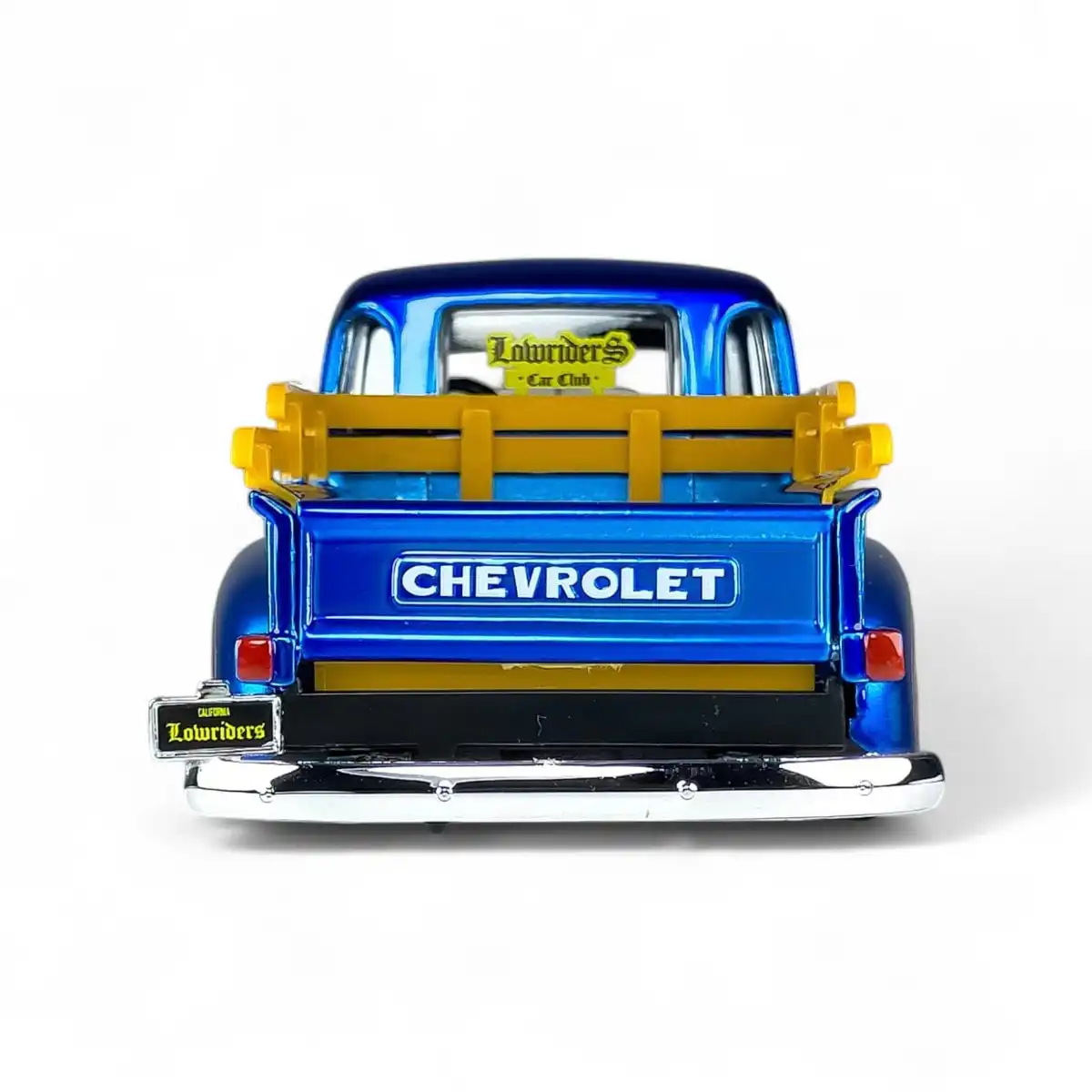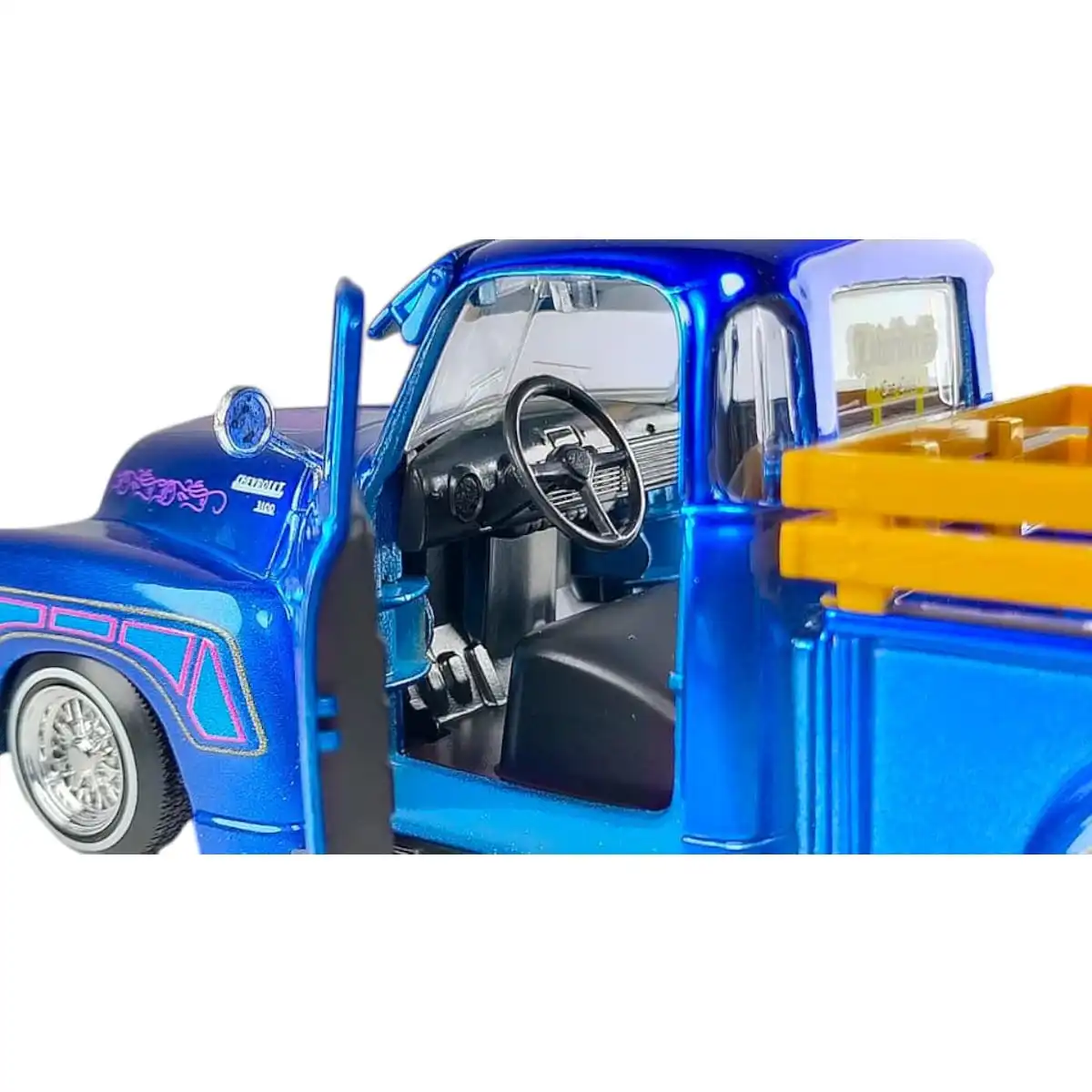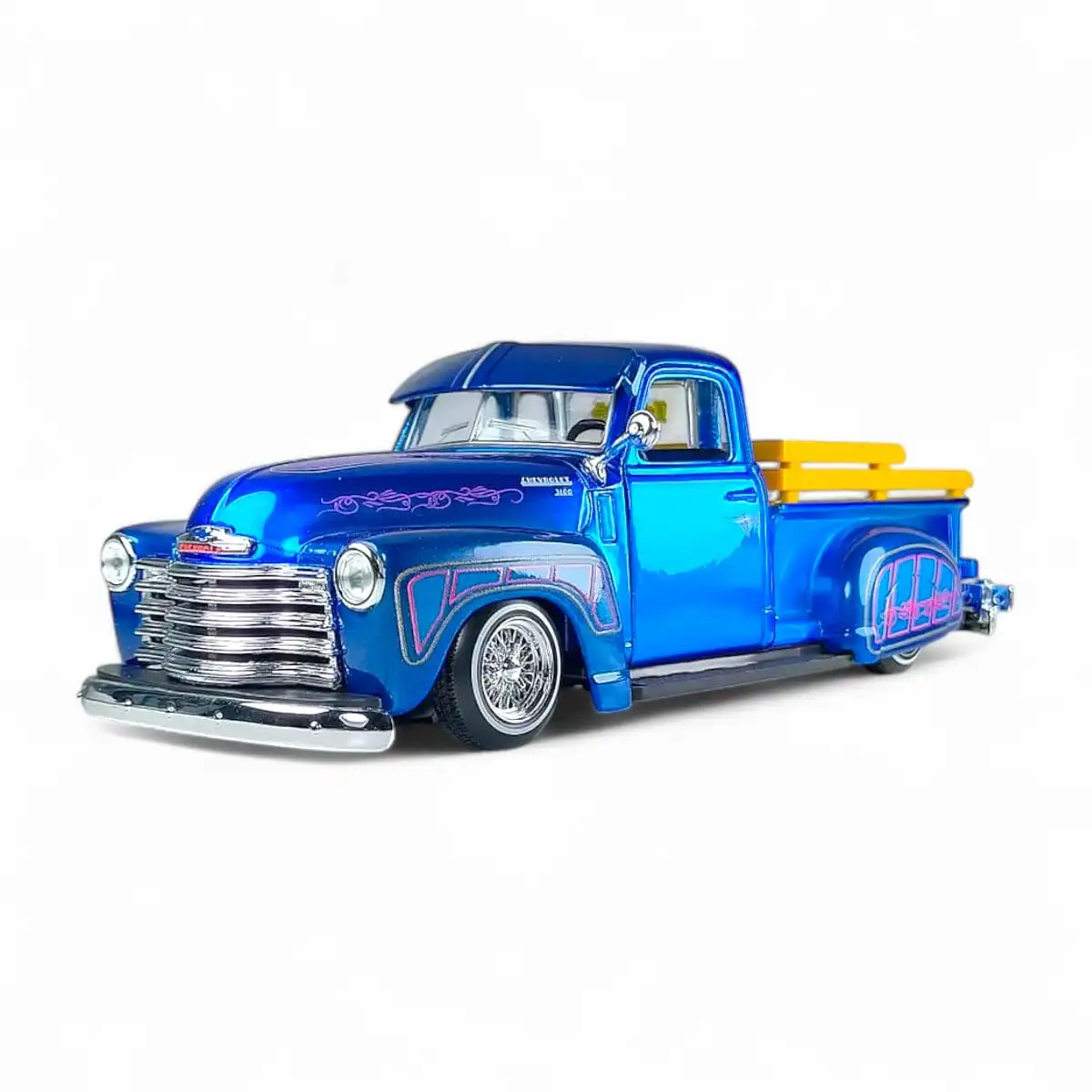 Chevy 3100 Pickup 1950 en color azul de Edición Especial “Low Riders” hecho por la marca Maisto Design. Este modelo de auto a escala fabricado en alta calidad tiene puertas y batea que se abren, llantas de goma, perfecto para coleccionistas y fanáticos de Chevrolet.