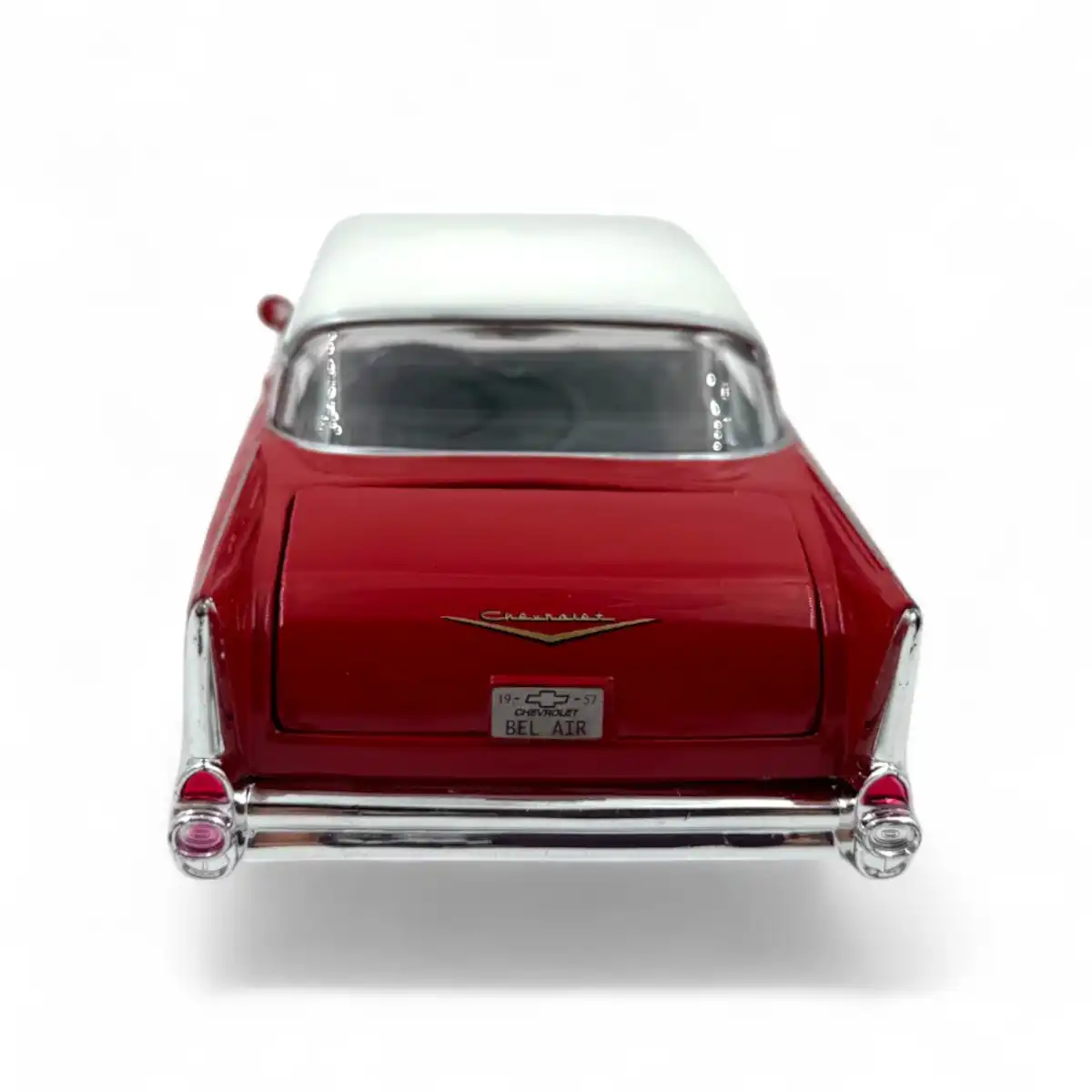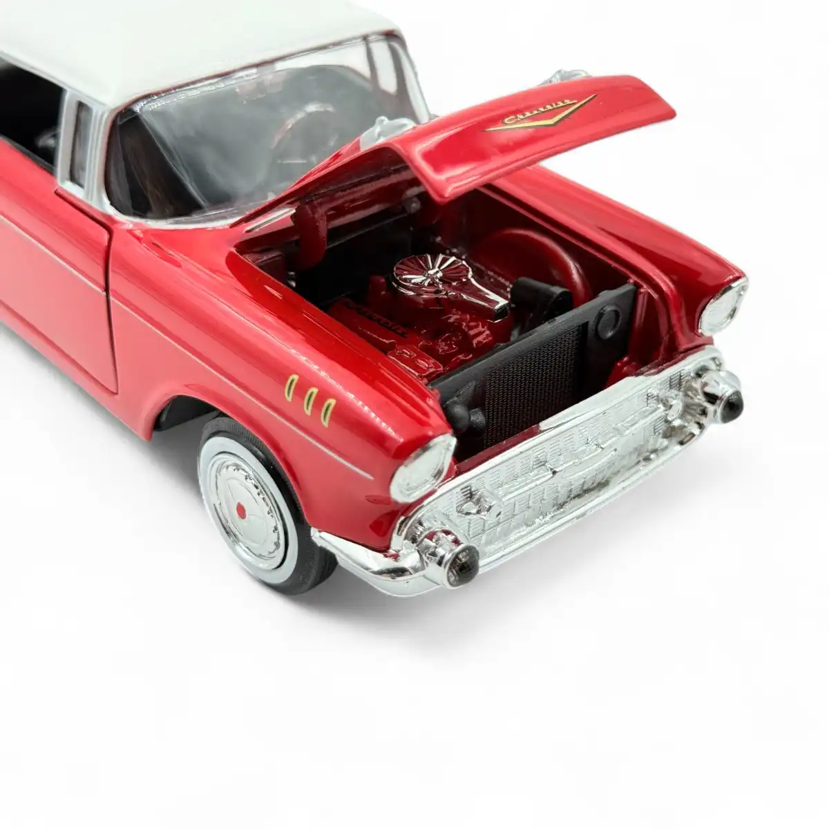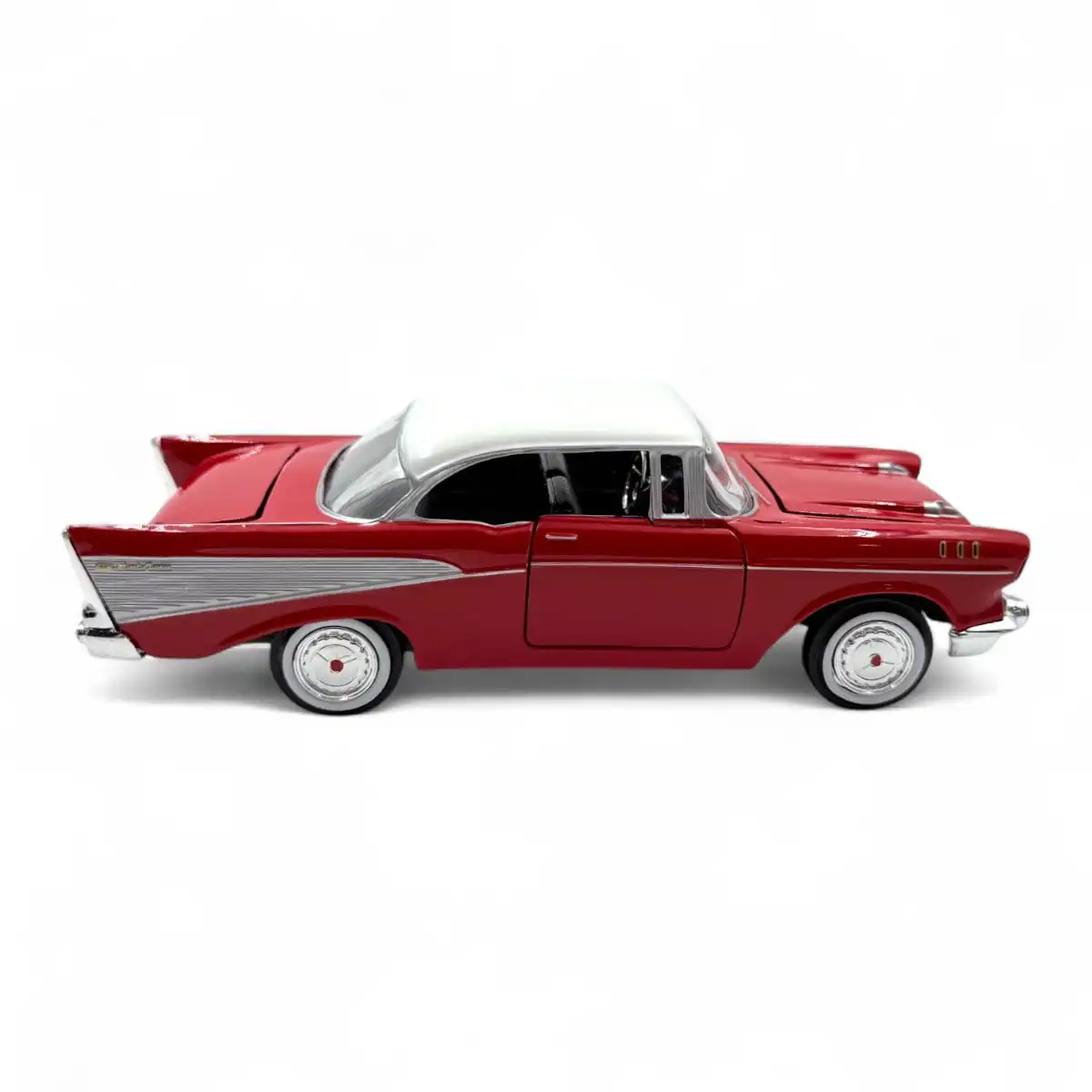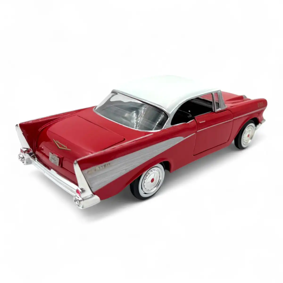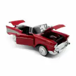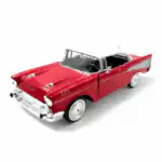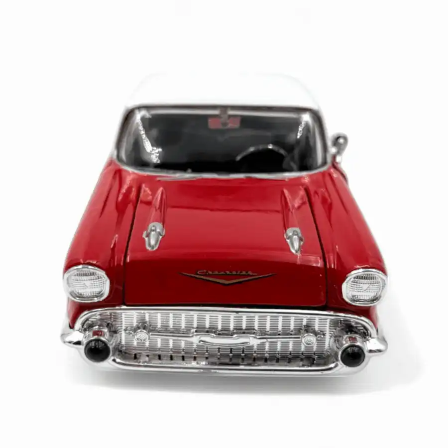 Chevy Bel Air 1957 de Edición Especial “American Classics”, hecho por la marca Motor Max. Este modelo de auto a escala fabricado en alta calidad tiene puertas, cajuela y cofre que se abren, llantas de goma, es perfecto para coleccionistas y fanáticos de la marca Chevrolet.