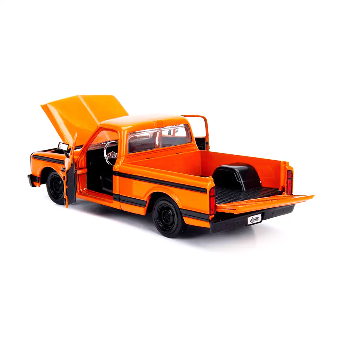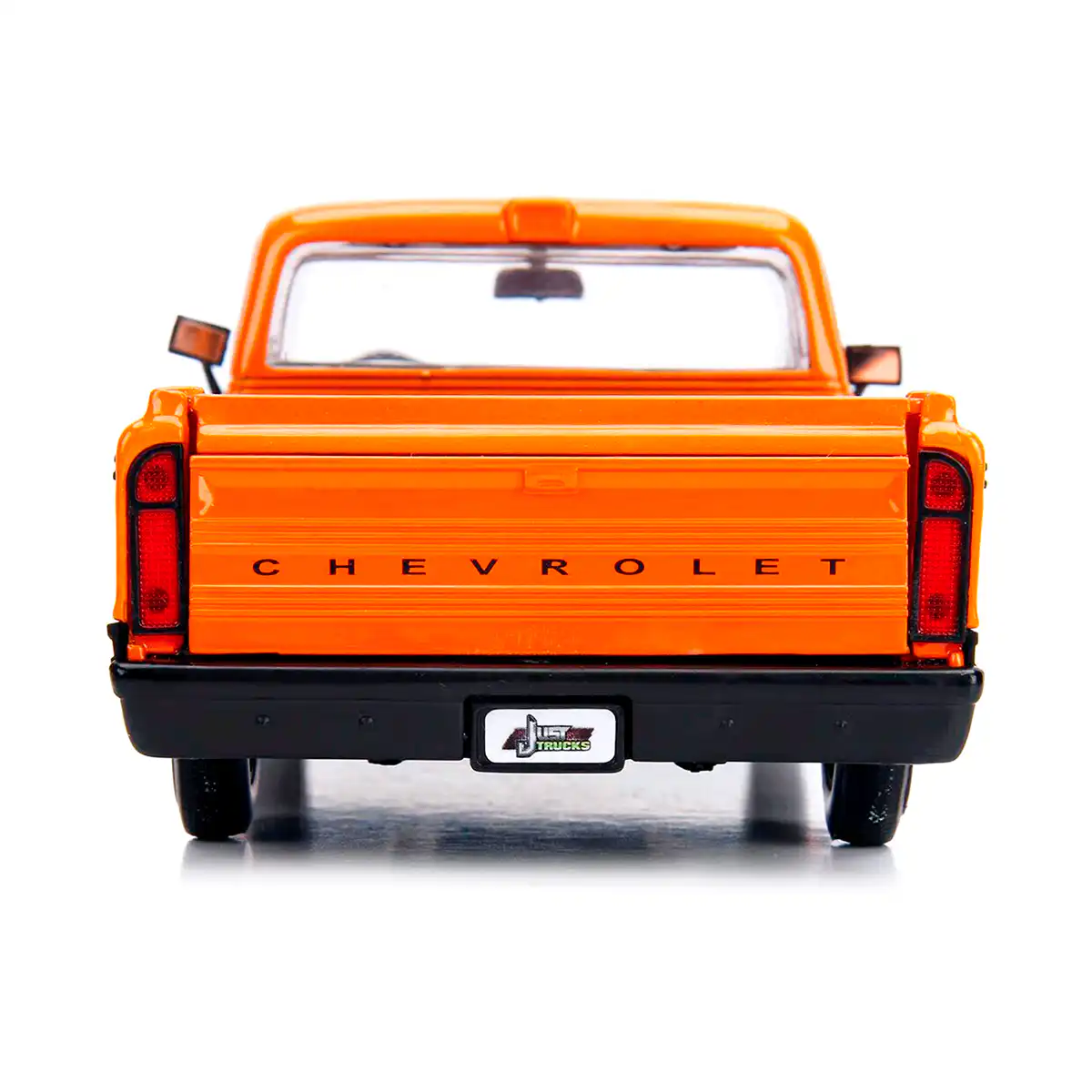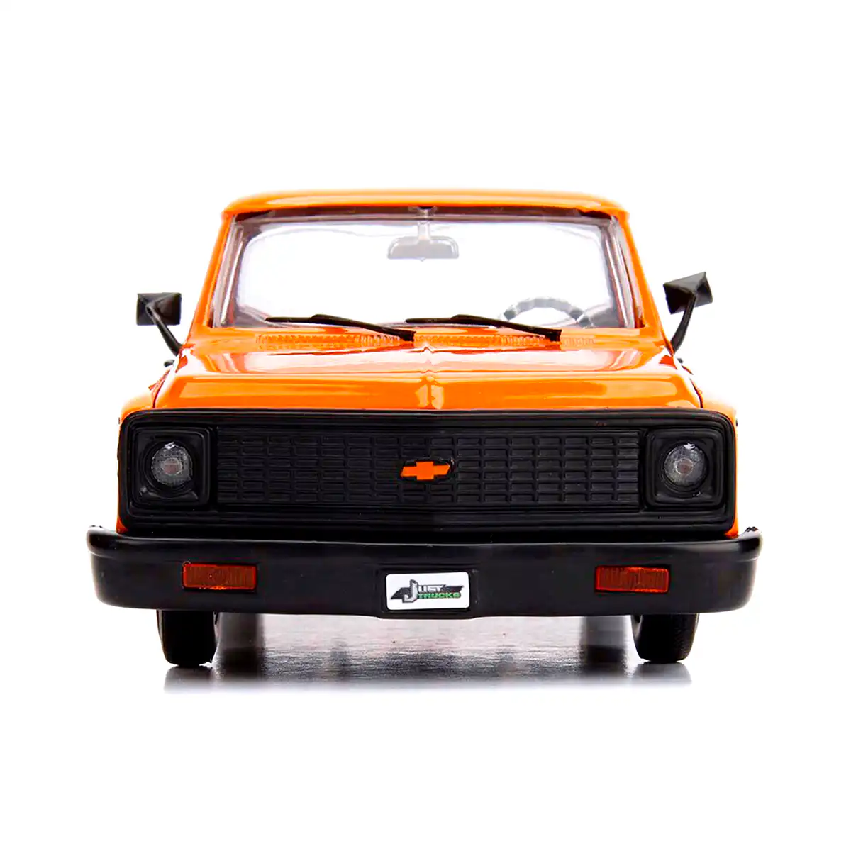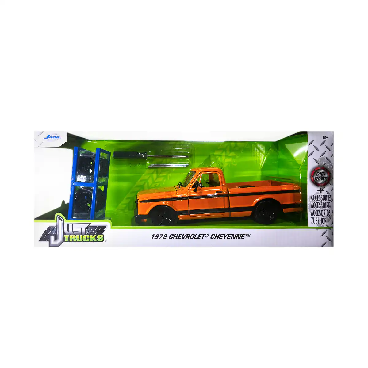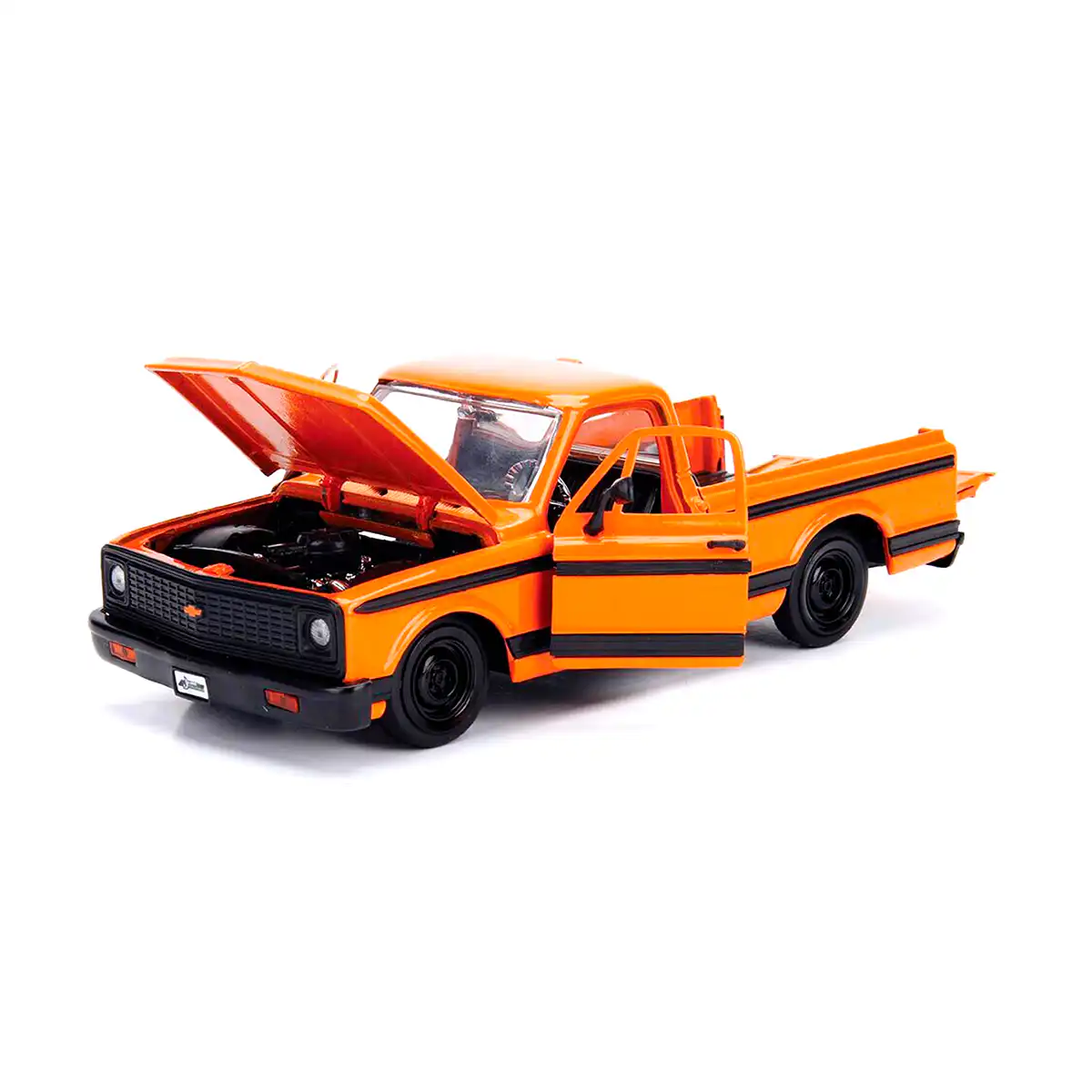 Chevy Cheyenne 1972 de Edición Especial “Just Trucks” hecho por la marca Jada. Este modelo de auto a escala fabricado en alta calidad tiene puertas, cofre y batea que se abren, un rack de rines intercambiables, llantas de goma y es perfecto para coleccionistas y fanáticos de Chevrolet.