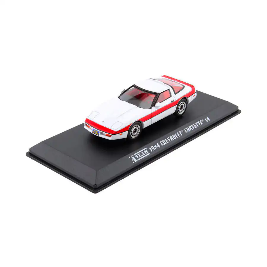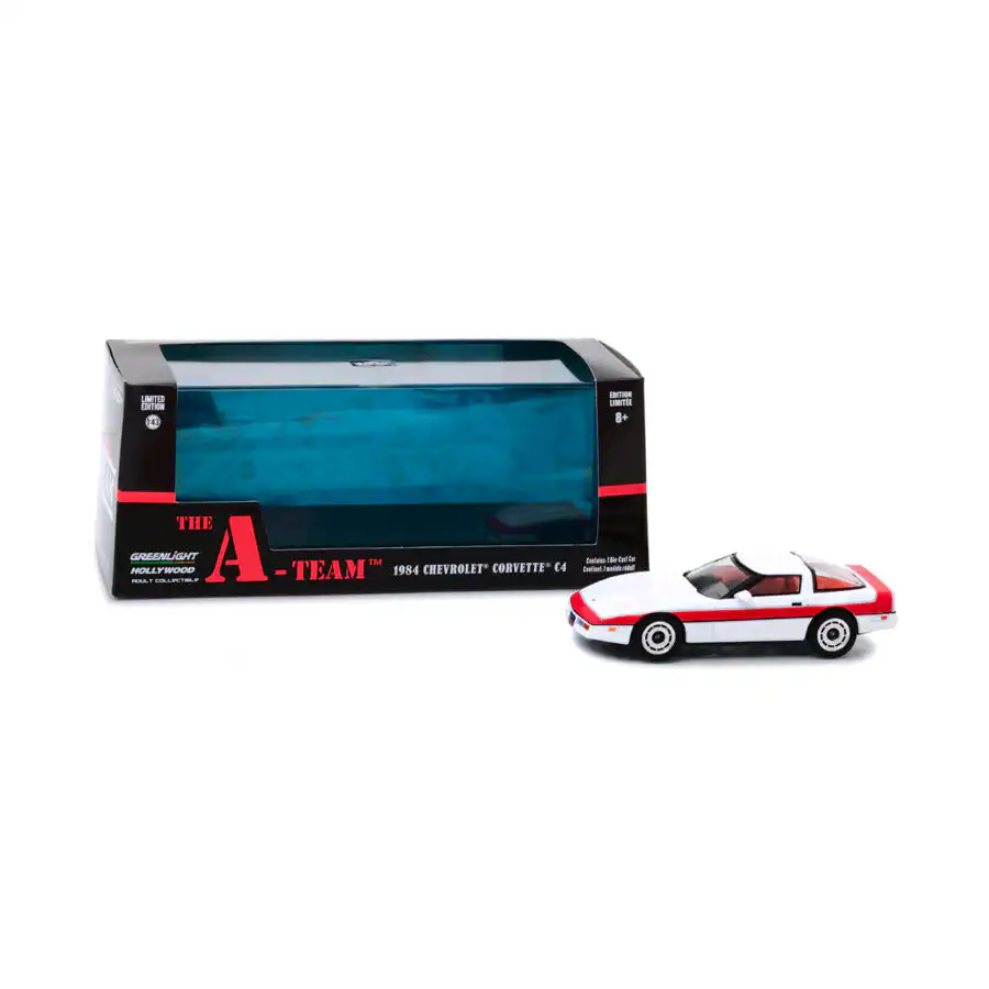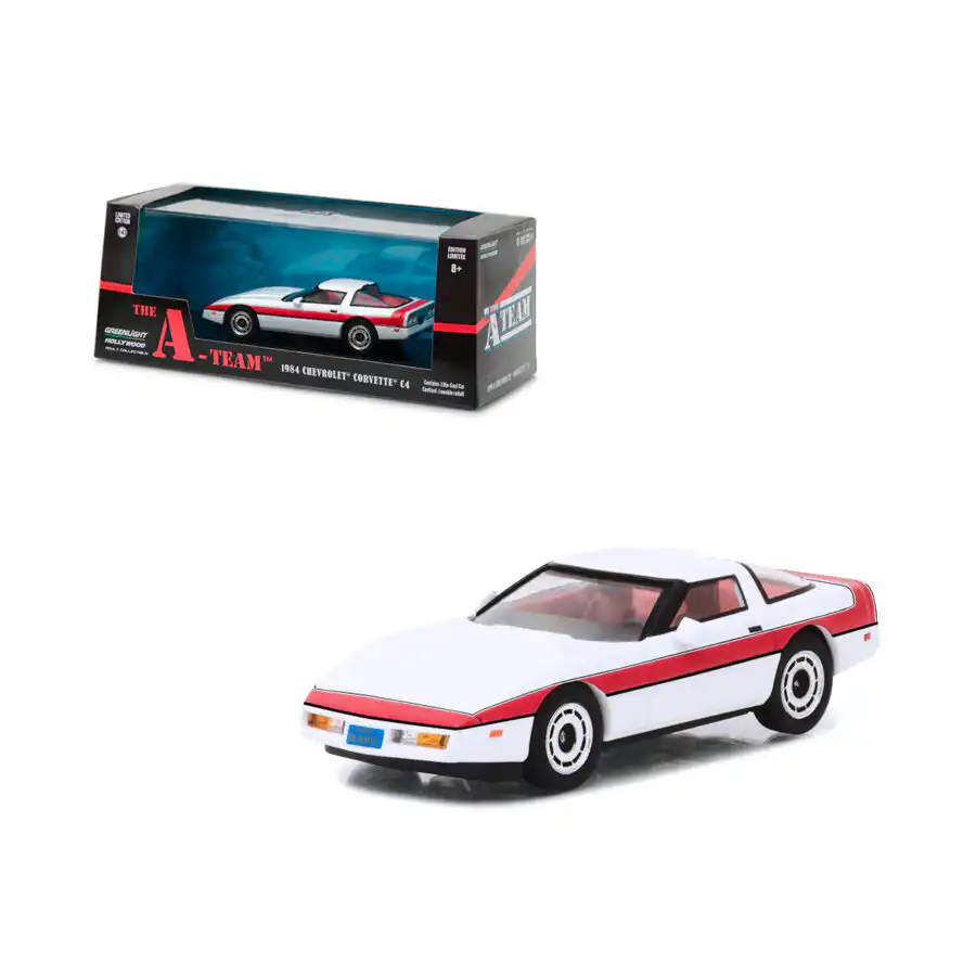 Chevy Corvette C4 1984 de Edición Limitada “The A-Team” hecho por la marca Greenlight. Este modelo de auto a escala fabricado en alta calidad incluye una caja de acrílico, base de plástico, llantas de goma y es perfecto para coleccionistas y fanáticos de Chevrolet.