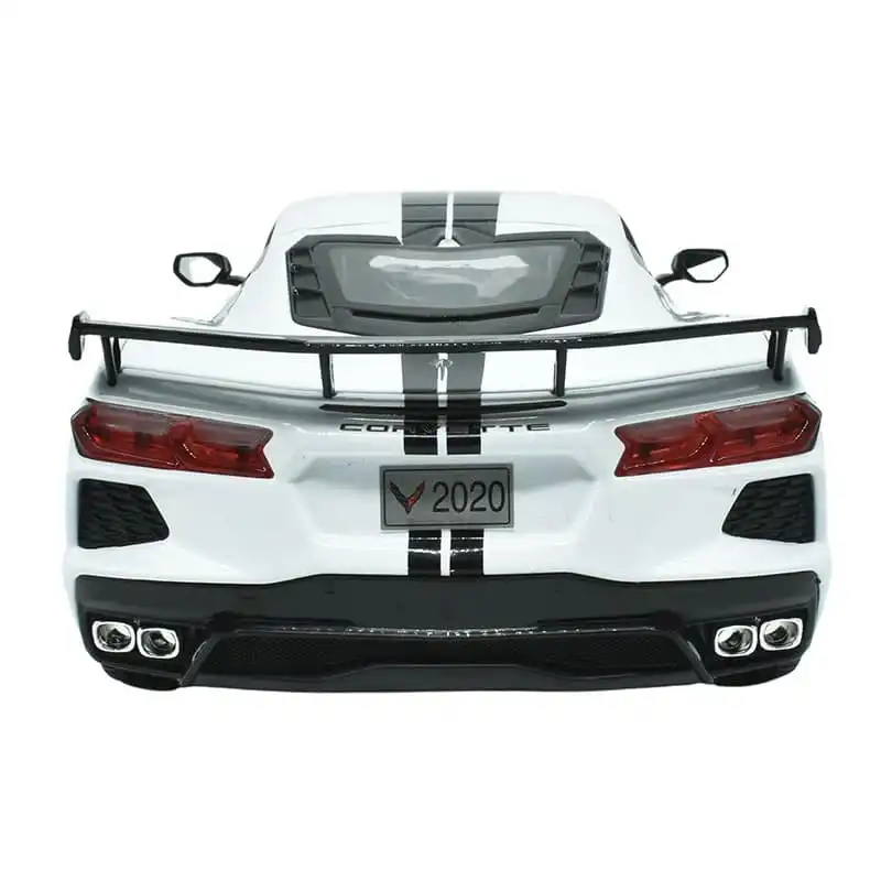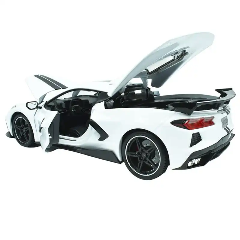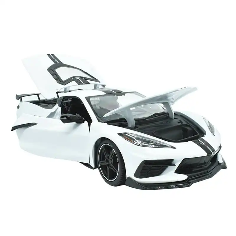 Chevrolet Corvette Stingray Coupe 2020 color Blanco hecho por la marca Maisto. Este modelo de auto a escala fabricado en alta calidad tiene puertas, tapa de motor y cofre que se abren, llantas de goma y es perfecto para coleccionistas y fanáticos de la marca Chevrolet.