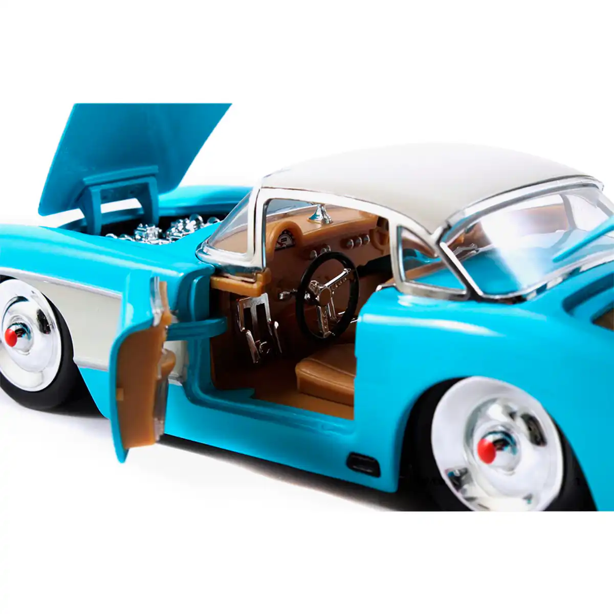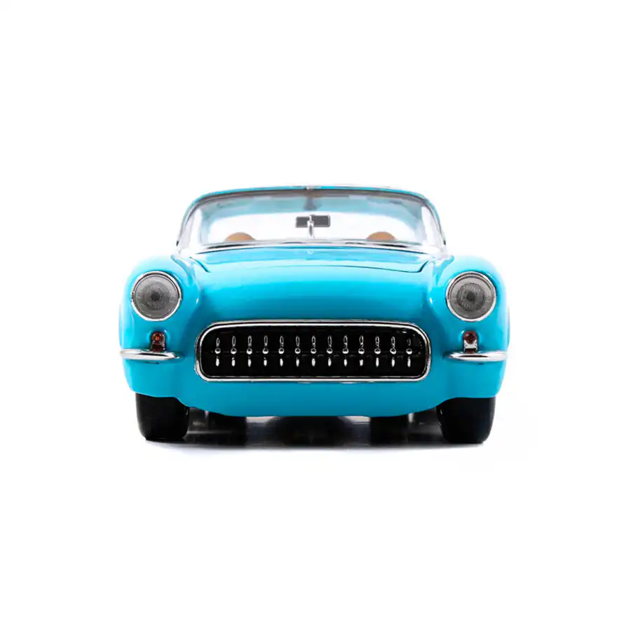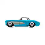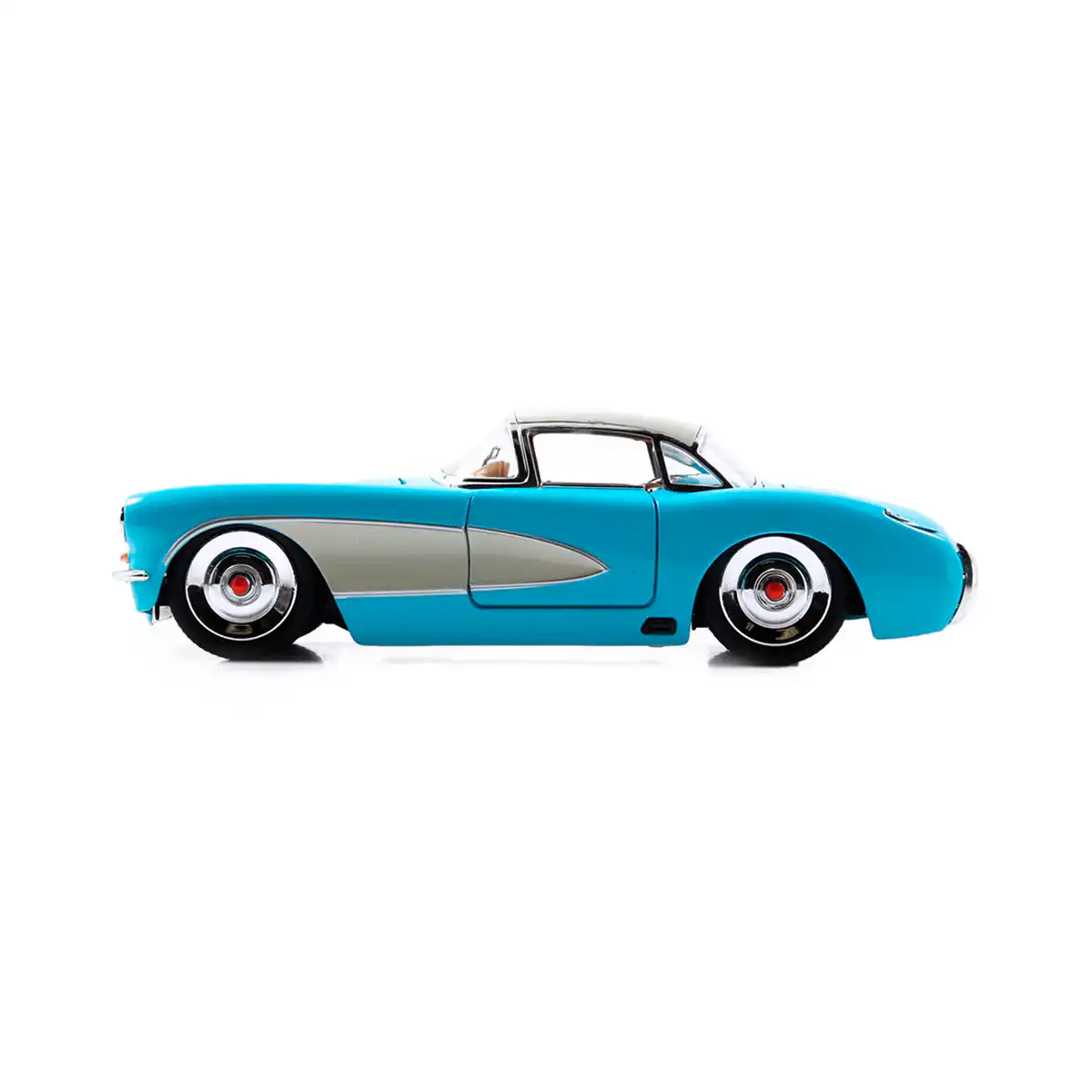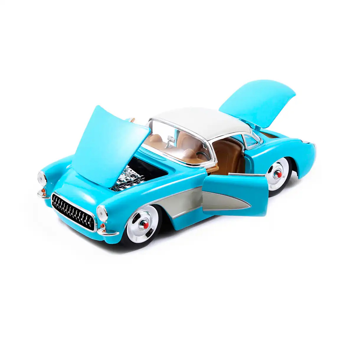 Chevy Corvette 1957 en color azul de Edición Especial “Big Time Muscle” hecho por la marca Jada. Este modelo de auto a escala fabricado en alta calidad tiene puertas, cajuela y cofre que se abren, llantas de goma, es perfecto para coleccionistas y fanáticos de Chevrolet.