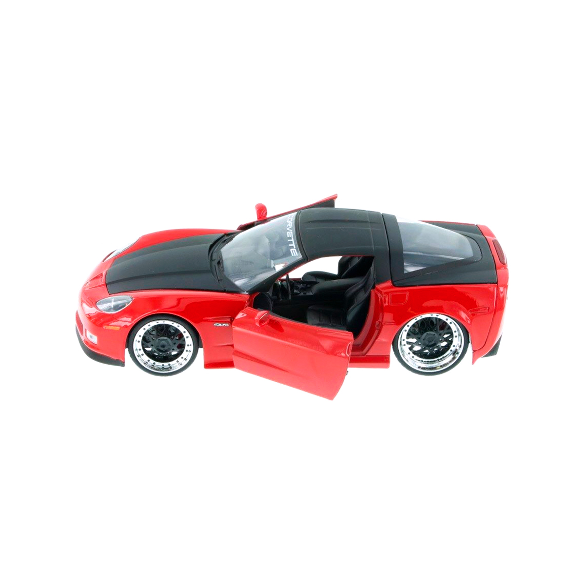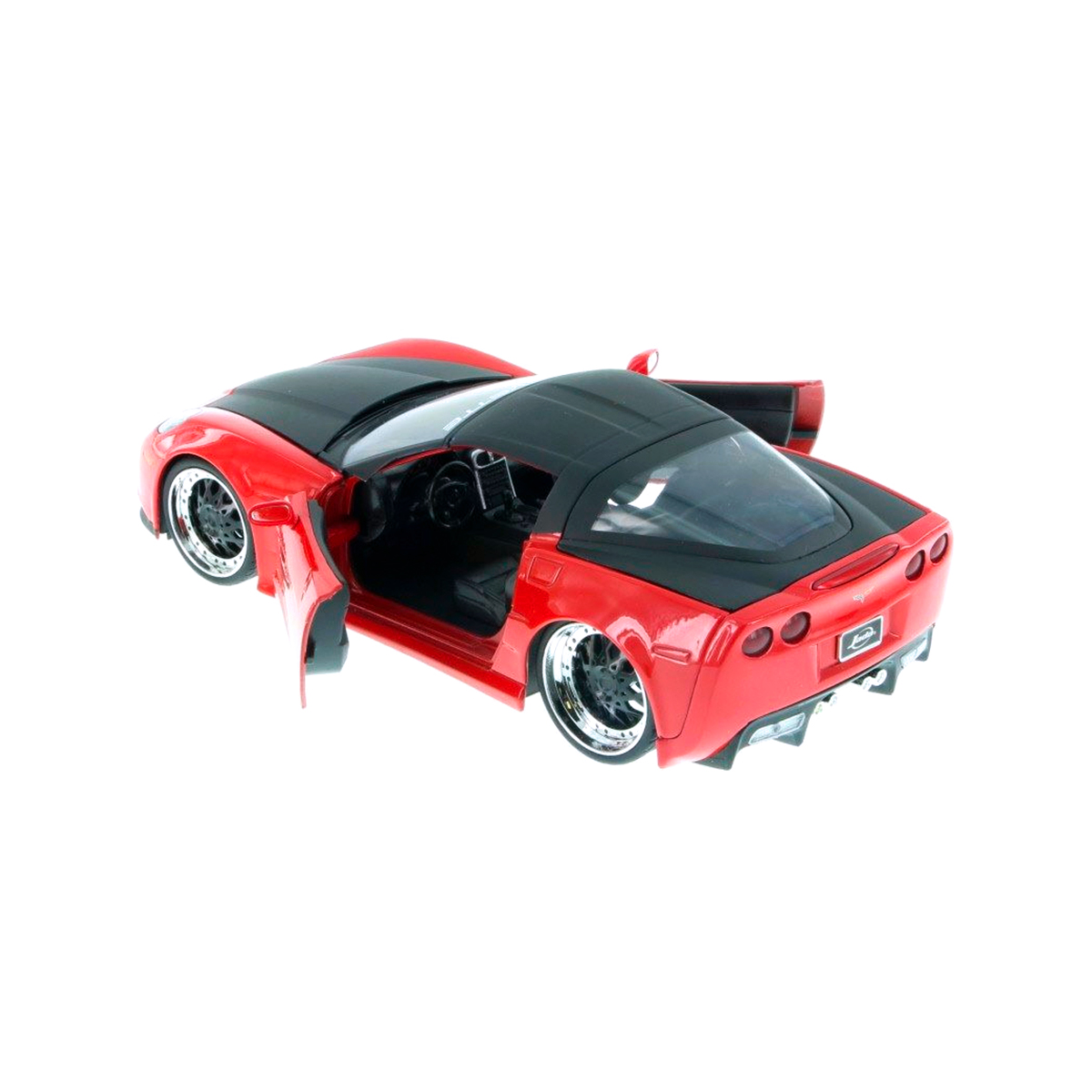 Chevy Corvette Z06 2006 en color rojo de Edición Especial “Big Time Muscle” hecho por la marca Jada. Este modelo de auto a escala fabricado en alta calidad tiene puertas, cajuela y cofre que se abren, llantas de goma, es perfecto para coleccionistas y fanáticos de Chevrolet.
