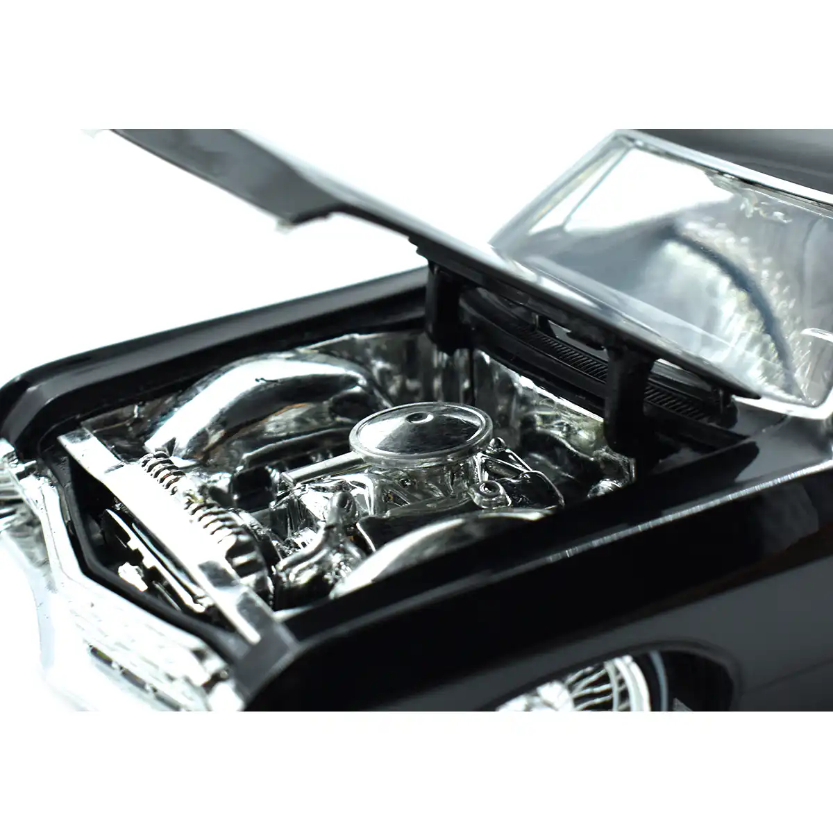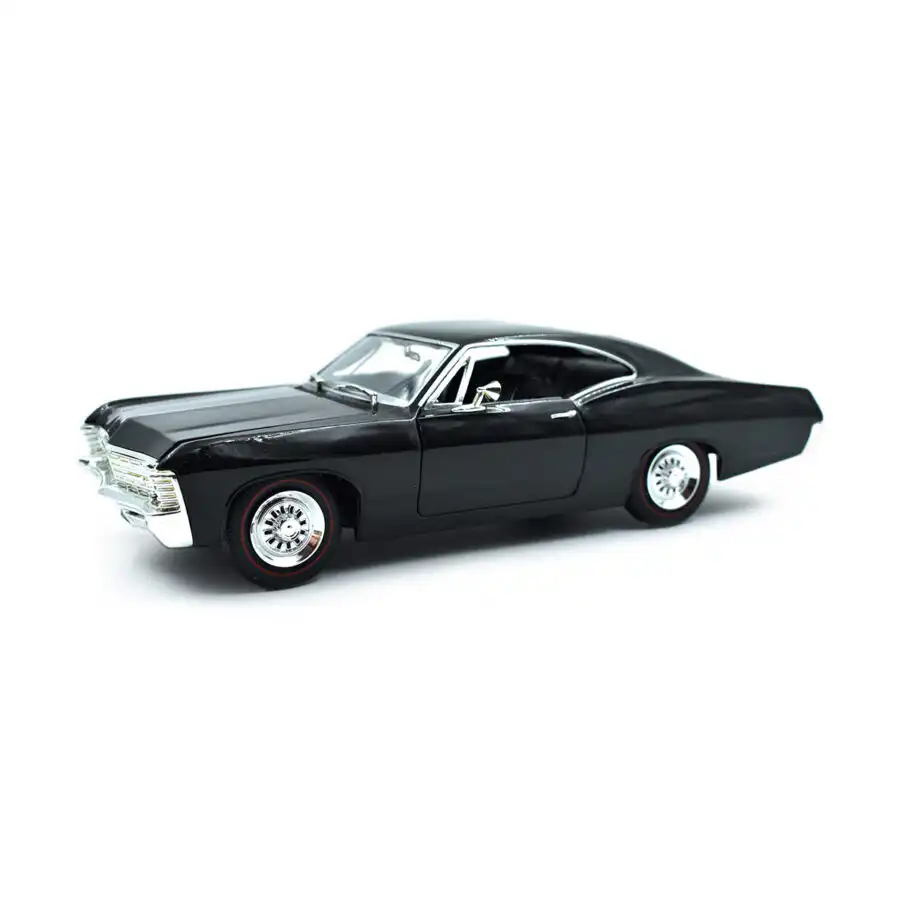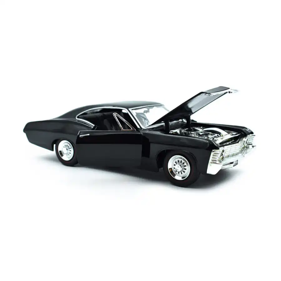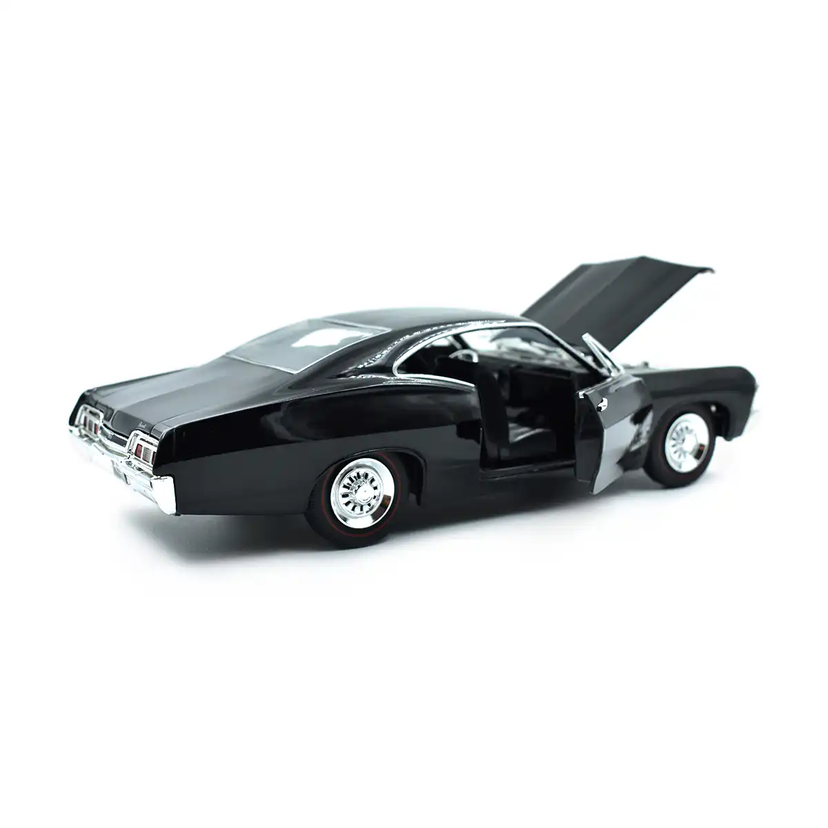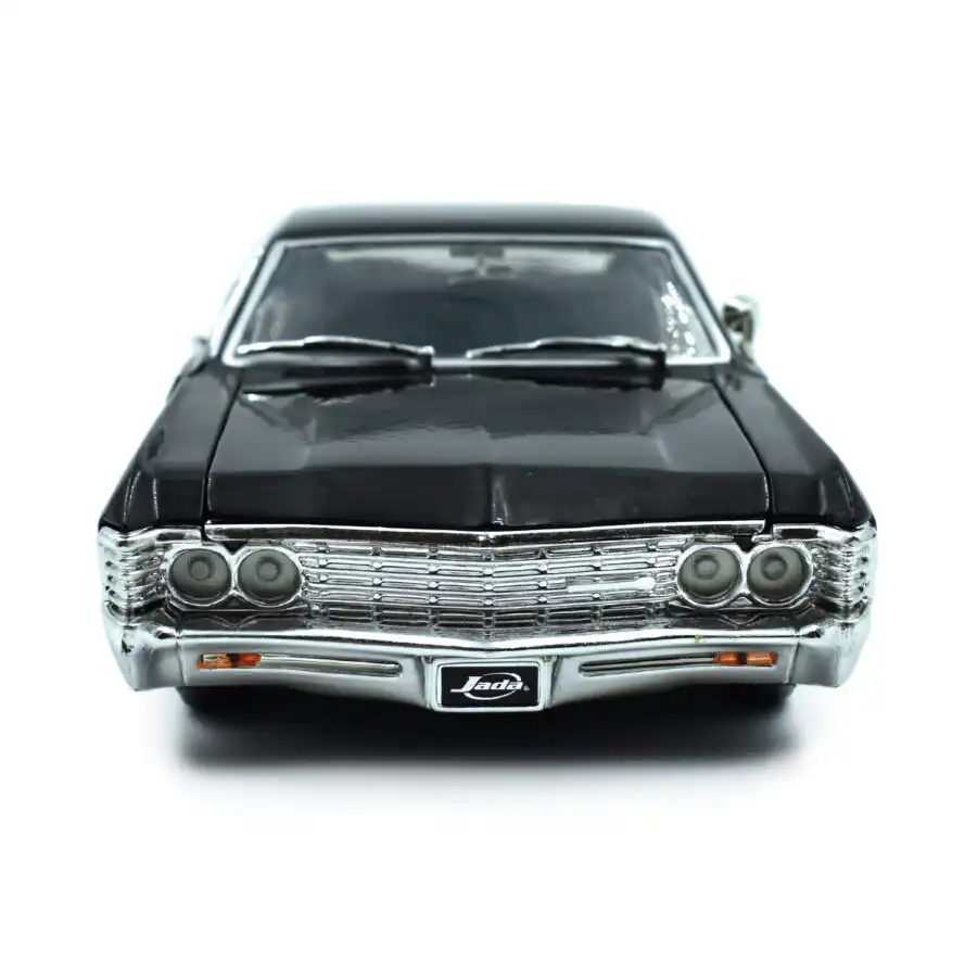 Chevy Impala Hard Top 1967 en color negro de Edición Especial “Showroom Floor” hecho por la marca Jada. Este modelo de auto a escala fabricado en alta calidad tiene puertas y cofre que se abren, llantas de goma, es perfecto para coleccionistas y fanáticos de Chevrolet.