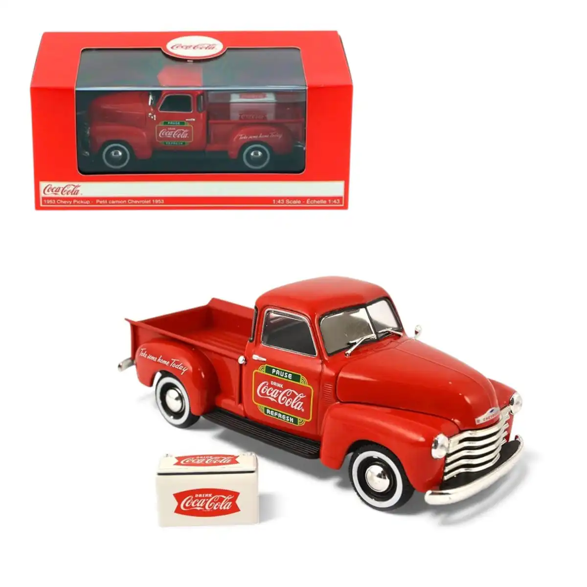 Chevy Pickup 1953 de Edición Especial “Coca-Cola”, hecho por la marca Motor City Classics. Este modelo de auto a escala fabricado en alta calidad tiene llantas de goma, incluye acrílico y base de plástico, incluye una hielera a escala de Coca Cola, perfecto para coleccionistas y fanáticos de Chevrolet.
