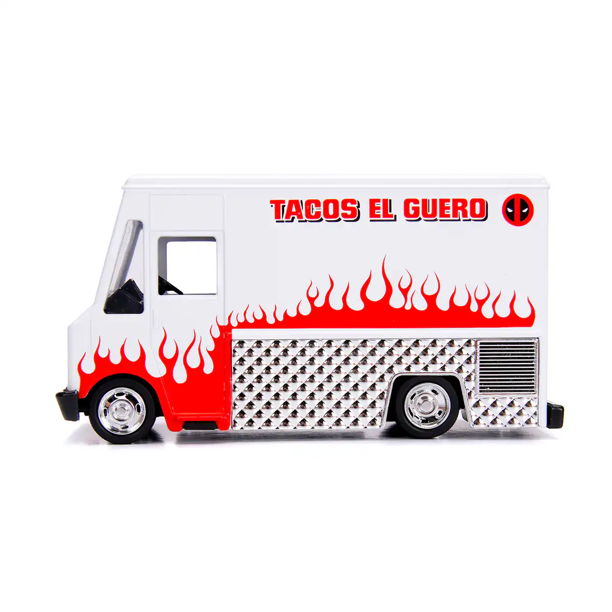 Food Truck de Edición Especial “Deadpool Chimichangas” hecho por la marca Jada. Este modelo de auto a escala fabricado en alta calidad tiene ventana de servicio lateral que se abre, llantas de goma y es perfecto para coleccionistas y fanáticos de Marvel.