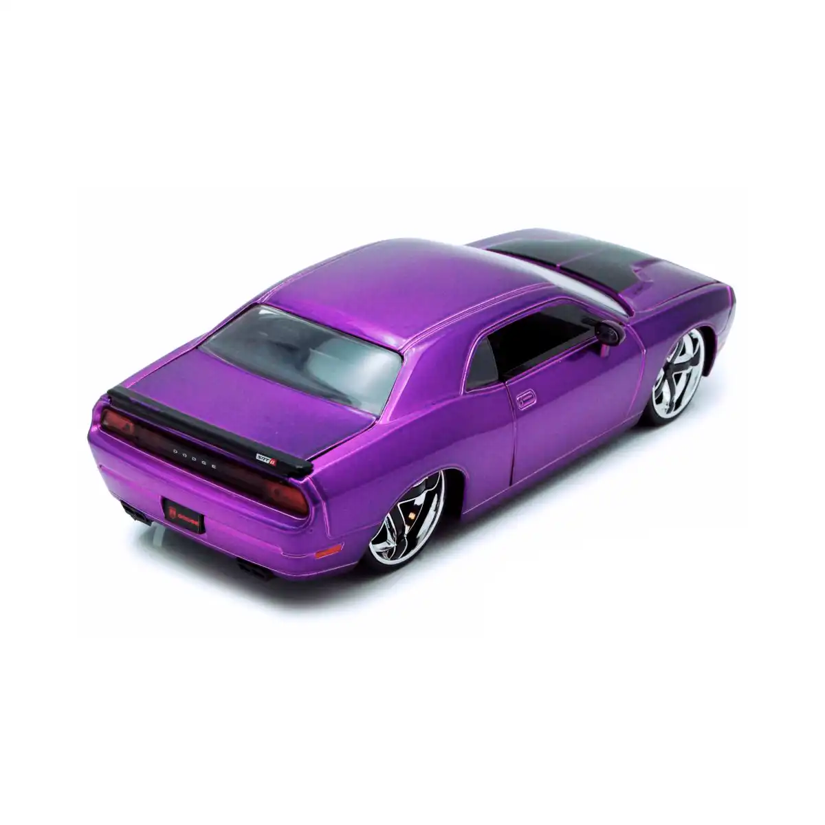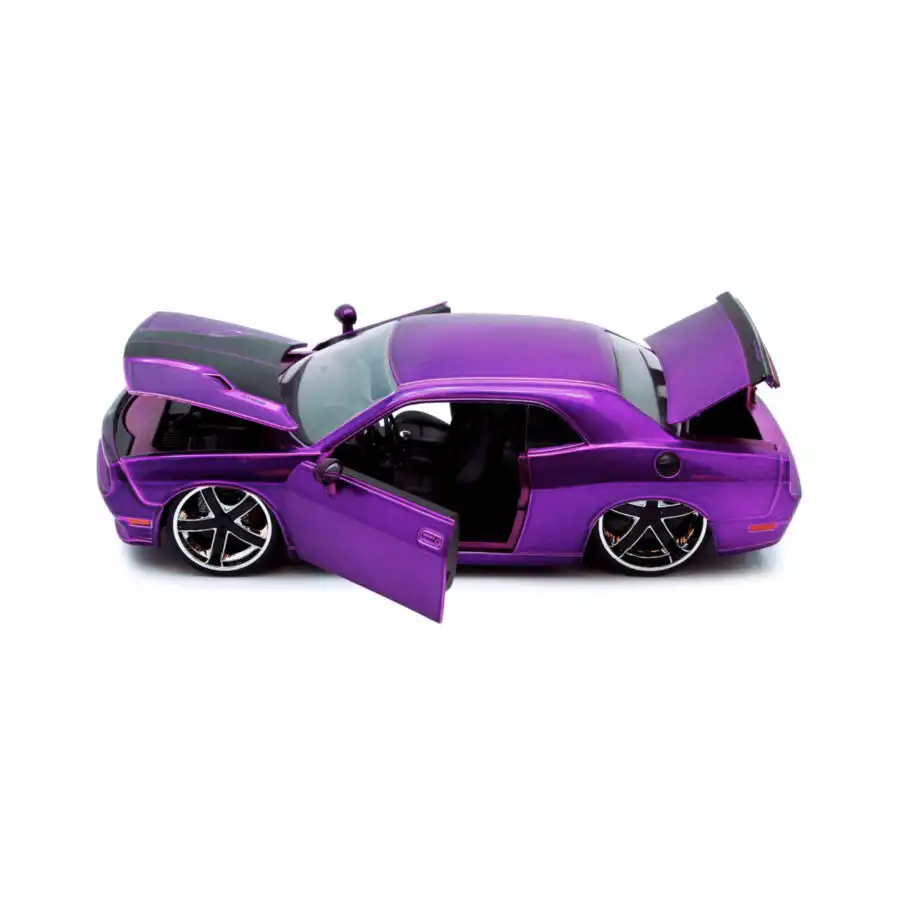 Dodge Challenger SRT8 2008 en color morado de Edición Especial “Big Time Muscle” hecho por la marca Jada. Este modelo de auto a escala fabricado en alta calidad tiene puertas, cajuela y cofre que se abren, llantas de goma, es perfecto para coleccionistas y fanáticos de Dodge.