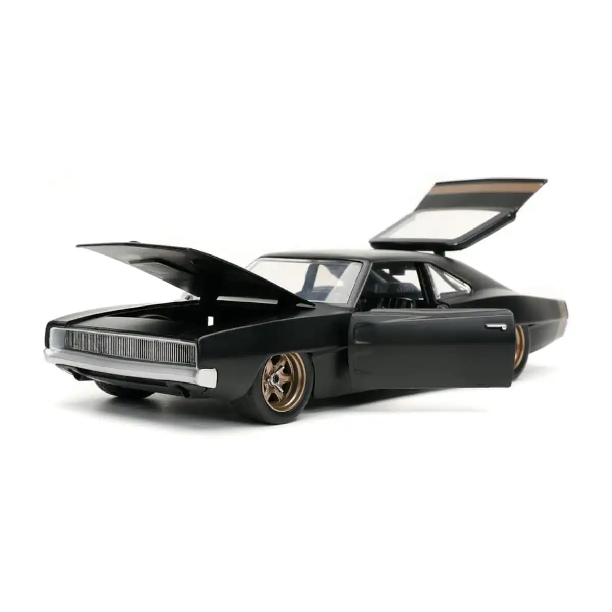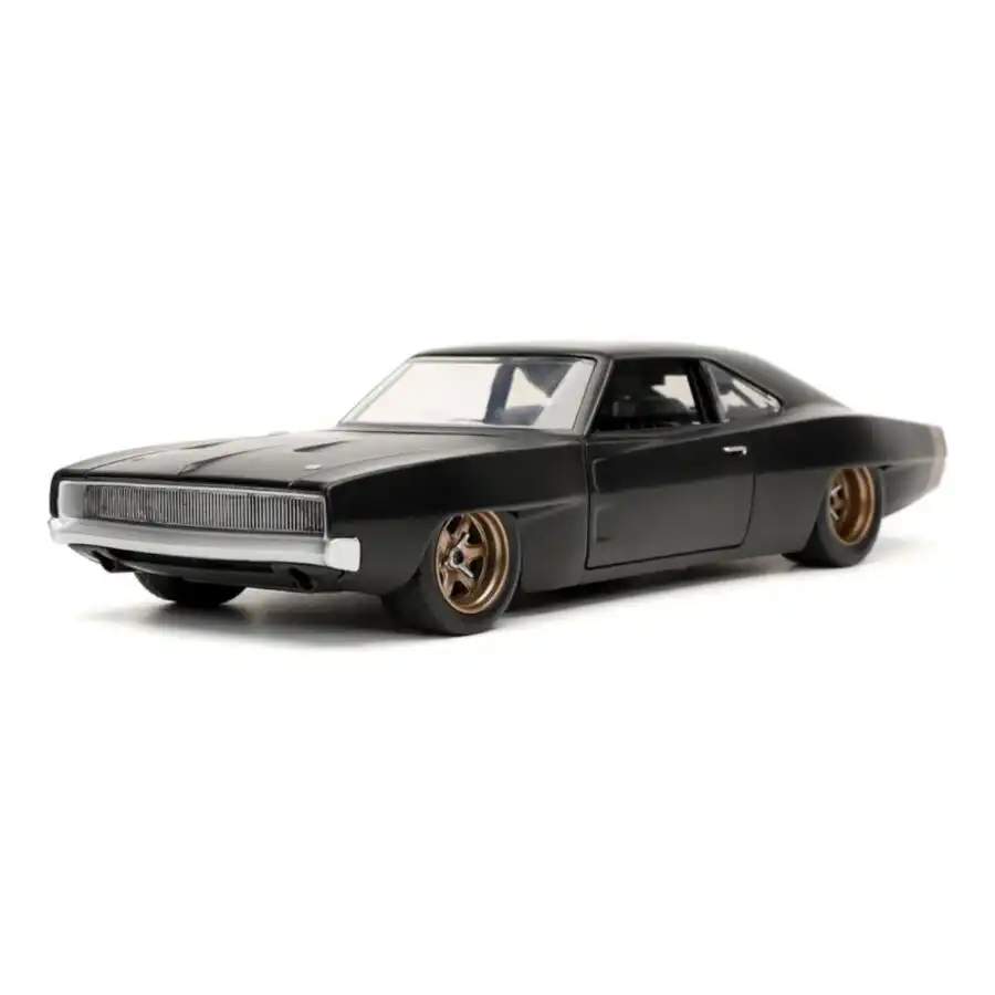 Dodge Charger 1968 Widebody de Dom de Edición Especial “Rápido y Furioso” hecho por la marca Jada. Este modelo de auto a escala fabricado en alta calidad tiene puertas, cofre y cajuela que se abren, llantas de goma y es perfecto para coleccionistas y fanáticos de Dodge.