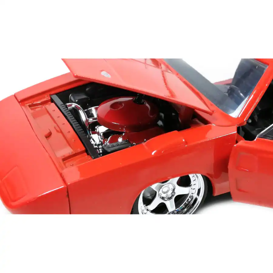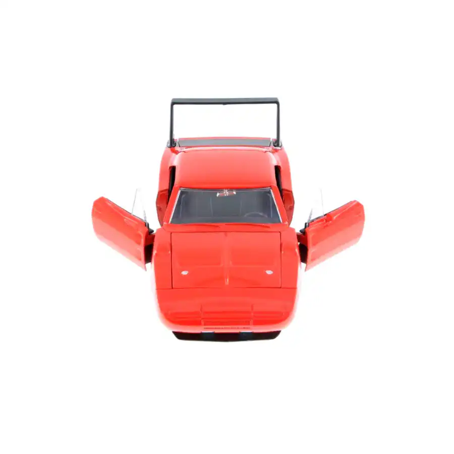 Dodge Charger Daytona 1969 en color naranja de Edición Especial “Big Time Muscle” hecho por la marca Jada. Este modelo de auto a escala fabricado en alta calidad tiene puertas, cajuela y cofre que se abren, llantas de goma, es perfecto para coleccionistas y fanáticos de Dodge.