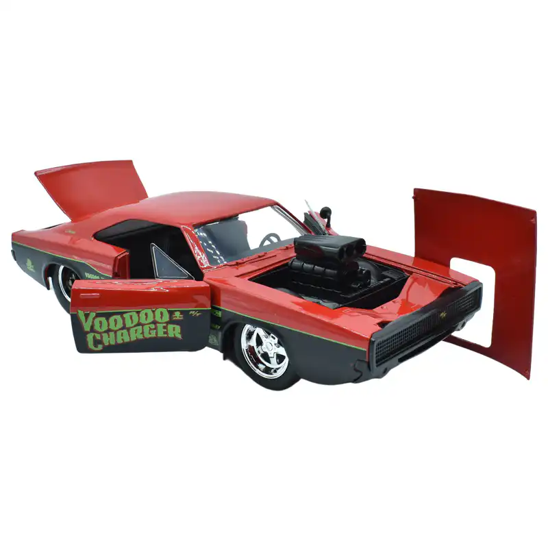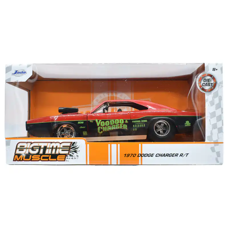 Dodge Charger RT 1970 de Edición Especial “VooDoo Big Time Muscle” hecho por la marca Jada. Este modelo de auto a escala fabricado en alta calidad tiene puertas, cofre y cajuela que se abren, llantas de goma y es perfecto para coleccionistas y fanáticos de Dodge.