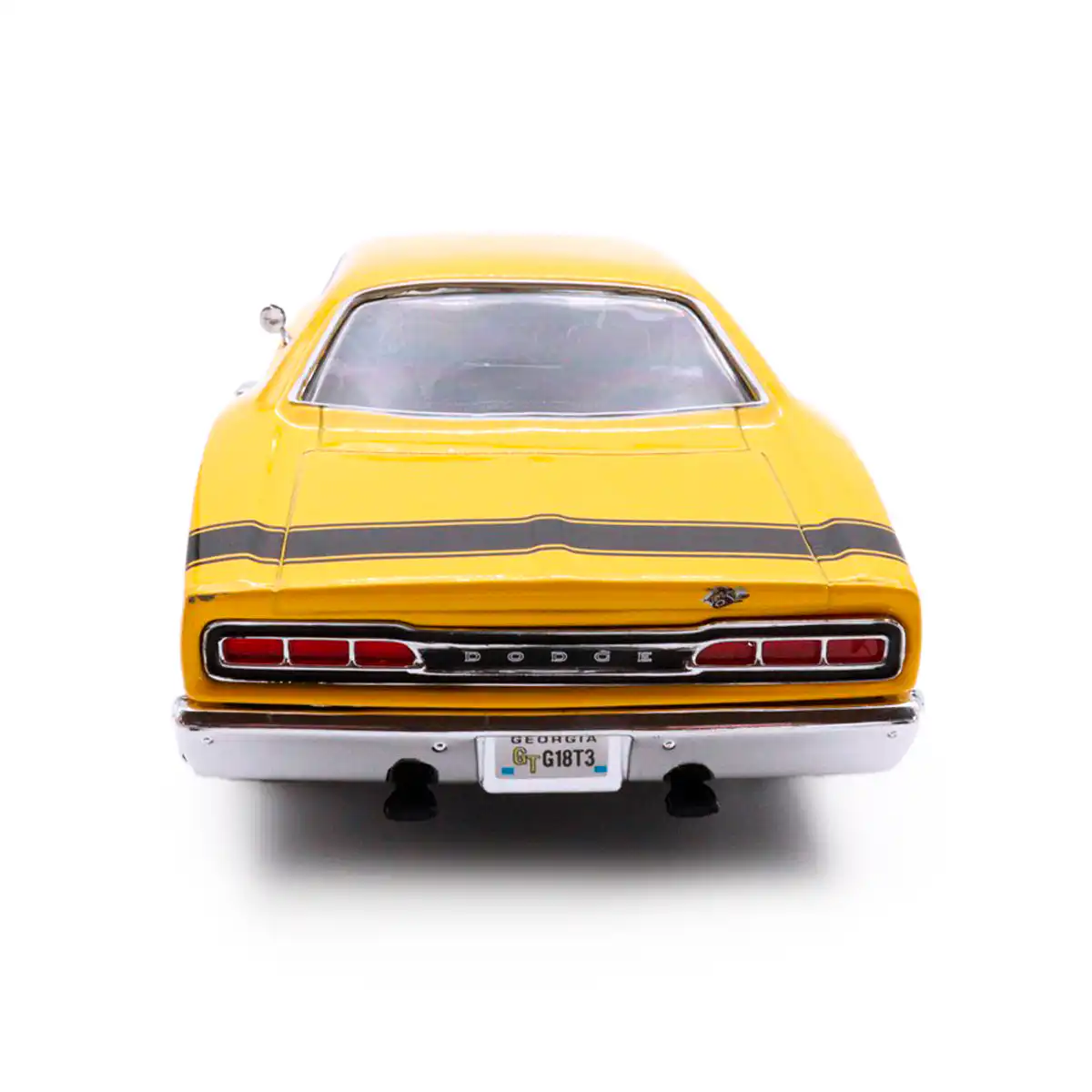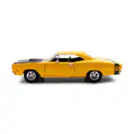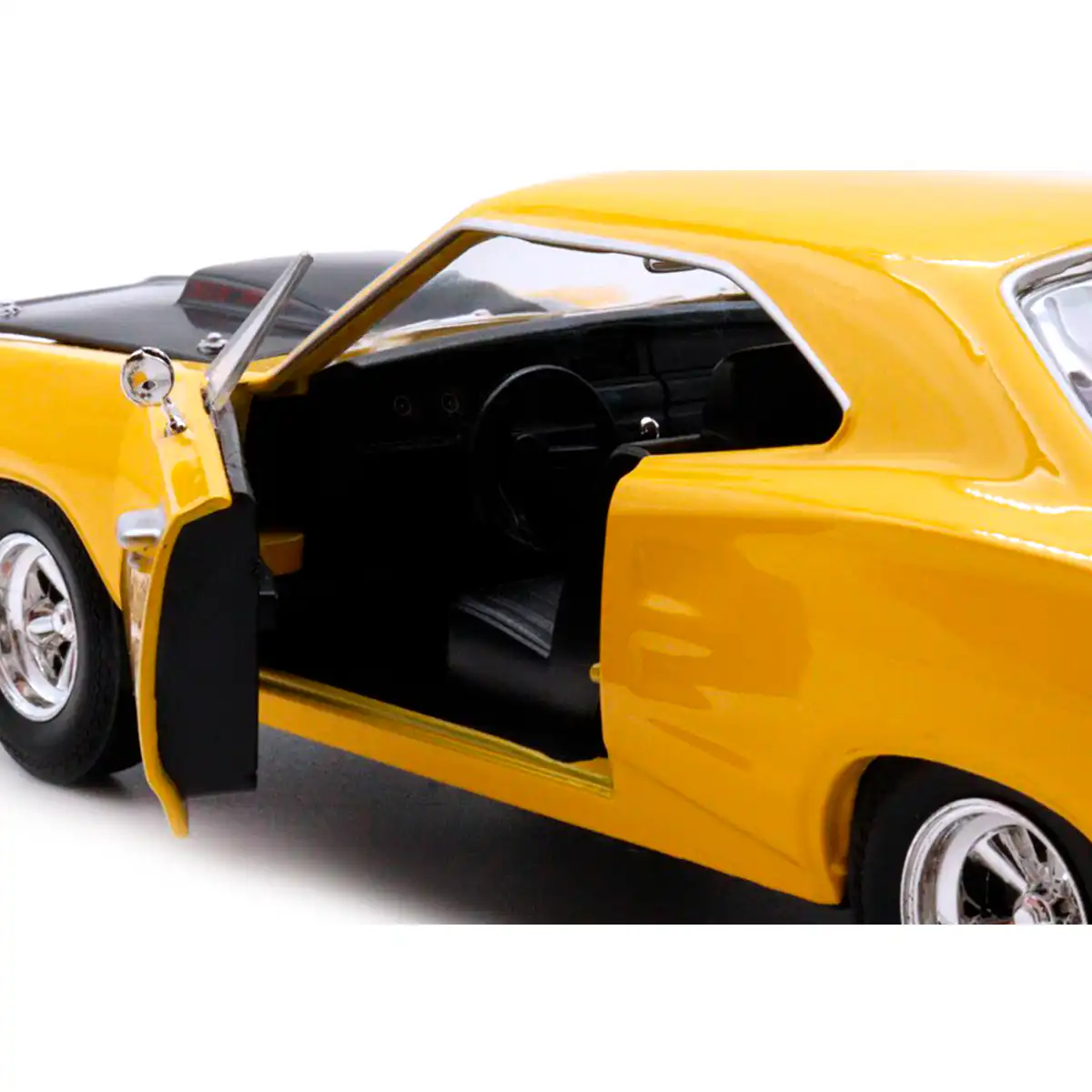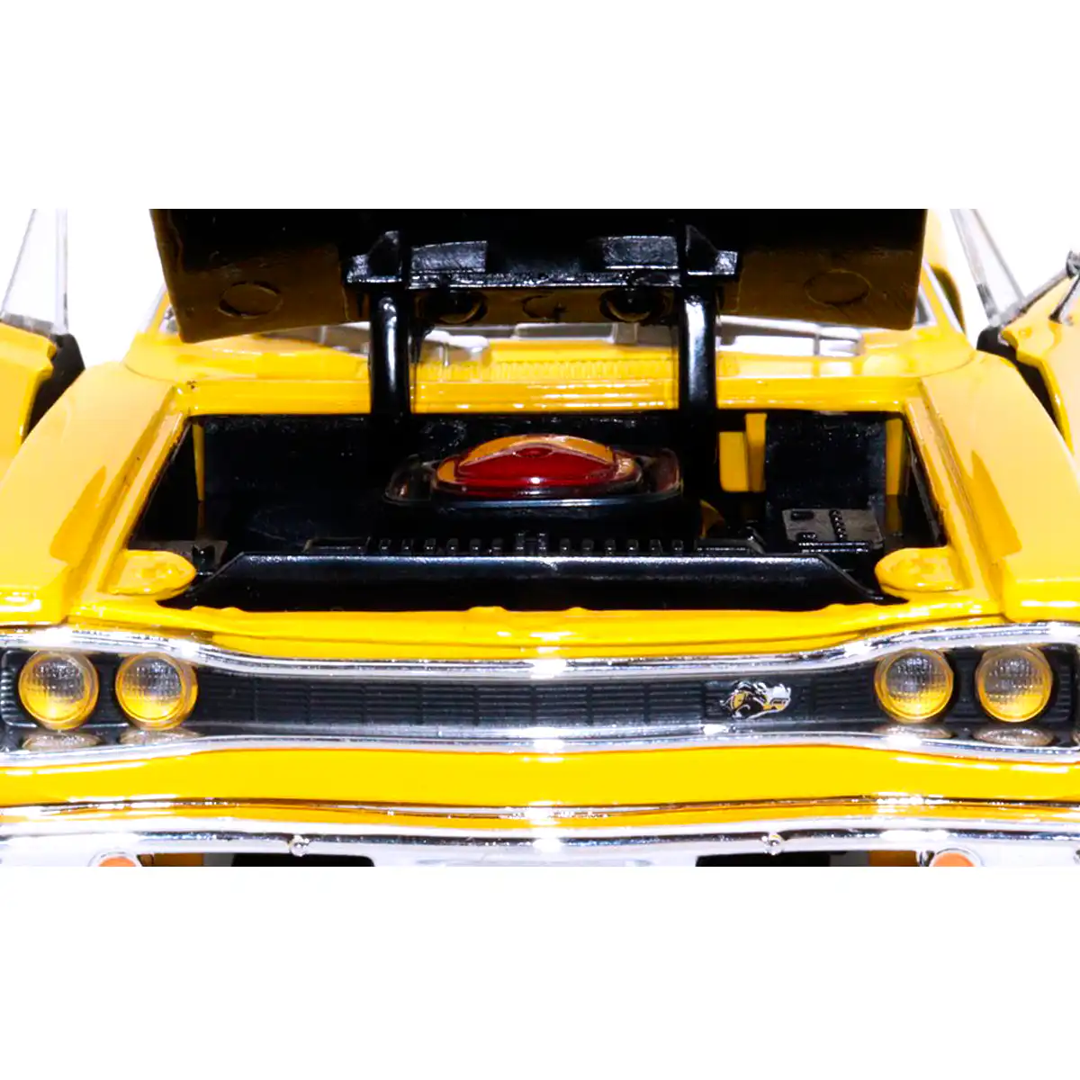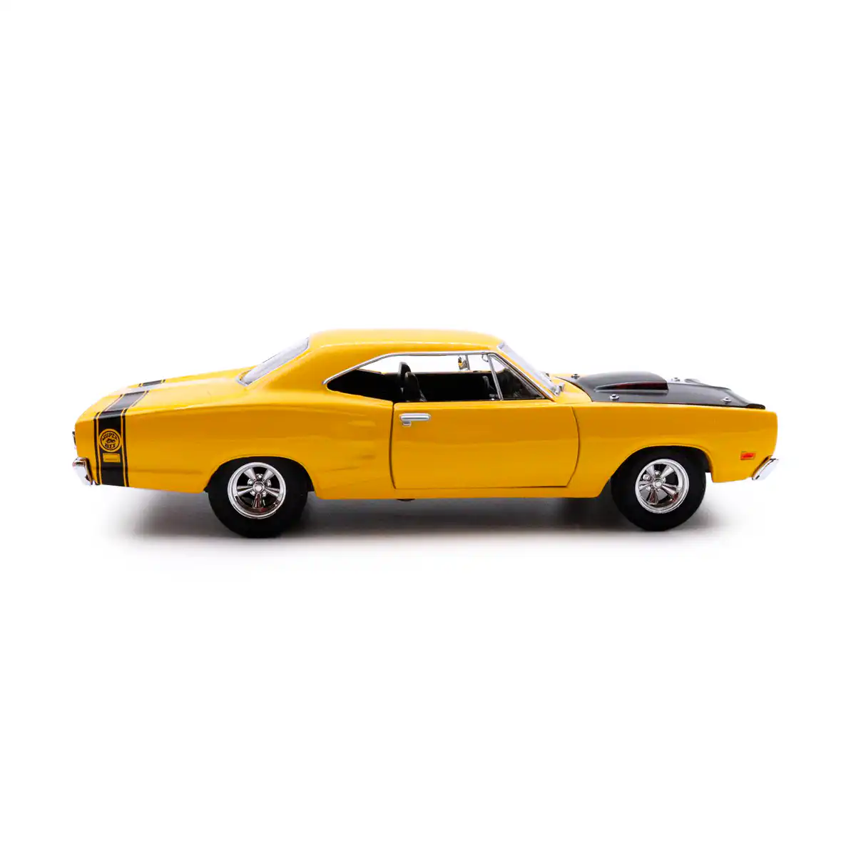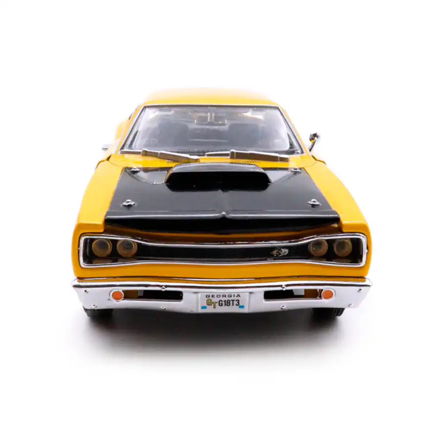 Dodge Coronet Super Bee 1969 en color amarillo de Edición Especial «American Classics» hecho por la marca Motor Max. Este modelo de auto a escala fabricado en alta calidad tiene puertas y cofre que se abren, llantas de goma y es perfecto para coleccionistas y fanáticos de Dodge.