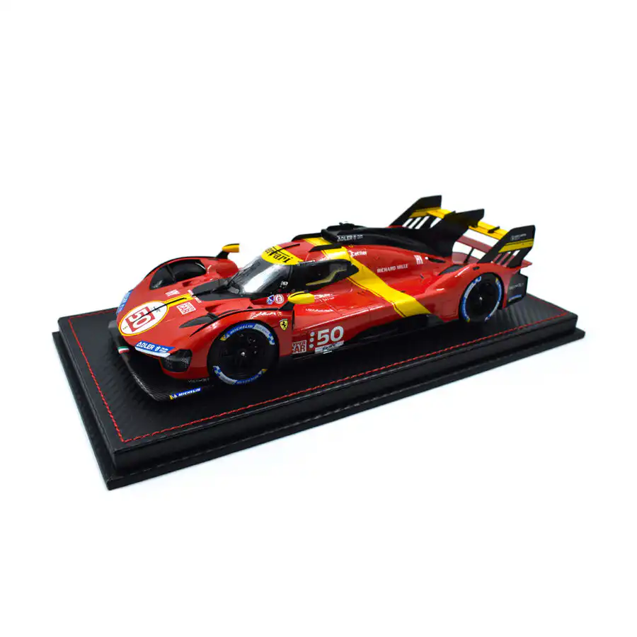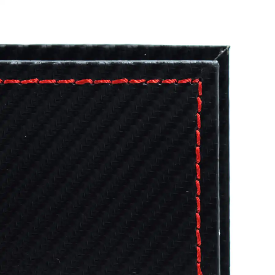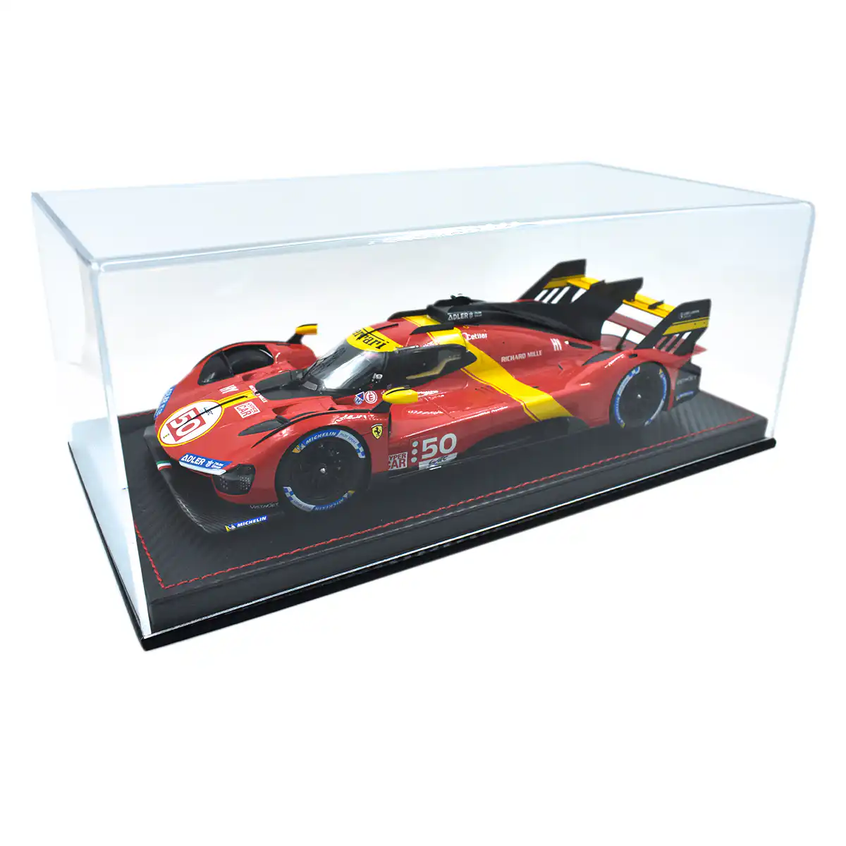 Exhibidor de acrílico de alta calidad con base de piel en color negro con terminación tipo fibra de carbono y stitching en hilo rojo. Protege tu preciado coche de polvo y daños, mientras lo exhibes en este display perfecto para autos a escala 1:18.