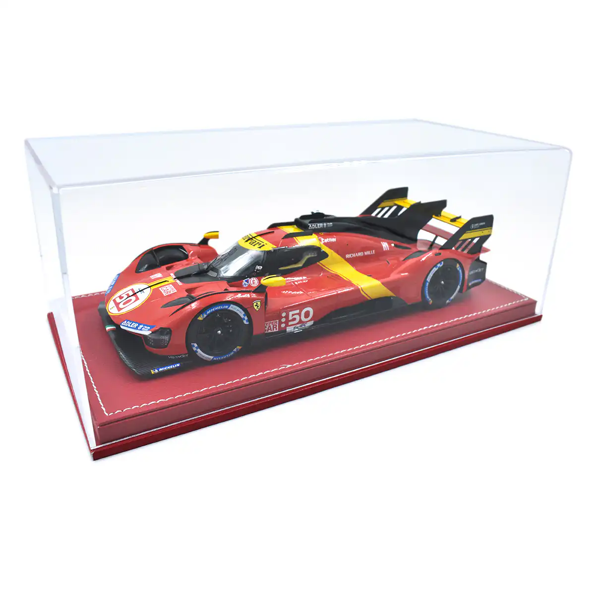 Exhibidor de acrílico de alta calidad con base de piel en color rojo y stitching en hilo blanco. Protege tu preciado coche de polvo y daños, mientras lo exhibes en este display perfecto para autos a escala 1:18.