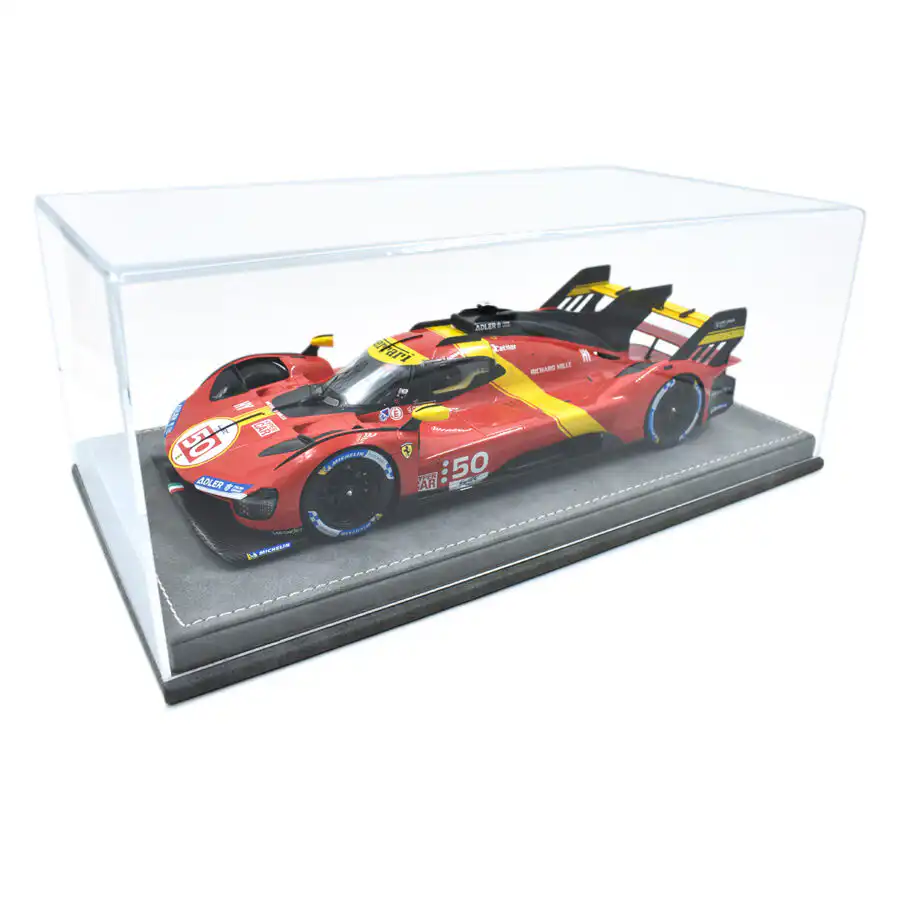 Exhibidor de acrílico de alta calidad con base de piel en color gris y stitching en hilo blanco. Protege tu preciado coche de polvo y daños, mientras lo exhibes en este display perfecto para autos a escala 1:18.