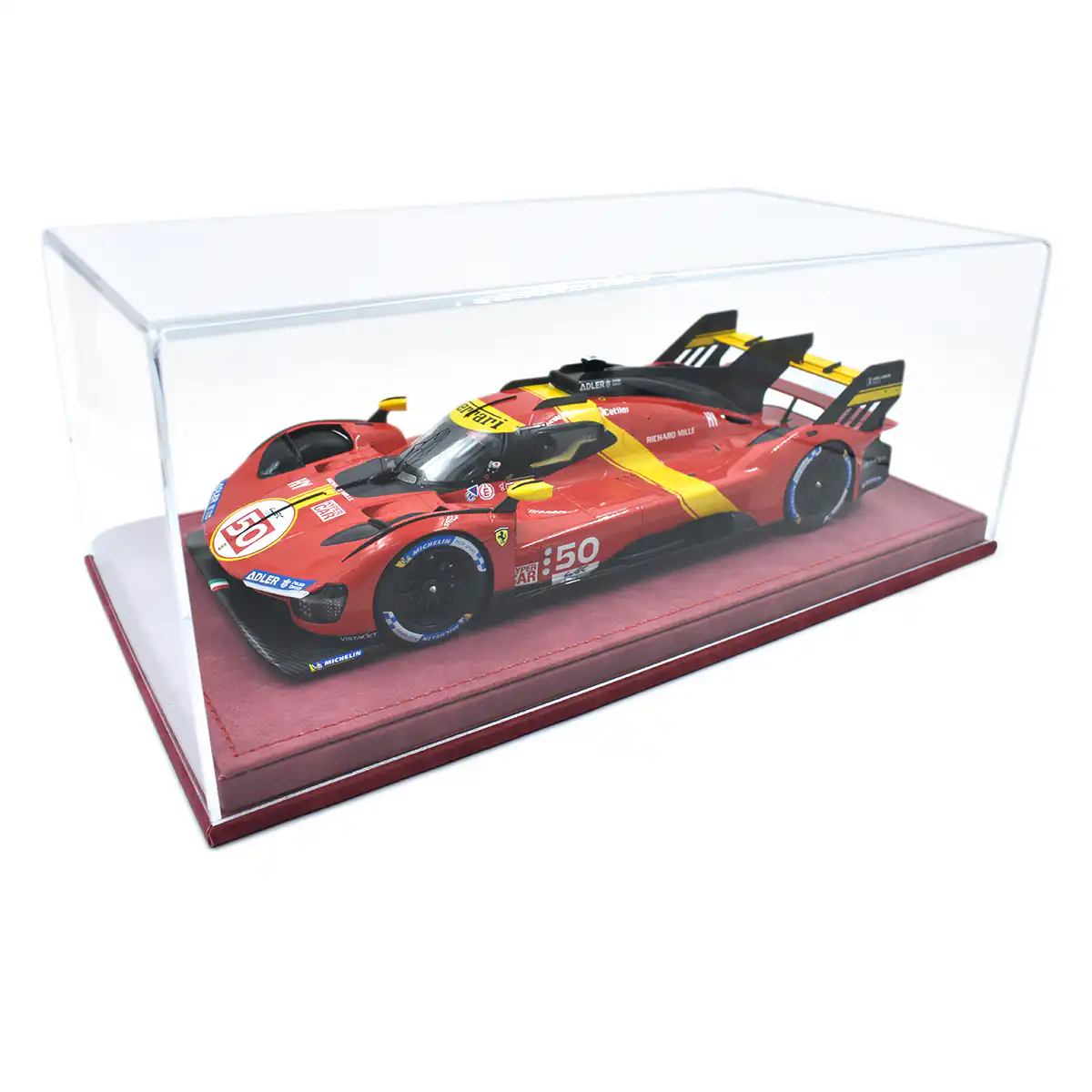 Exhibidor de acrílico de alta calidad con base de piel en color rojo y stitching en hilo rojo. Protege tu preciado coche de polvo y daños, mientras lo exhibes en este display perfecto para autos a escala 1:18.