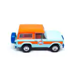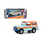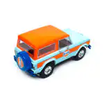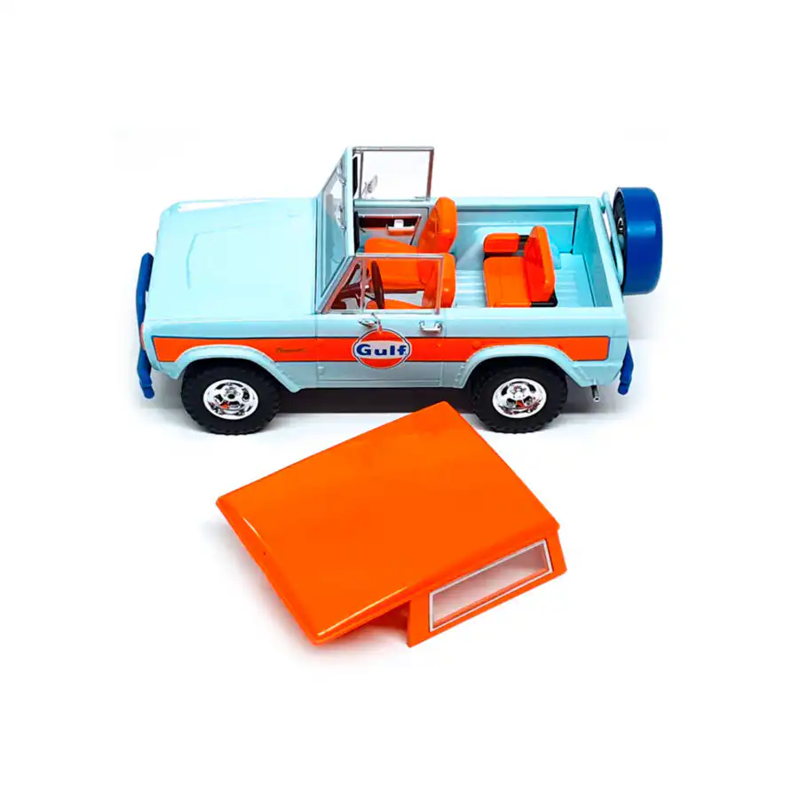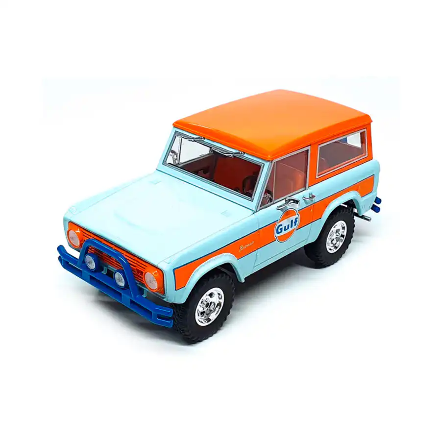 Ford Bronco 1966 Descapotable de Edición Limitada “Gulf Oil” hecho por la marca Greenlight. Este modelo de auto a escala fabricado en alta calidad cuenta con techo descapotable, llantas de goma y es perfecto para coleccionistas y fanáticos de la marca Ford.