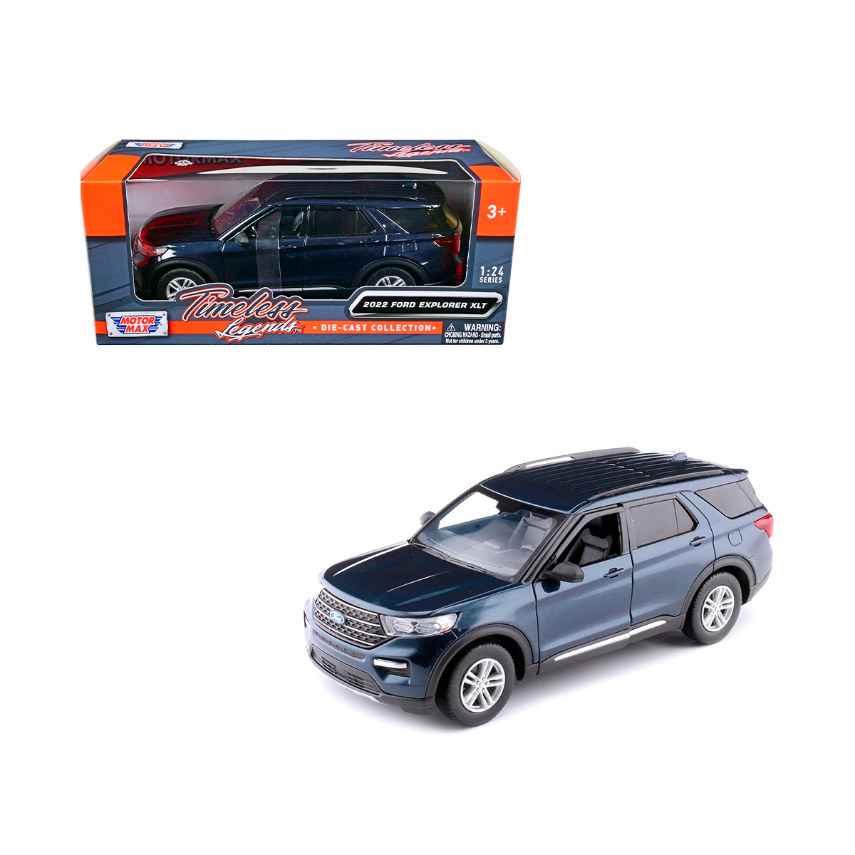 Ford Explorer XLT 2022 en color azul de Edición Especial «Timeless Legends » hecho por la marca Motor Max. Este modelo de auto a escala fabricado en alta calidad tiene puertas delanteras que se abren, llantas de goma y es perfecto para coleccionistas y fanáticos de Ford.