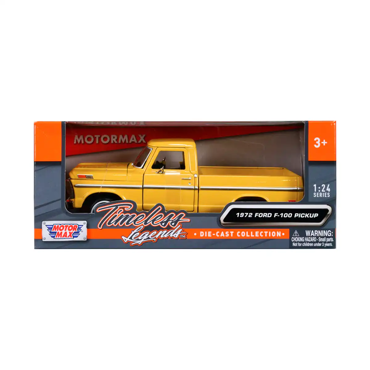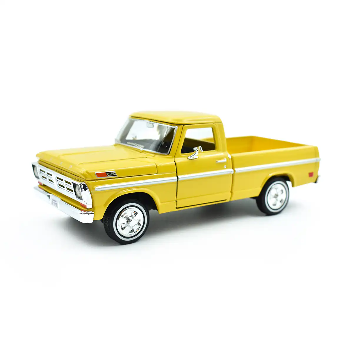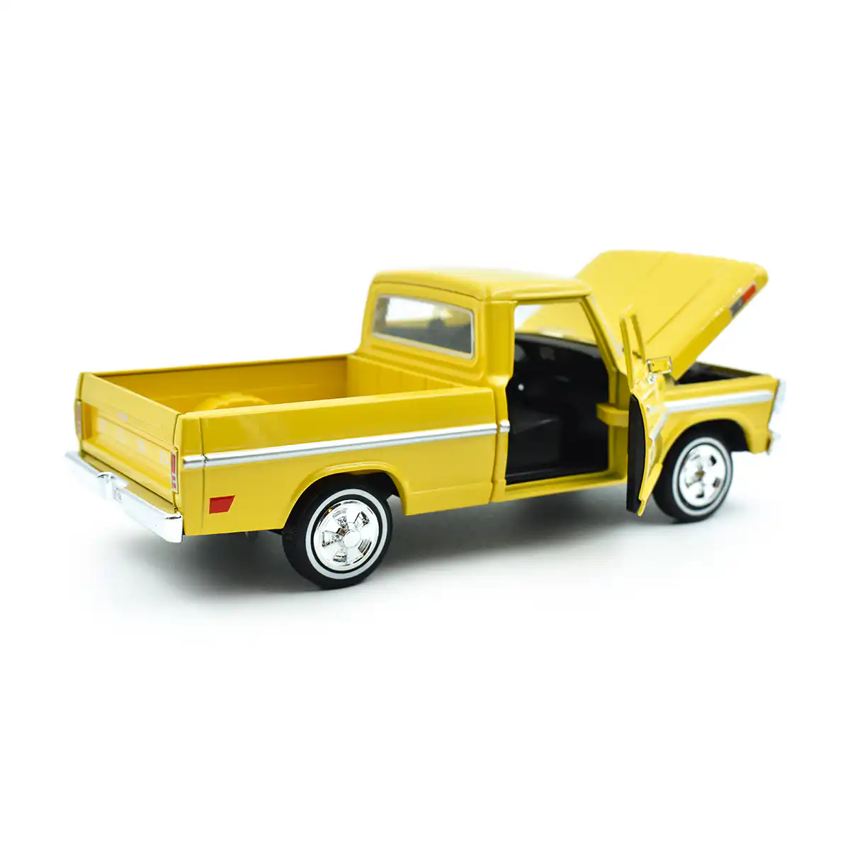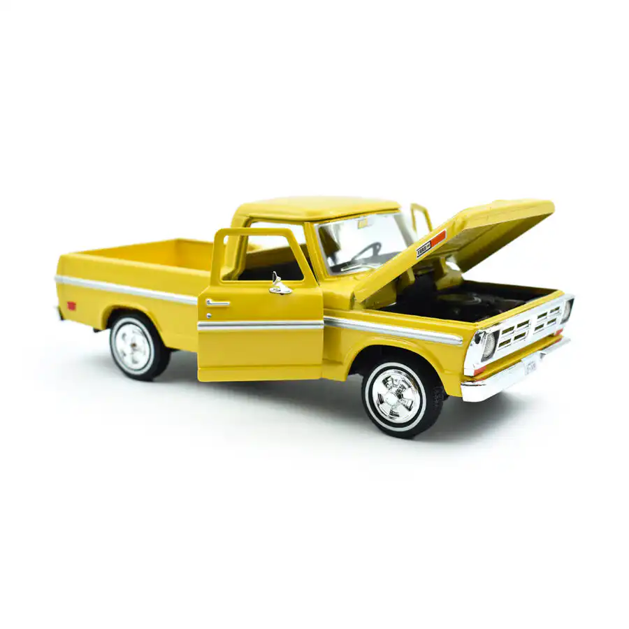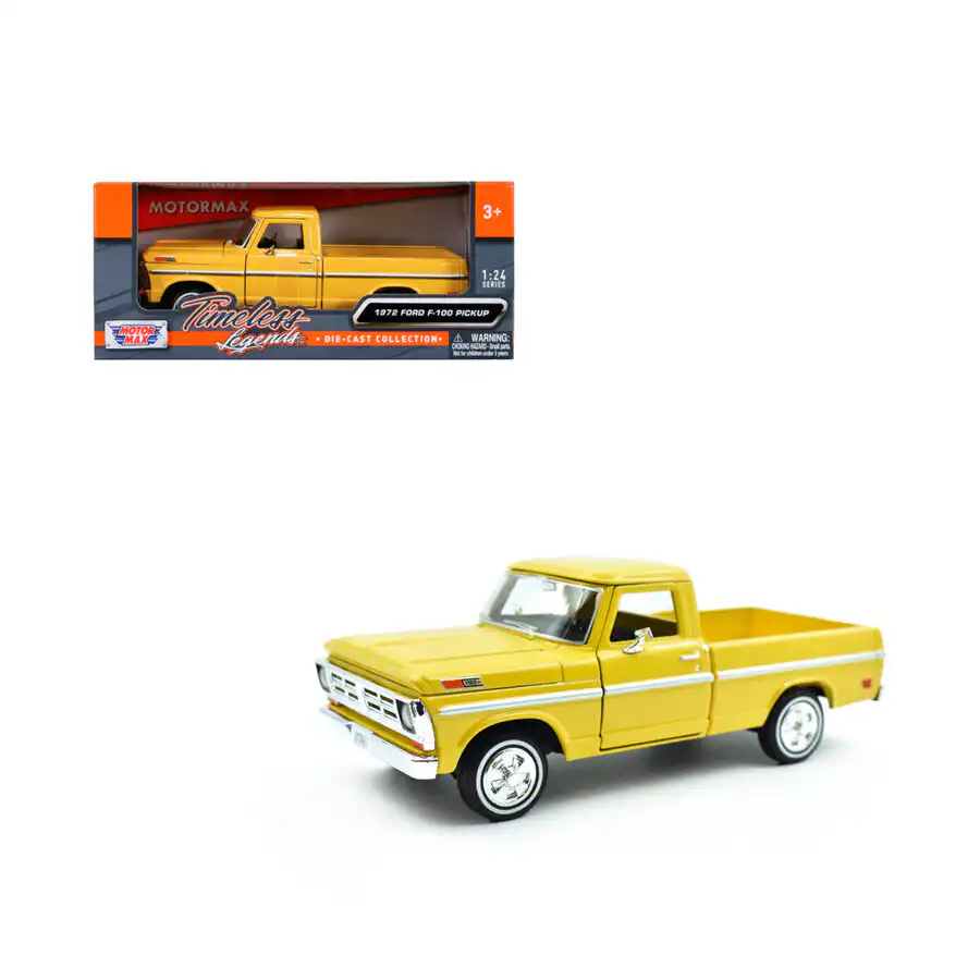 Ford F-100 Pickup 1972 en color amarillo de Edición Especial «Timeless Legends » hecho por la marca Motor Max. Este modelo de auto a escala fabricado en alta calidad tiene cofre y puertas delanteras que se abren, llantas de goma y es perfecto para coleccionistas y fanáticos de Ford.