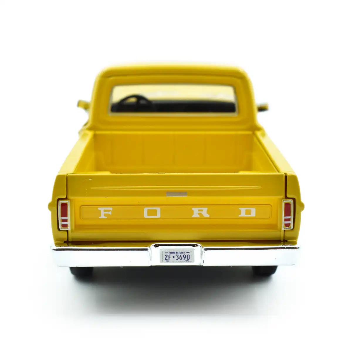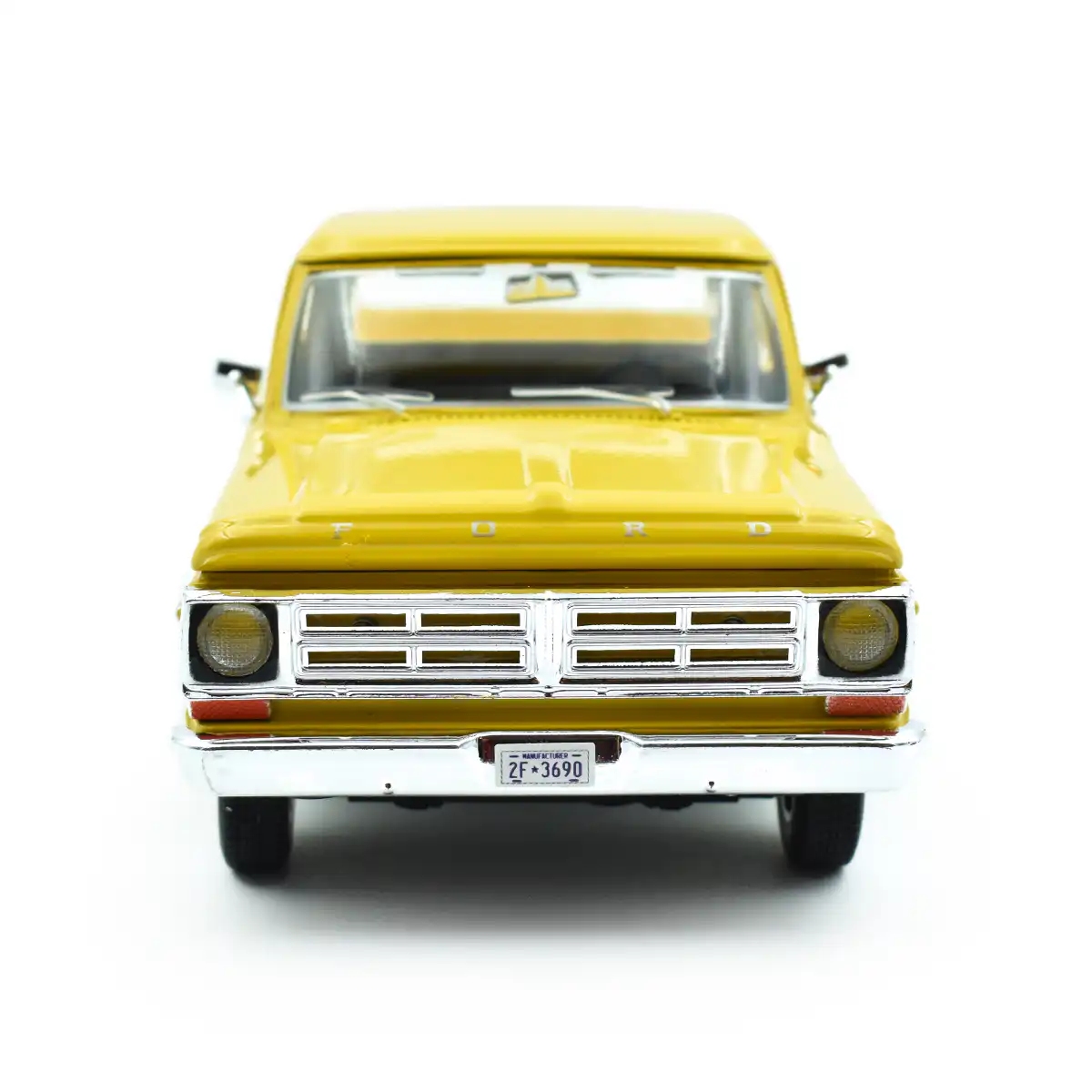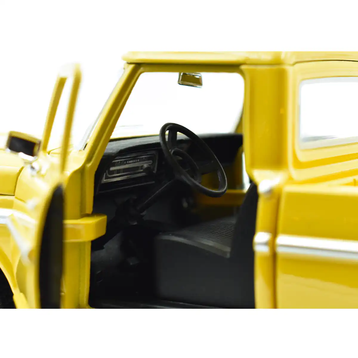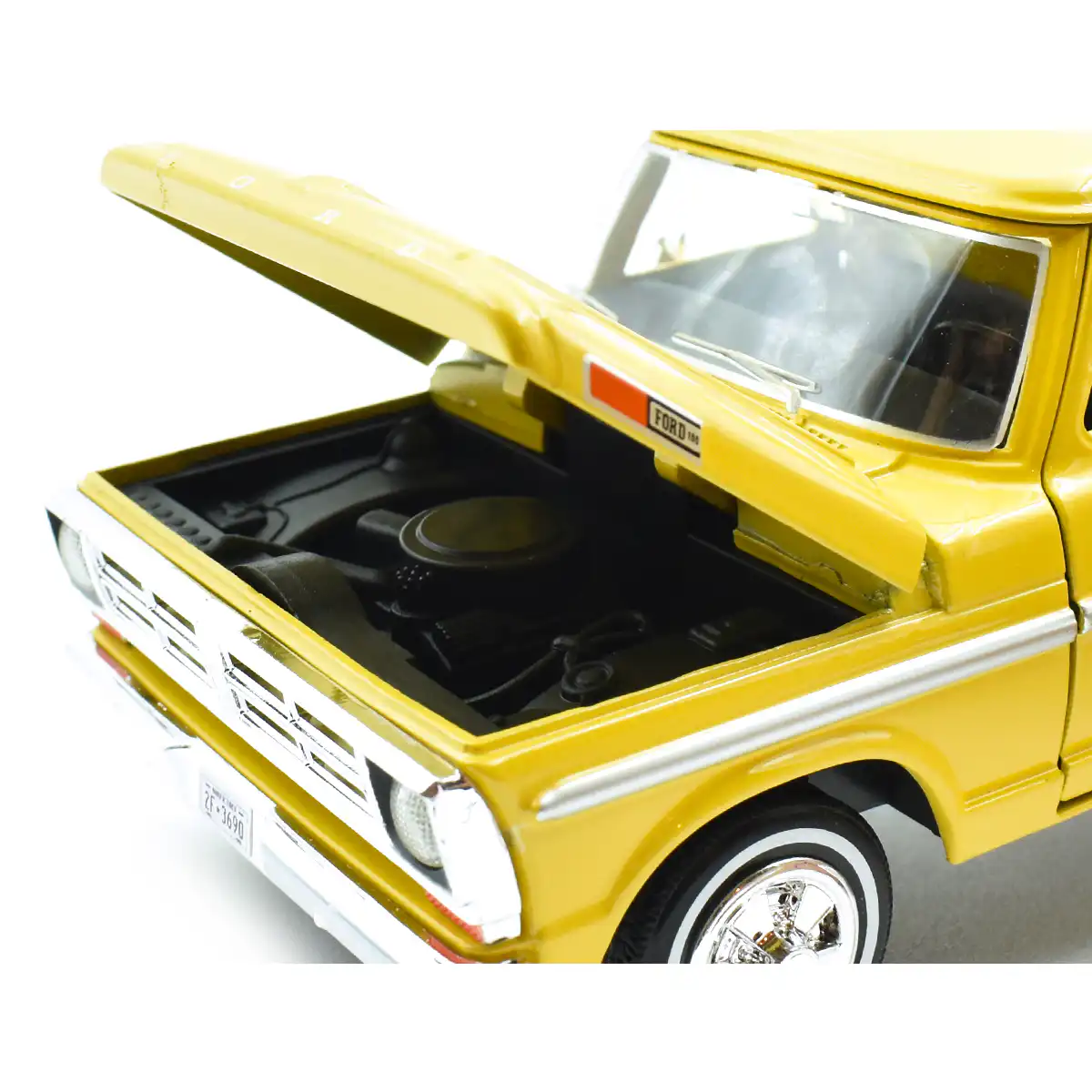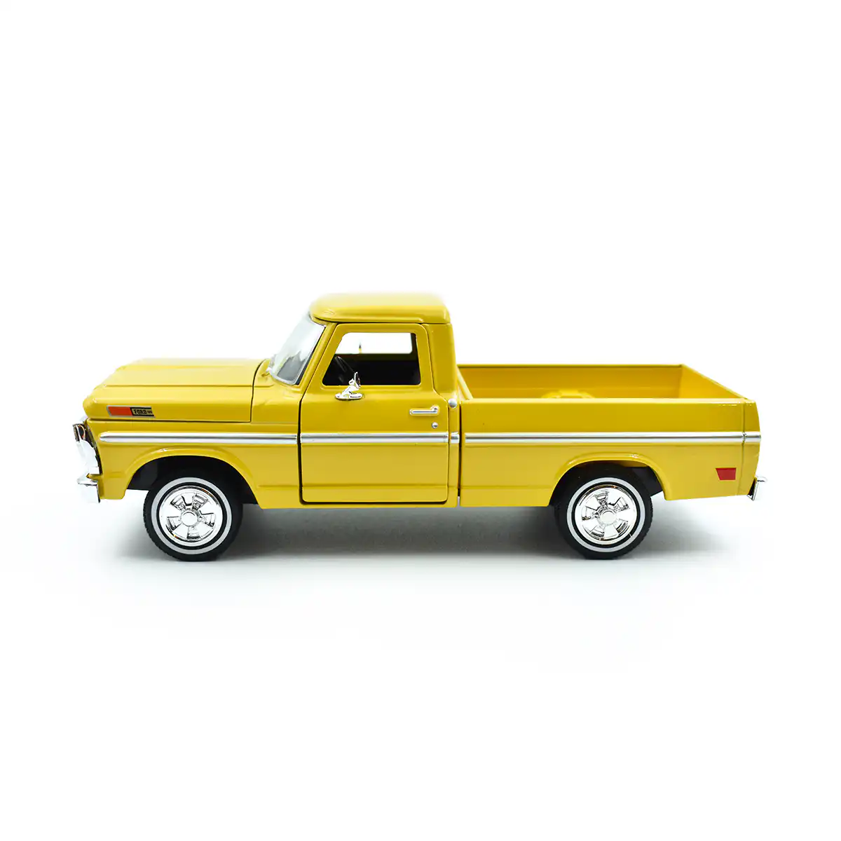 Ford F-100 Pickup 1972 en color amarillo de Edición Especial «Timeless Legends » hecho por la marca Motor Max. Este modelo de auto a escala fabricado en alta calidad tiene cofre y puertas delanteras que se abren, llantas de goma y es perfecto para coleccionistas y fanáticos de Ford.