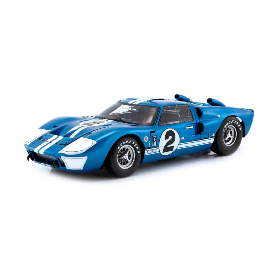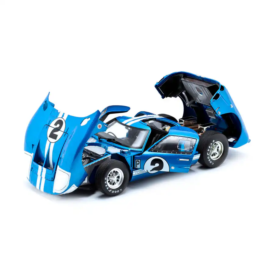 Ford GT-40 MK II 1966 en color azul de Edición Especial “Le Mans #2” hecho por la marca Shelby Collectibles. Este modelo de auto a escala fabricado en alta calidad tiene puertas, cofre y cajuela que se abren, llantas de goma y es perfecto para coleccionistas y fanáticos de la marca Ford.