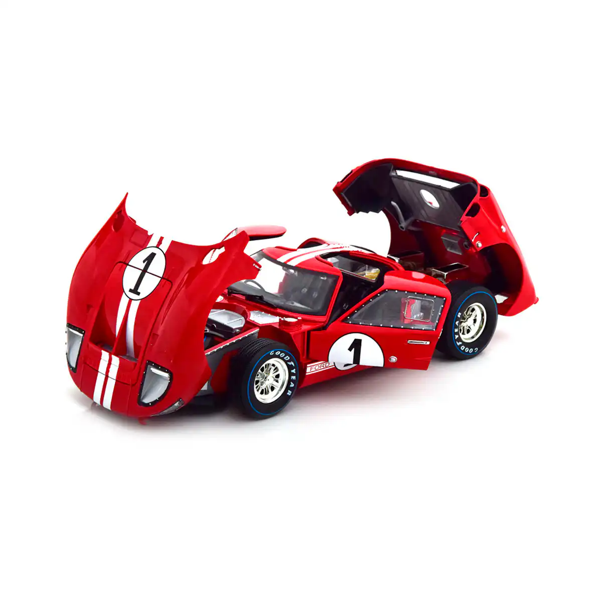 Ford GT-40 MK II 1966 en color rojo de Edición Especial “Le Mans #1” hecho por la marca Shelby Collectibles. Este modelo de auto a escala fabricado en alta calidad tiene puertas, cofre y cajuela que se abren, llantas de goma y es perfecto para coleccionistas y fanáticos de la marca Ford.