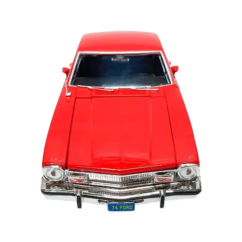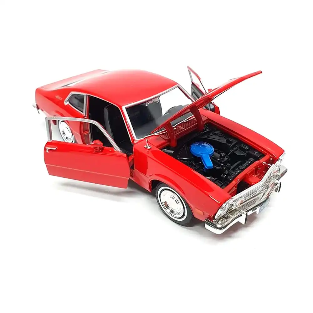 Ford Maverick 1974 en color rojo de edición especial hecho por la marca Motor Max. Este modelo de auto a escala fabricado en alta calidad cuenta con puertas y cofre que se abren, llantas de goma y es perfecto para coleccionistas y fanáticos de Ford.