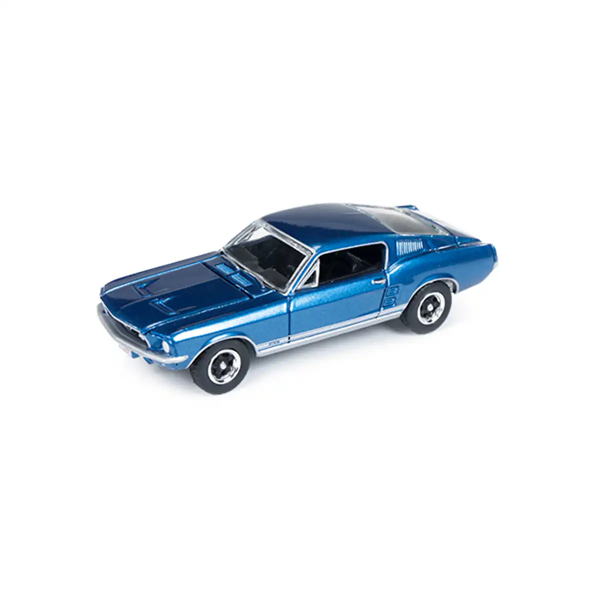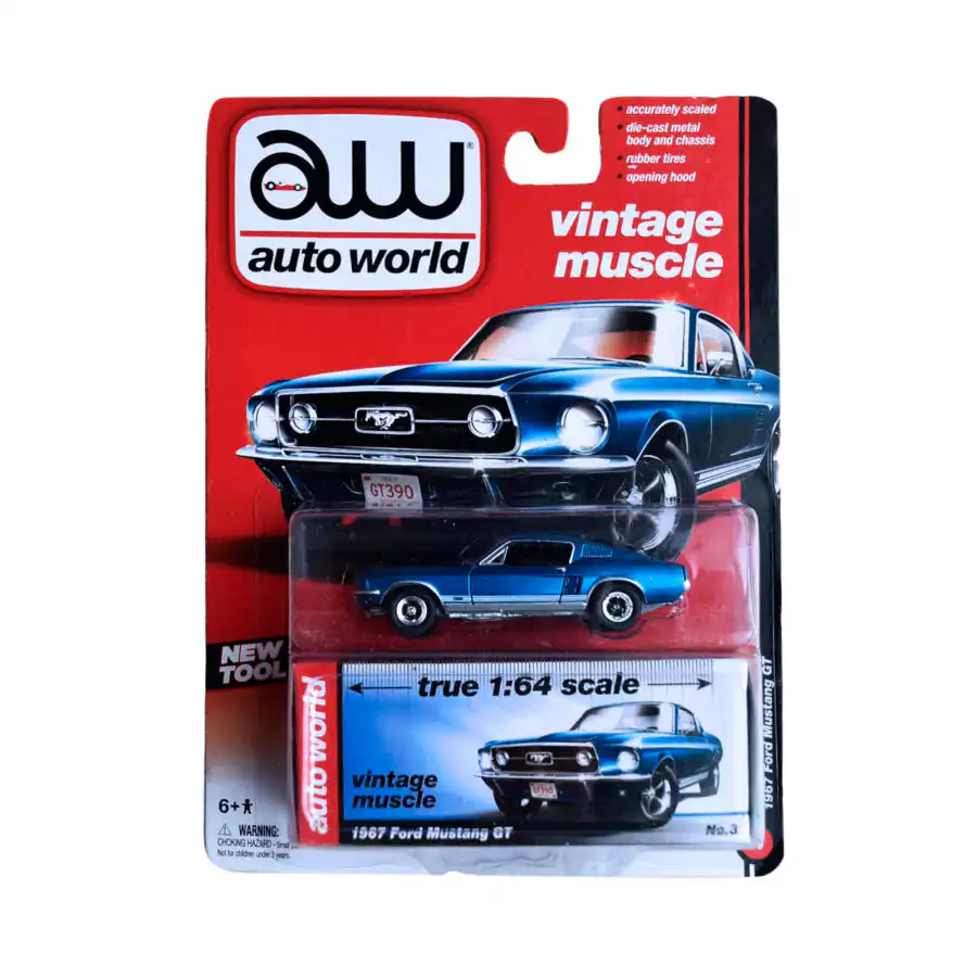 Ford Mustang GT 1967 en color azul de Edición Limitada “Vintage Muscle” hecho por la marca Auto World. Este modelo de auto a escala fabricado en alta calidad cuenta con cofre que se abre, llantas de goma, escala precisa y es perfecto para coleccionistas y fanáticos de Ford.