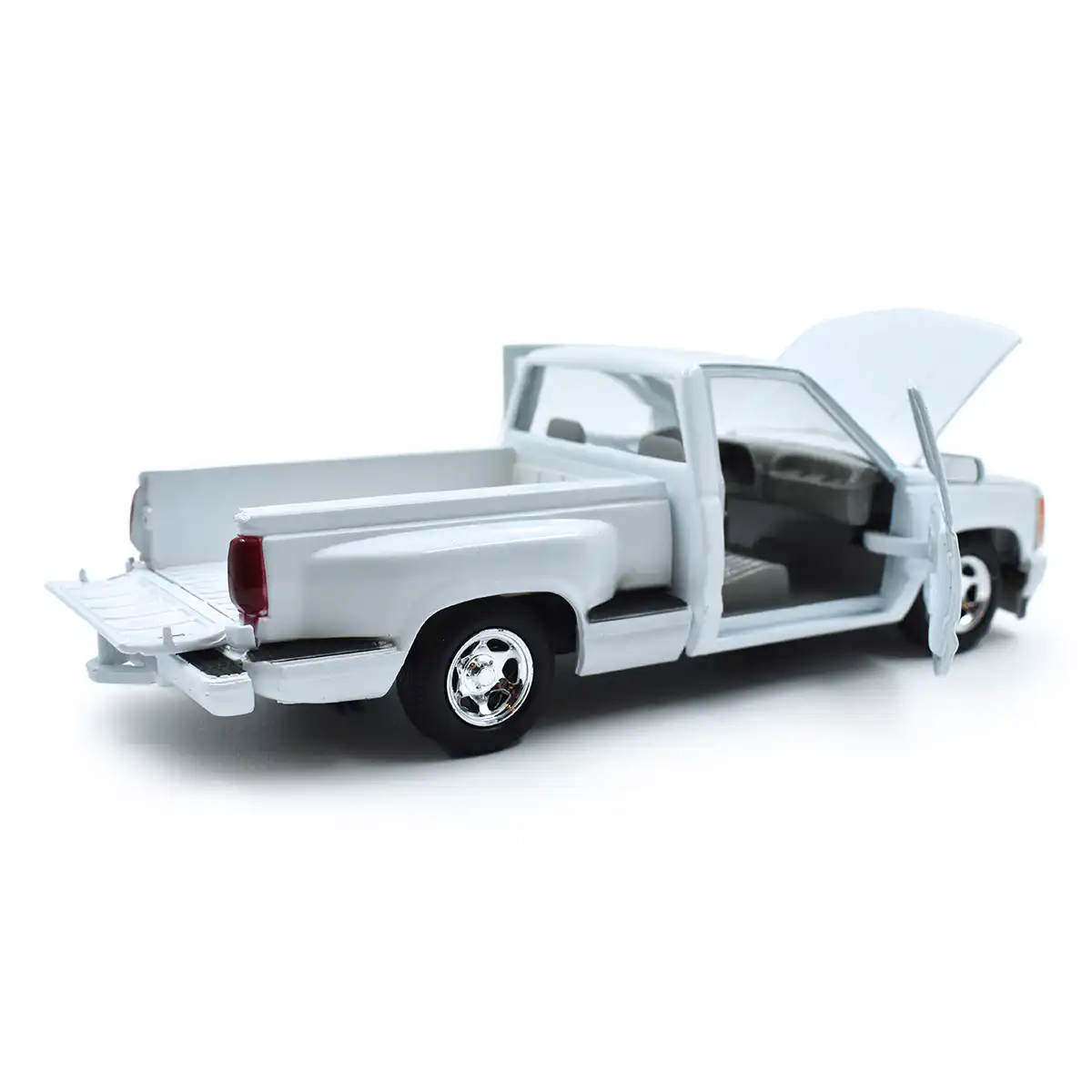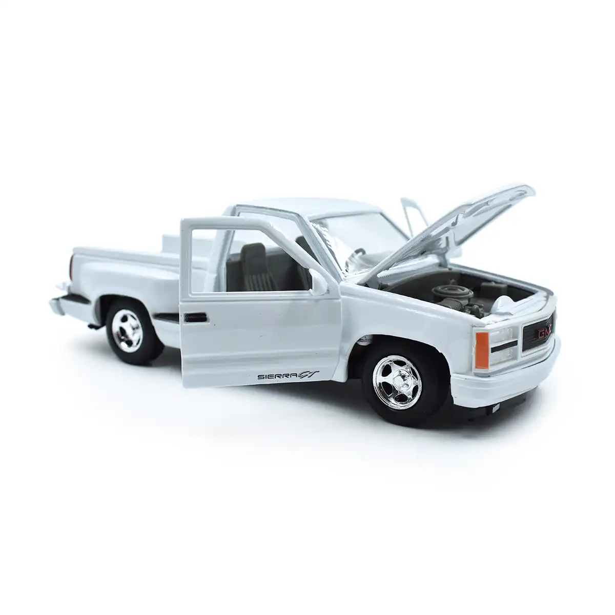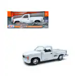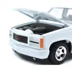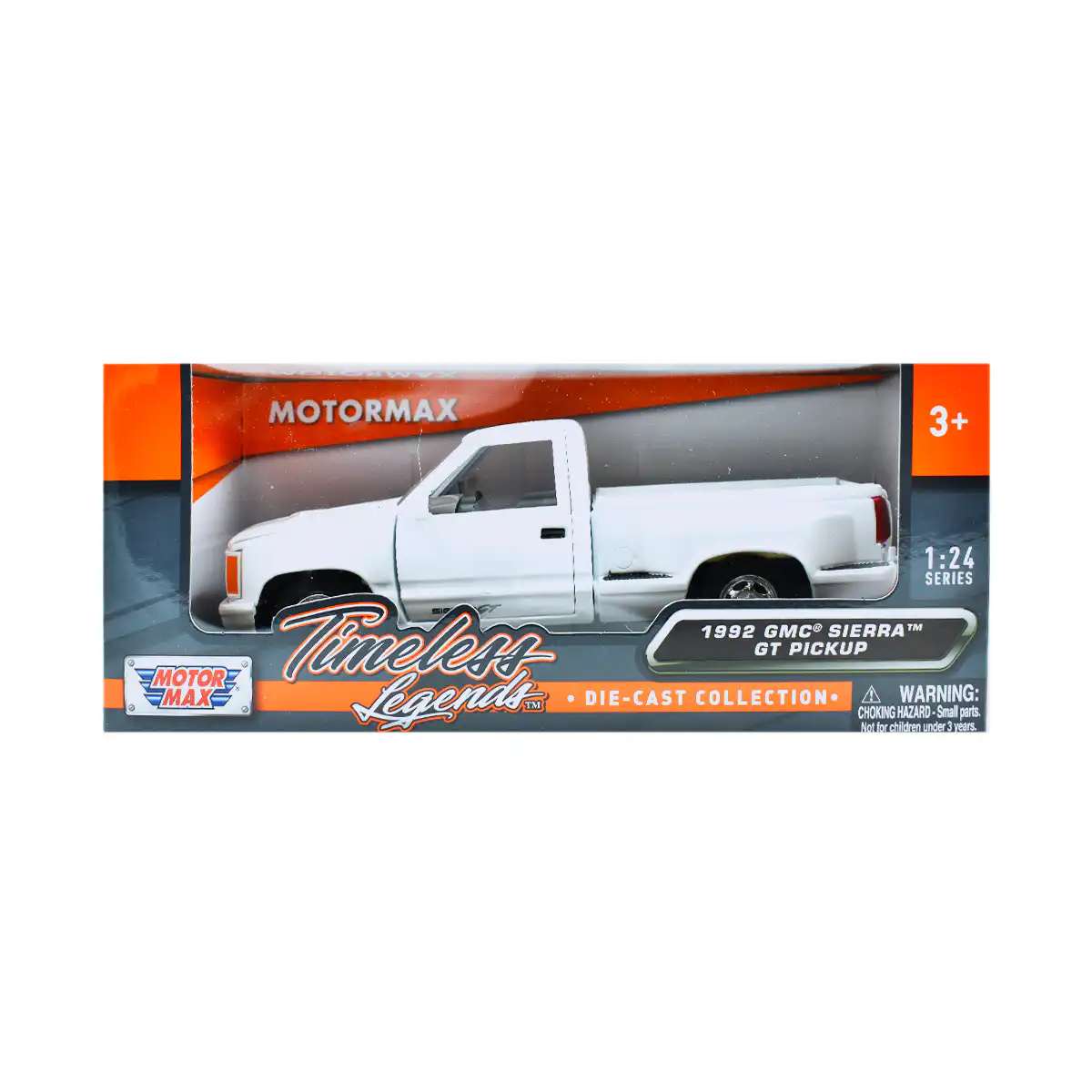 GMC Sierra GT Pickup 1992 en color blanco de Edición Especial “Timeless Legends” hecho por la marca Motor Max. Este modelo de auto a escala fabricado en alta calidad tiene puertas, cofre y batea que se abren, llantas de goma y es perfecto para coleccionistas y fanáticos de la marca GMC.