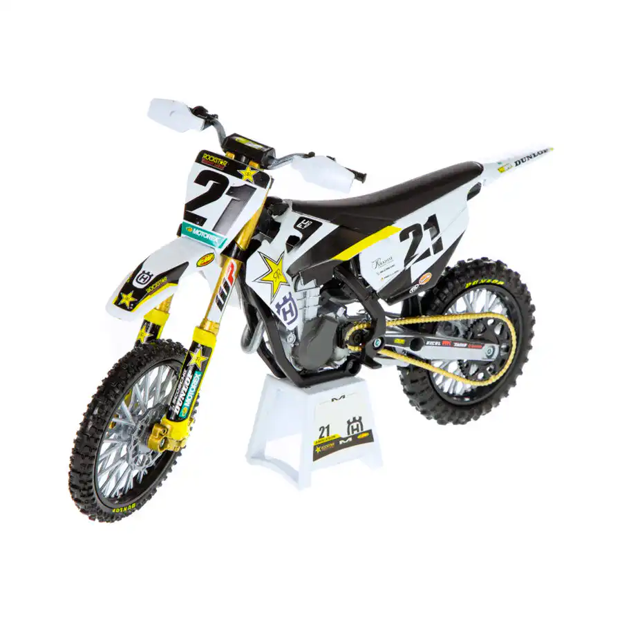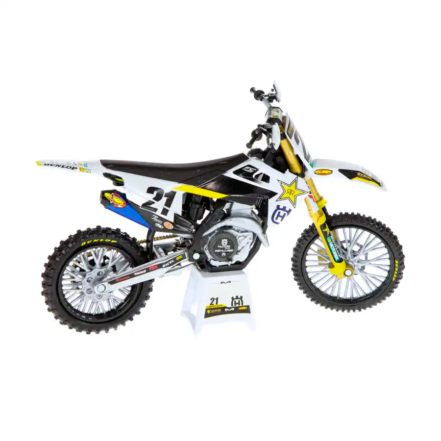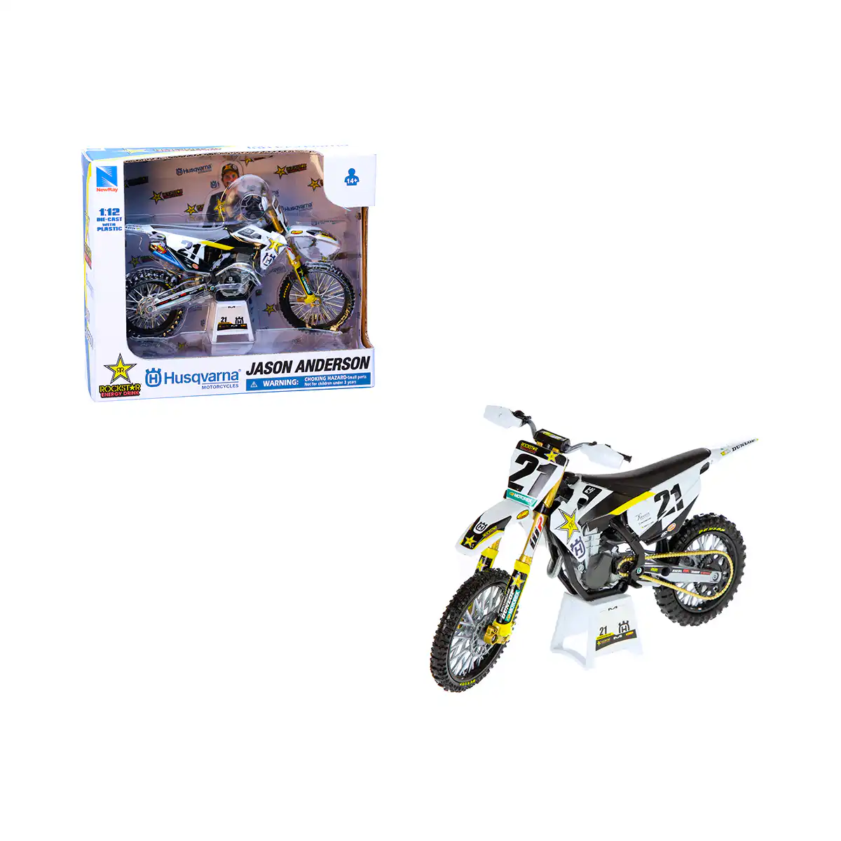 Husqvarna FC 450 de Edición Especial «Jason Anderson Rockstar Team» hecha por la marca New Ray. Este modelo de moto a escala fabricado en alta calidad tiene llantas de goma y es perfecto para coleccionistas y fanáticos de Husqvarna.