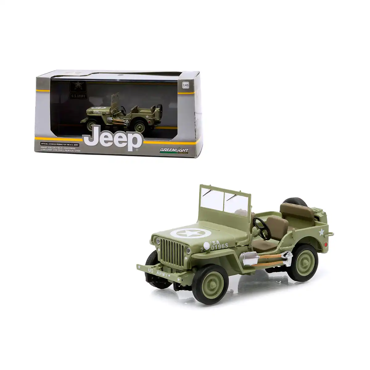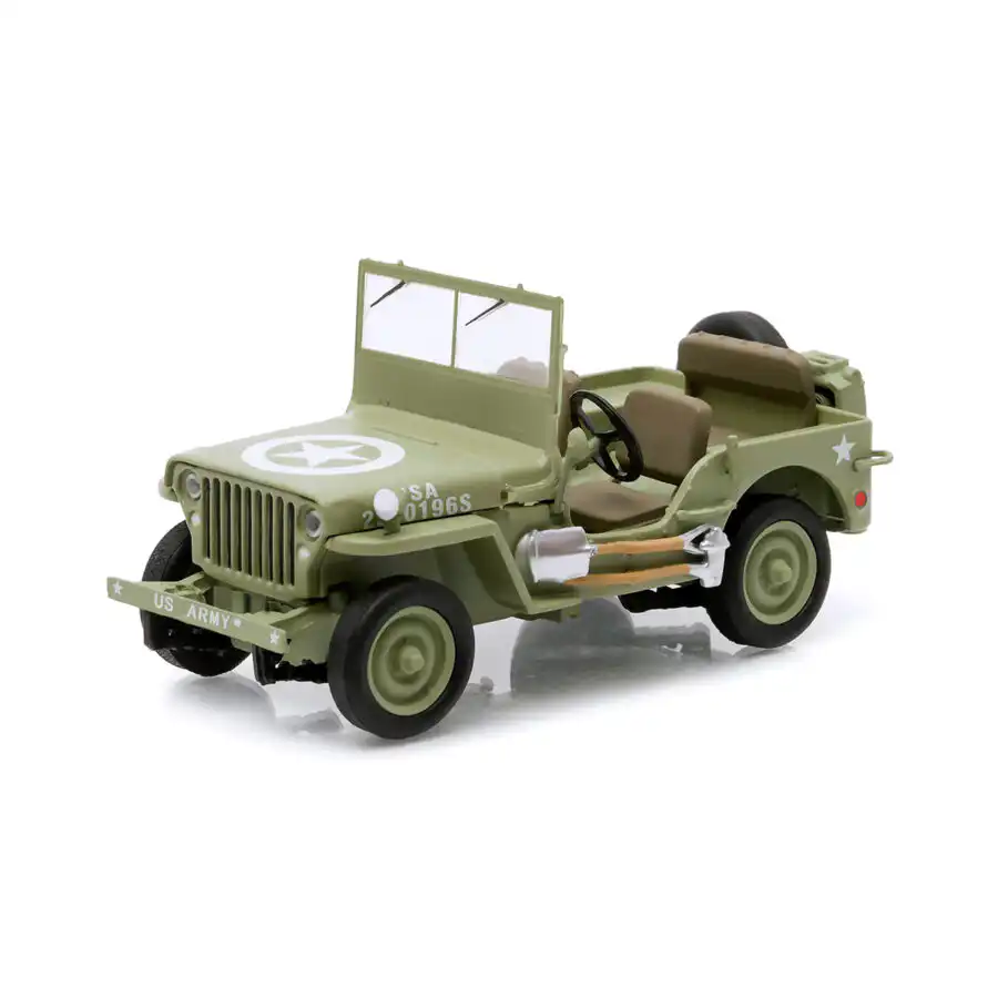 Jeep Willys MB C7 1944 de Edición Especial “U.S. Army” hecho por la marca Greenlight. Este modelo de auto a escala fabricado en alta calidad incluye una caja de acrílico, base de plástico, llantas de goma y es perfecto para coleccionistas y fanáticos de Jeep.