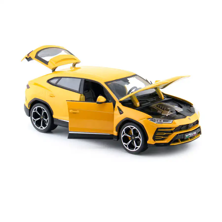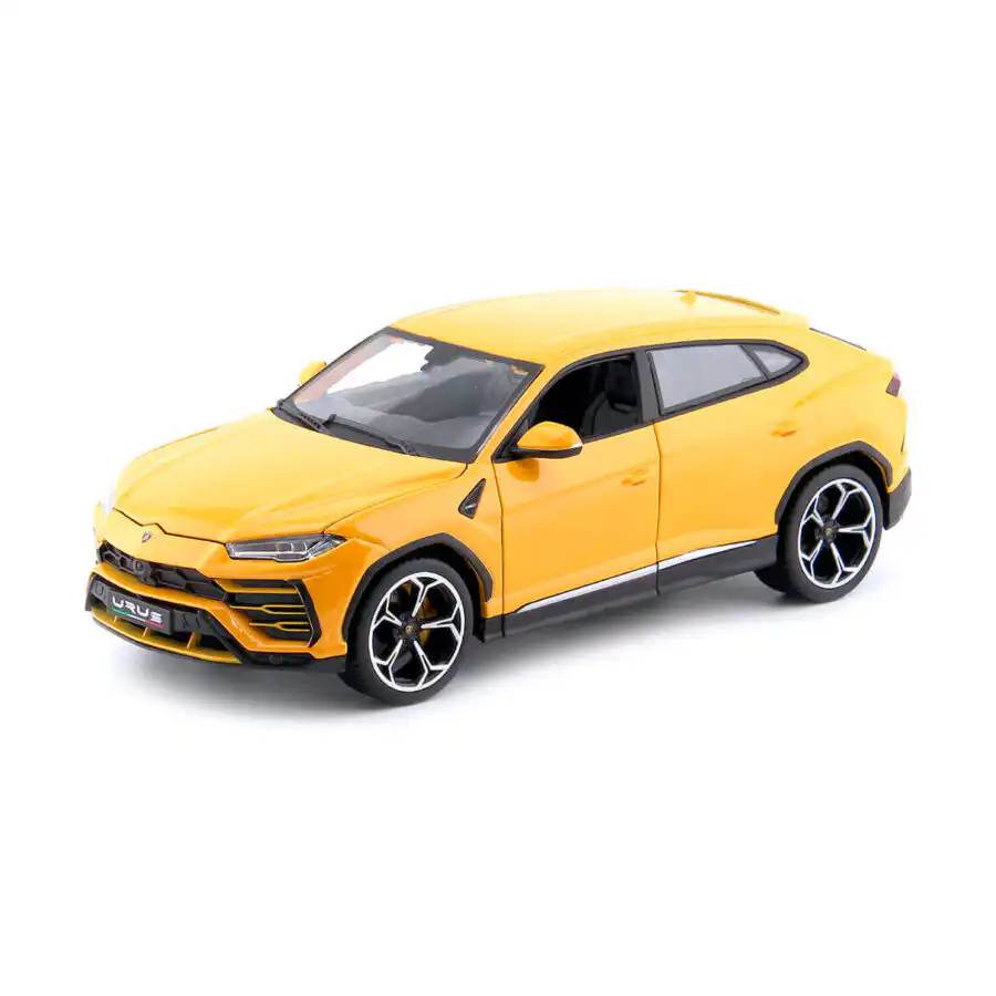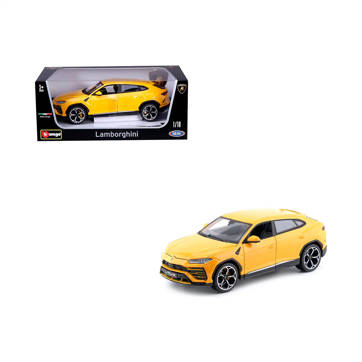 Lamborghini Urus 2018 en color amarillo de Edición Especial «Italian Design» Hecho por la marca Bburago. Este modelo de auto a escala fabricado en alta calidad cuenta con puertas, cofre y cajuela que se abren, llantas de goma y es perfecto para coleccionistas y fanáticos de Lamborghini.
