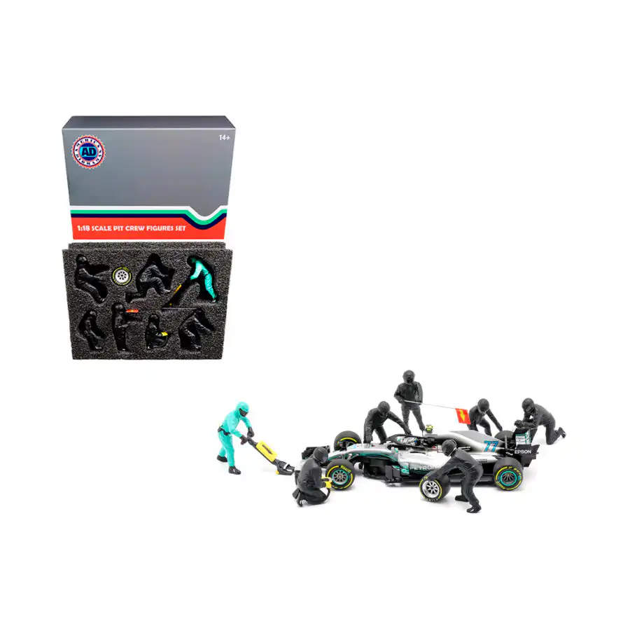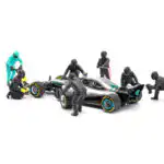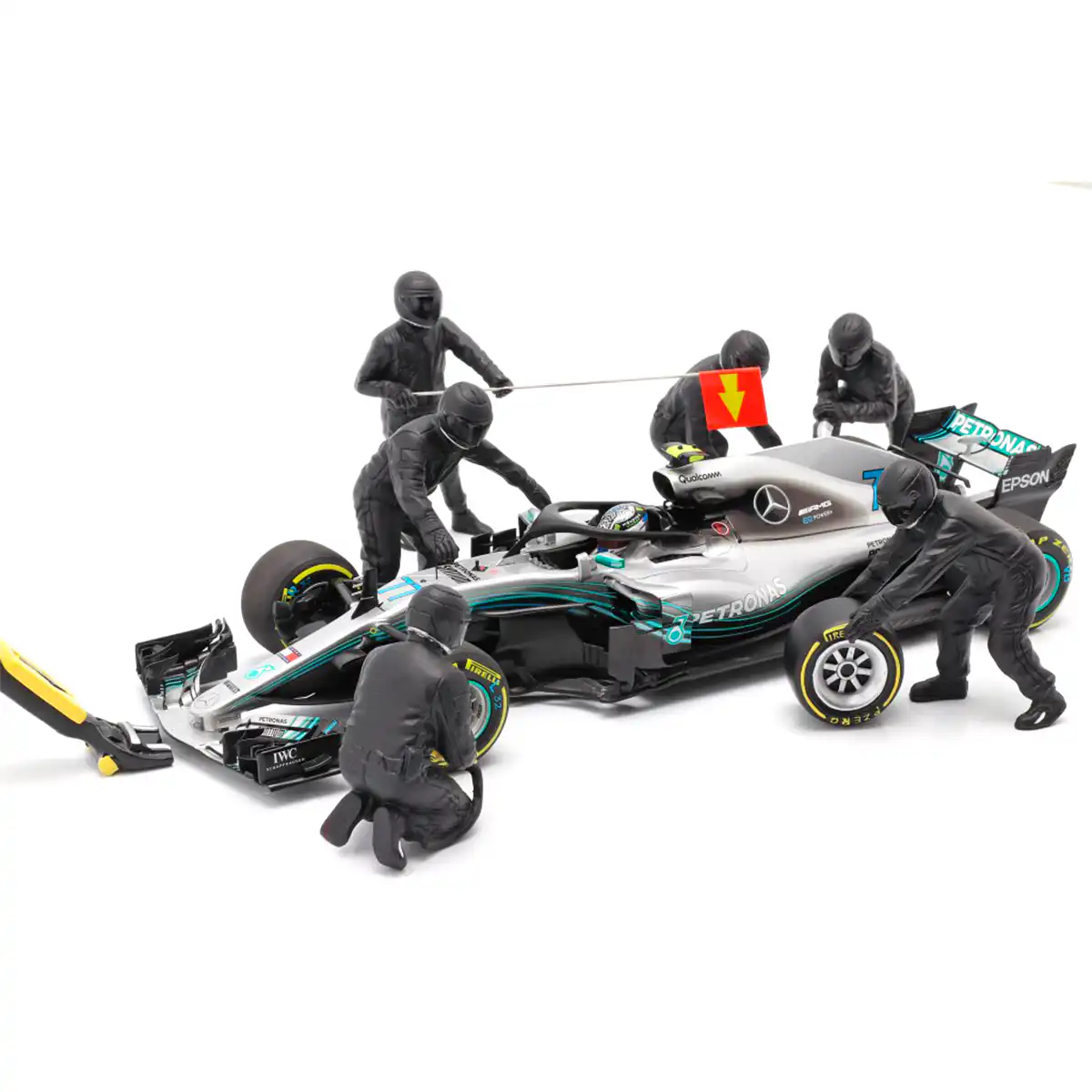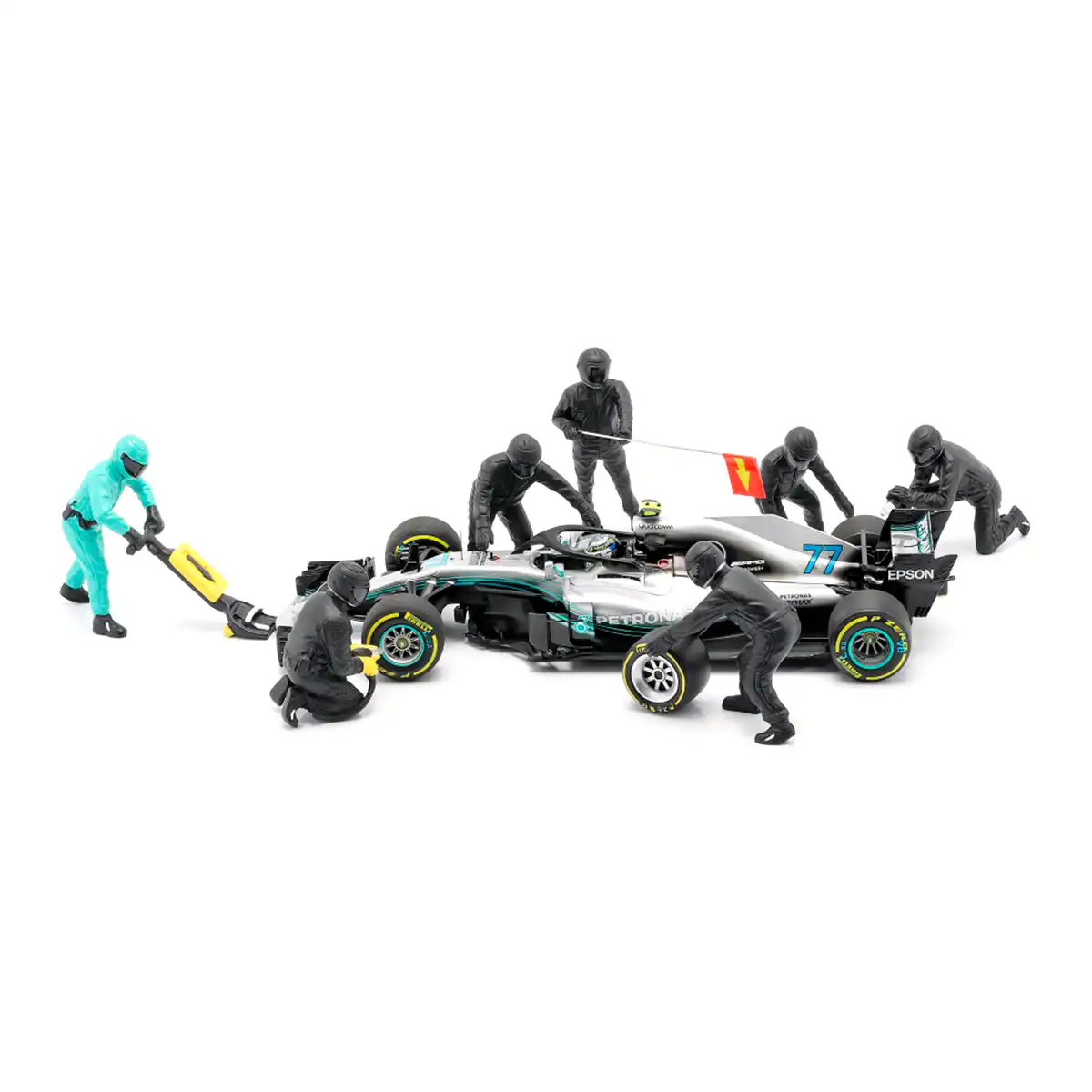 Set de el equipo de Pits de Edición Especial «Mercedes Petronas» de la Fórmula 1 que contiene 7 Figuras a escala 1:18 y una llanta.