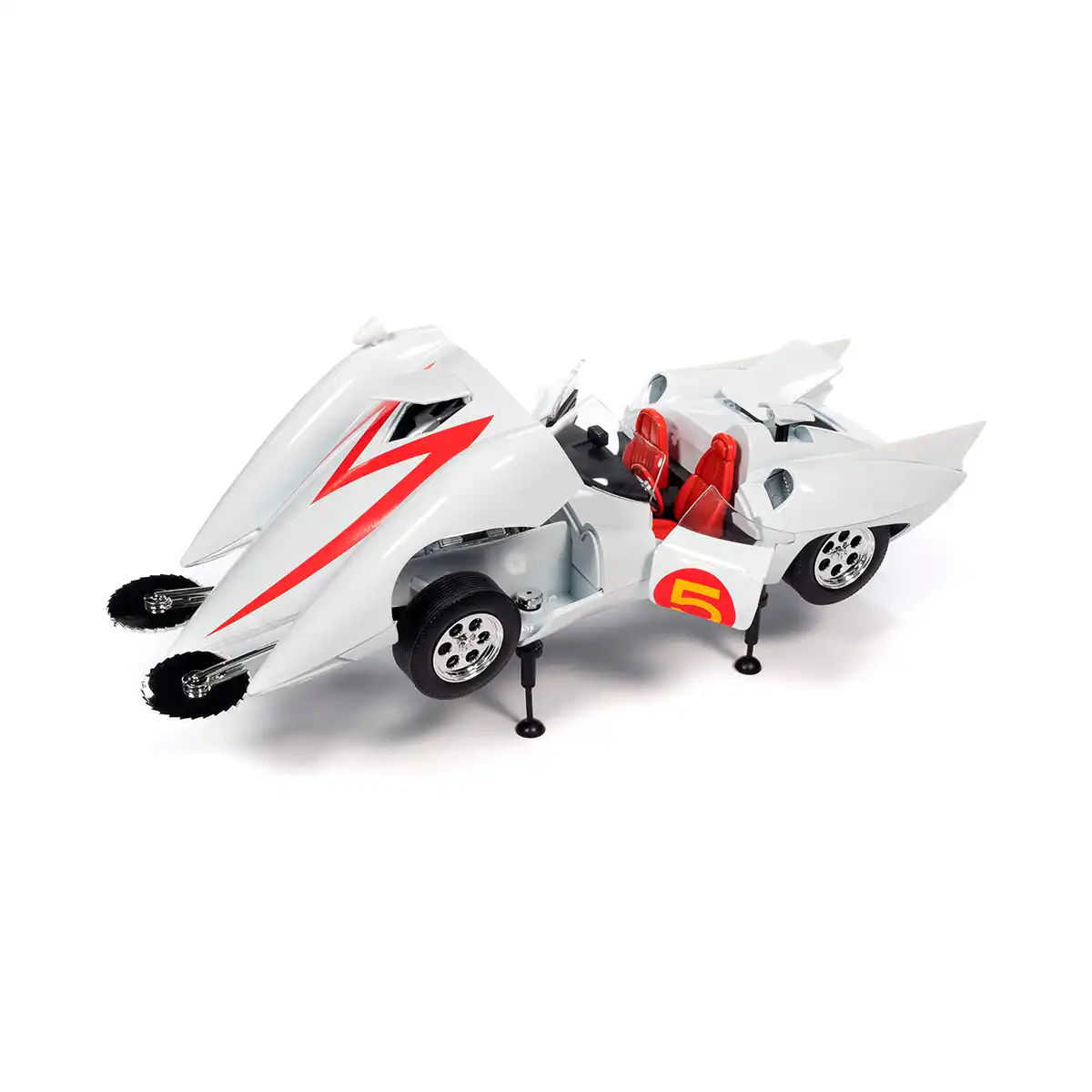 Mach 5 de Edición Especial “Meteoro Go / Speed Racer” hecho por la marca Auto World. Este modelo de auto a escala fabricado en alta calidad tiene puertas, cofre y cabina trasera que se abren, incluye 2 figuras coleccionables, llantas de goma y es perfecto para coleccionistas y fanáticos de la serie Meteoro.