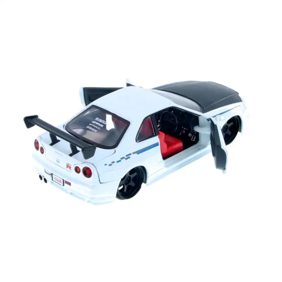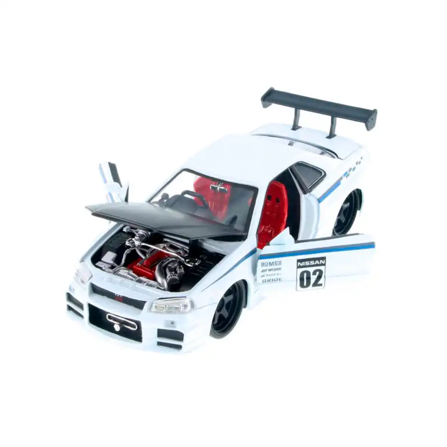 Nissan Skyline GTR R34 2002 en color blanco de Edición Especial “JDM Tuners” hecho por la marca Jada. Este modelo de auto a escala fabricado en alta calidad tiene puertas, cajuela y cofre que se abren, llantas de goma, es perfecto para coleccionistas y fanáticos de Nissan.