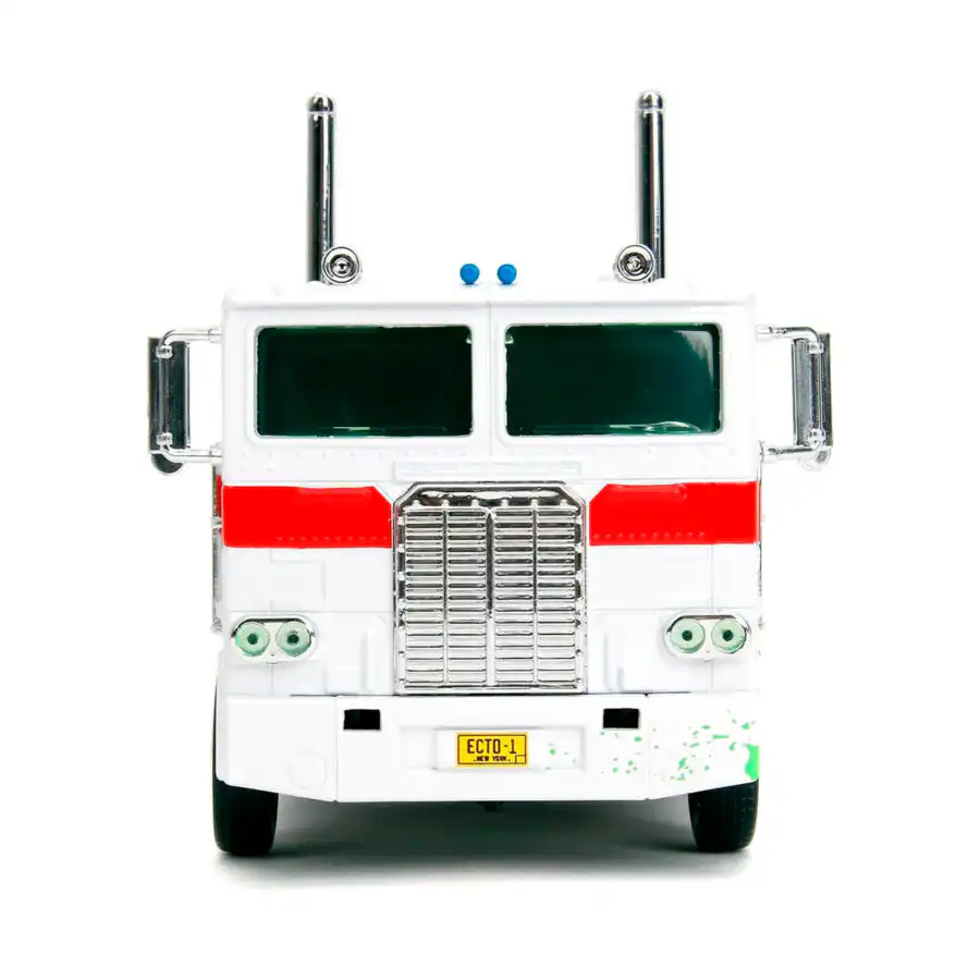 Optimus Prime de Edición Especial “Ghostbusters x Transformers” hecho por la marca Jada Toys. Este modelo de auto a escala fabricado en alta calidad tiene puertas que se abren, figura de robot en el fondo y llantas de goma.