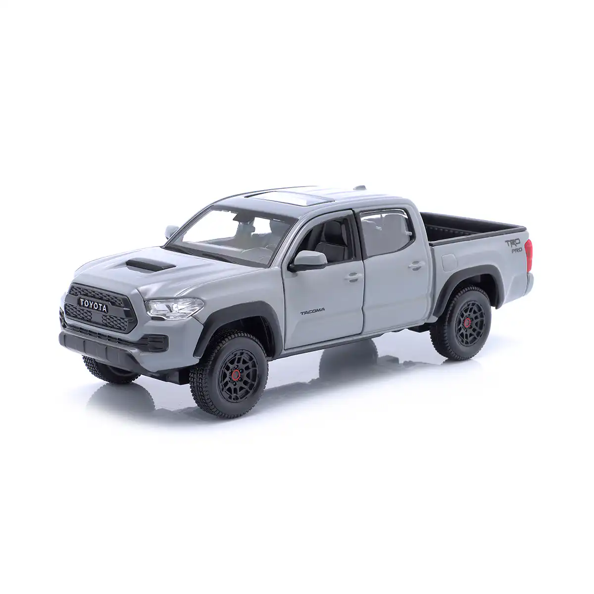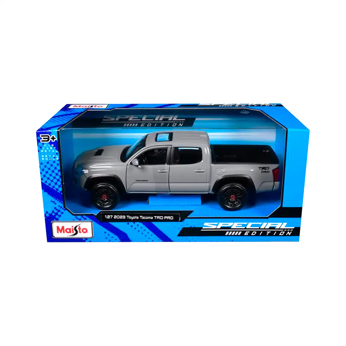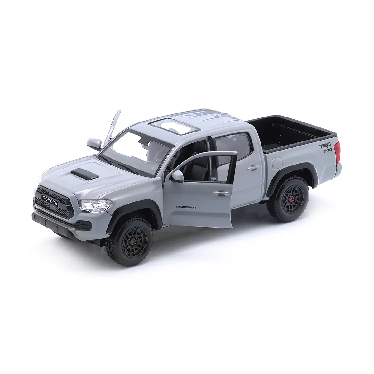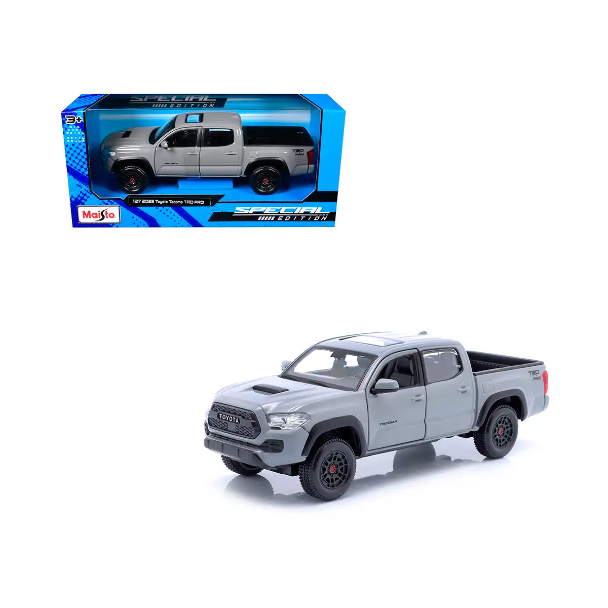 Toyota Tacoma TRD PRO 2023 Pickup en color gris de Edición Especial hecho por la marca Maisto. Este modelo de auto a escala fabricado en alta calidad tiene puertas delanteras que se abren, llantas de goma y es perfecto para coleccionistas y fanáticos de Toyota.