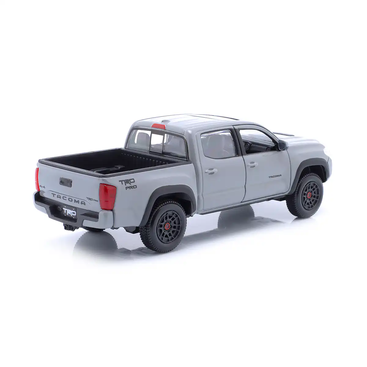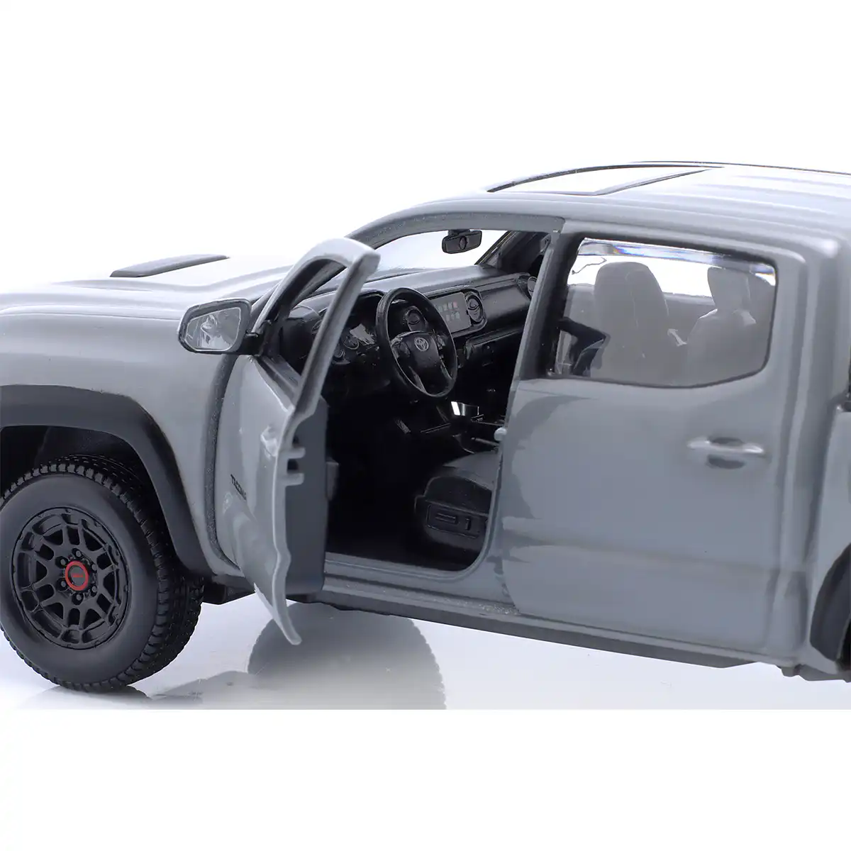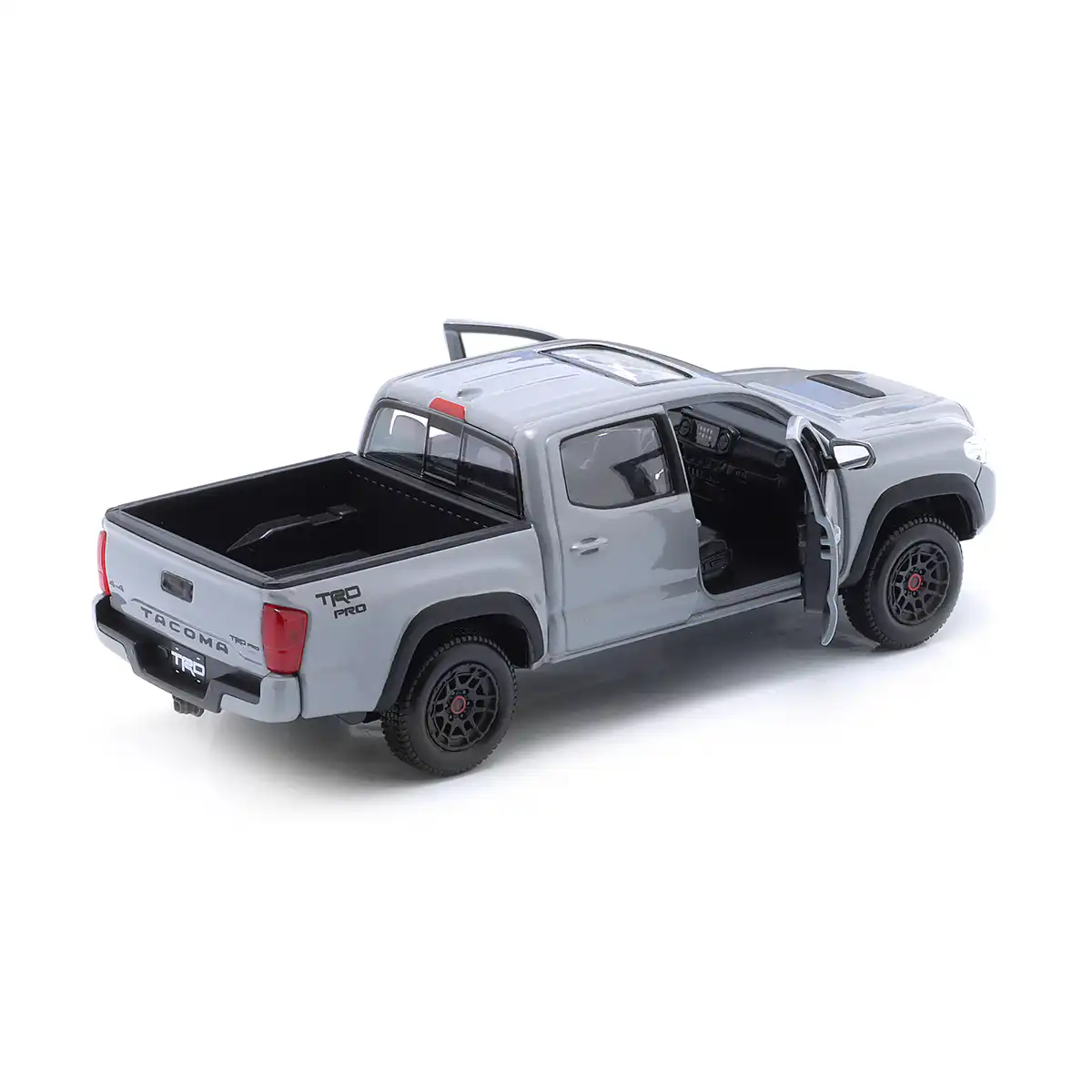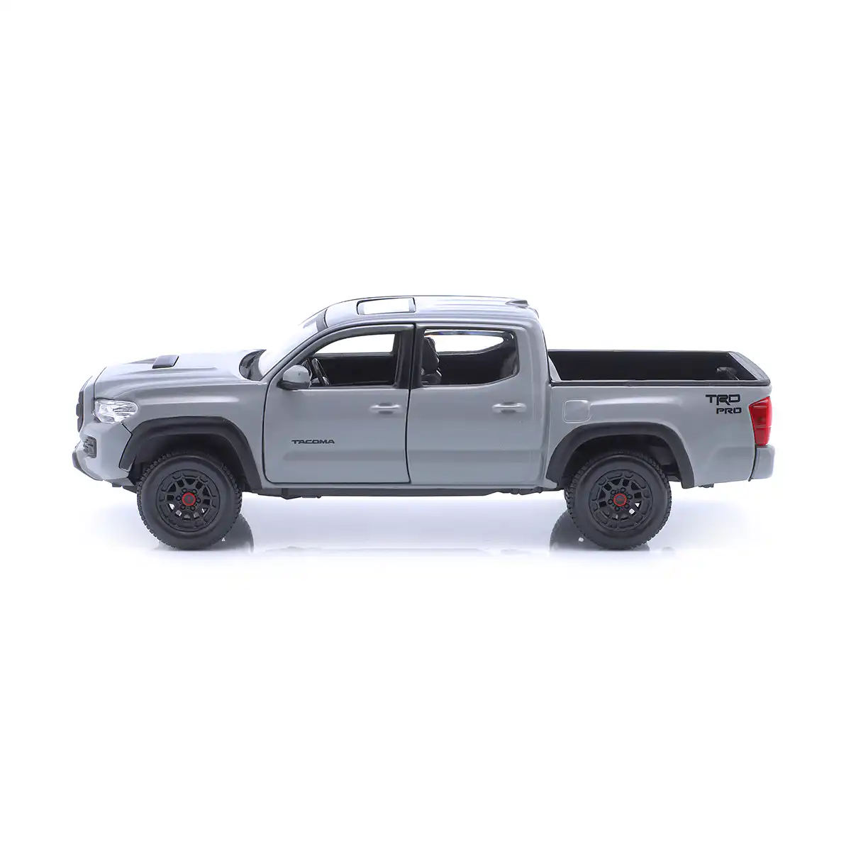 Toyota Tacoma TRD PRO 2023 Pickup en color gris de Edición Especial hecho por la marca Maisto. Este modelo de auto a escala fabricado en alta calidad tiene puertas delanteras que se abren, llantas de goma y es perfecto para coleccionistas y fanáticos de Toyota.