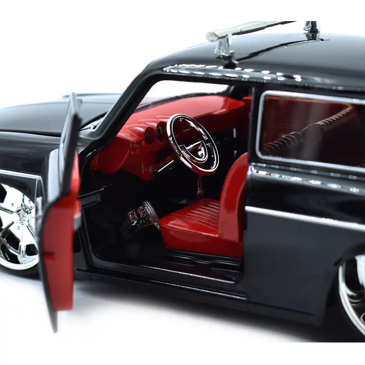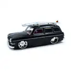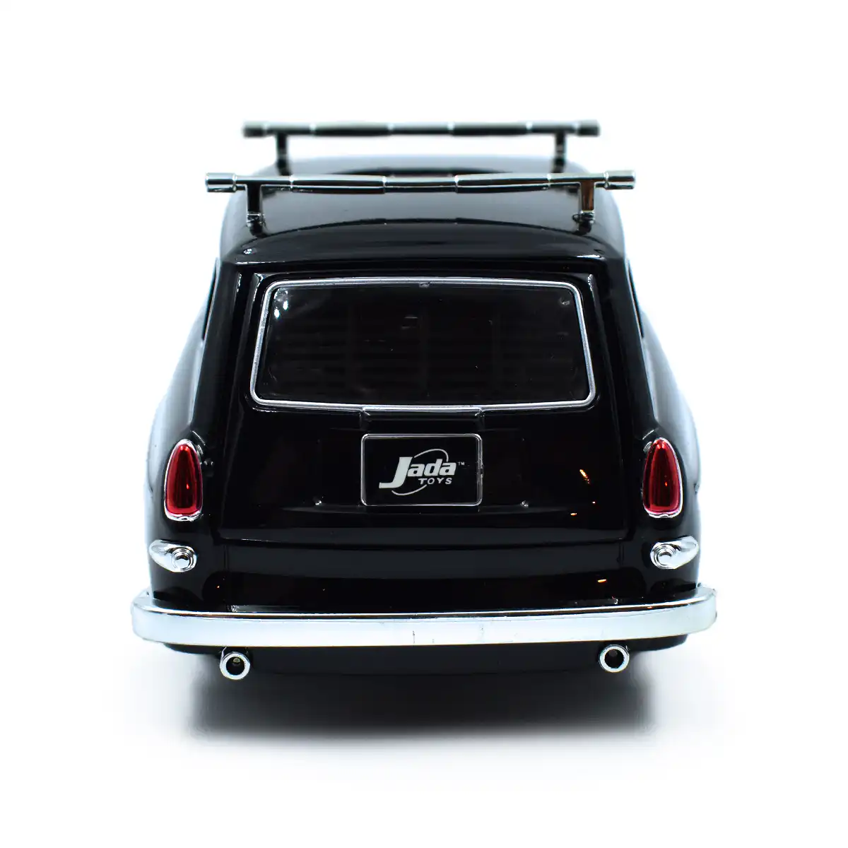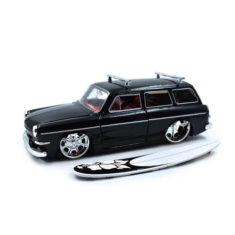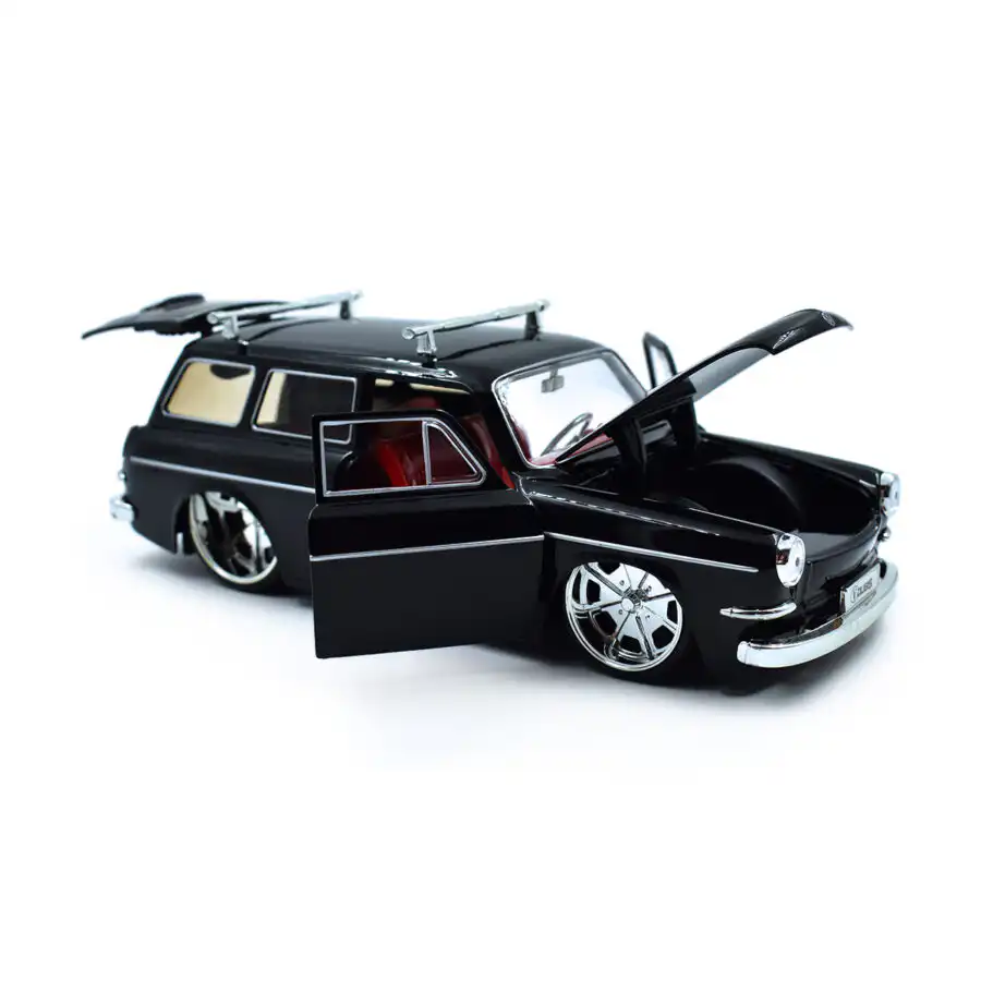 VW 1965 Variant Squareback de Edición Especial “V-Dubs” hecho por la marca Jada. Este modelo de auto a escala fabricado en alta calidad tiene puertas, cajuela y cofre que se abren, incluye una tablita de Surf, llantas de goma, es perfecto para coleccionistas y fanáticos de Volkswagen.