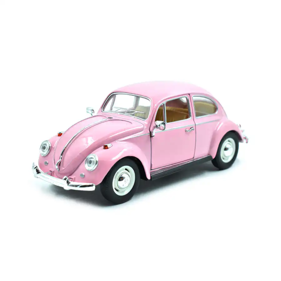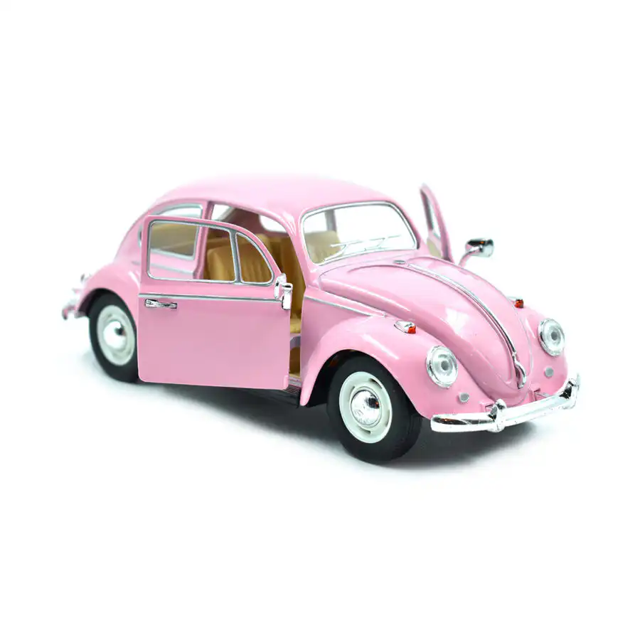 VW Beetle 1967 Vocho en color rosa, hecho por la marca Kinsmart. Este modelo de auto a escala fabricado en alta calidad tiene puertas que se abren, llantas de goma y es perfecto para coleccionistas y fanáticos de la marca Volkswagen.