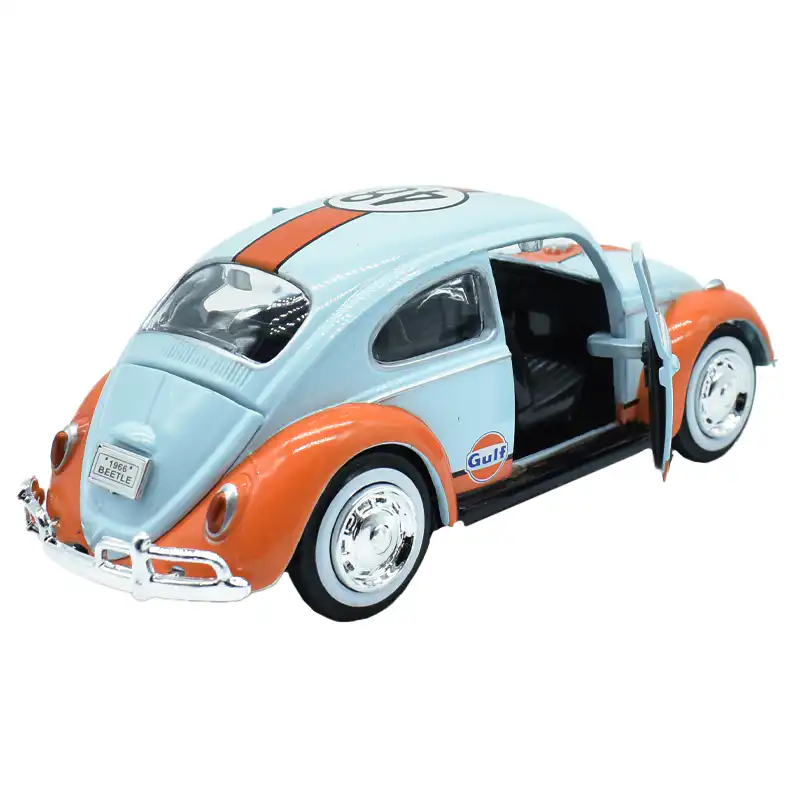 VW Beetle Vocho clásico 1966 de Edición Especial “Gulf” hecho por la marca Motor Max. Este modelo de auto a escala fabricado en alta calidad tiene puertas y tapa de motor que se abren, llantas de goma y es perfecto para coleccionistas y fanáticos de Volkswagen.