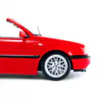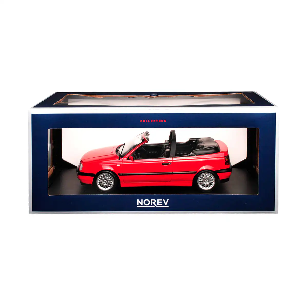 VW Golf Cabriolet 1995 Caribe en color rojo de Edición Especial “Collectors” hecho por la marca Norev. Este modelo de auto a escala fabricado en alta calidad tiene llantas de goma y es perfecto para coleccionistas y fanáticos de Volkswagen.