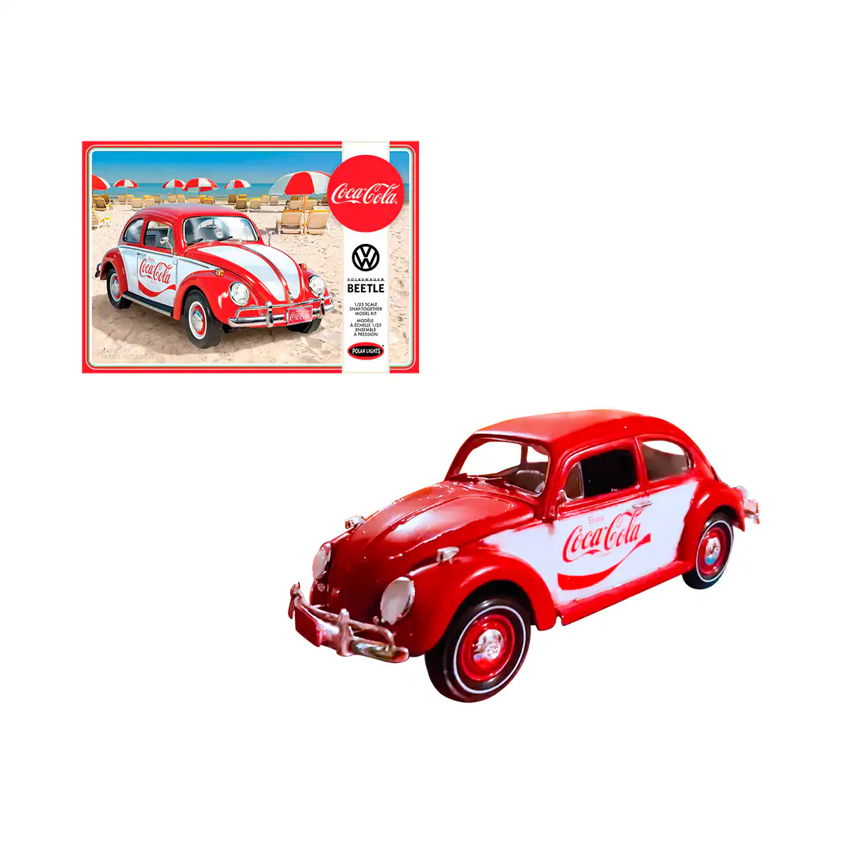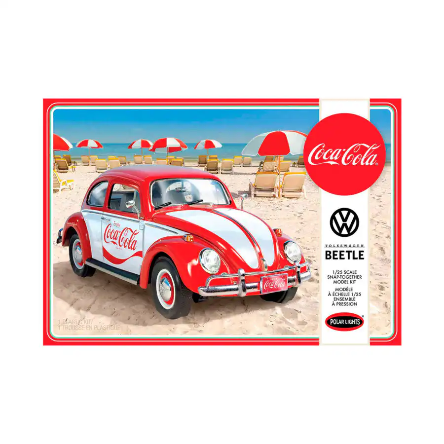 VW Beetle Vocho para armar de Edición Especial “Coca Cola” hecho por la marca AMT. Este modelo de auto a escala fabricado en alta calidad tiene llantas de vinilo, abre cofre y cajuela, 4 tipos de rines, calcomanías originales y es perfecto para coleccionistas y fanáticos de Volkswagen.