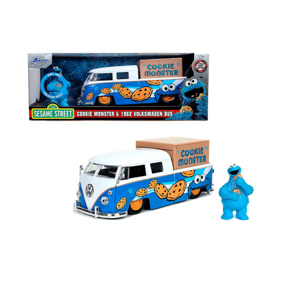 VW Combi Bus de Edición Especial “Cookie Monster” hecho por la marca Jada Toys. Este modelo de auto a escala fabricado en alta calidad tiene puertas y cajita que se abren, incluye una figura coleccionable del come galletas, llantas de goma y ​​es perfecto para coleccionistas y fanáticos de Plaza Sésamo.